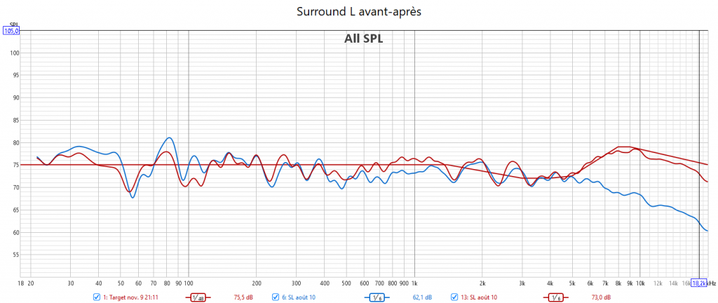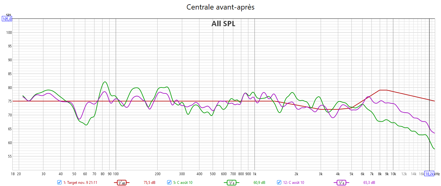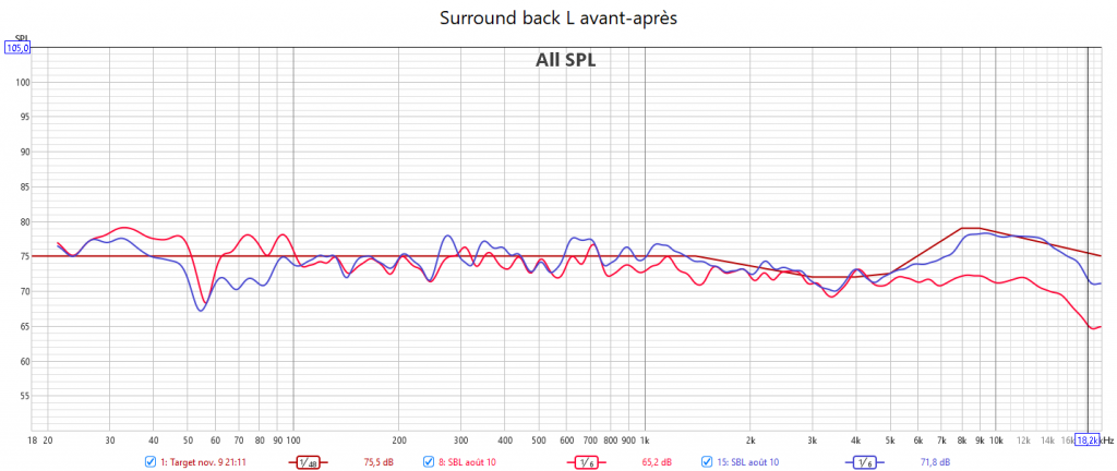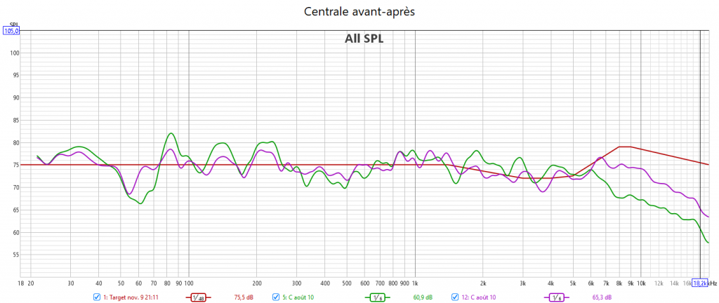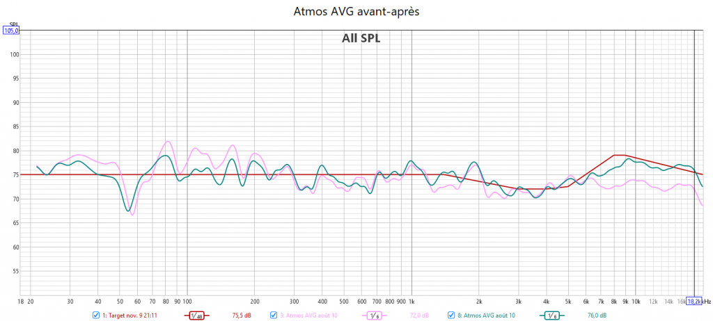 Après le calibrage de l’Anthem AVM70 avec ARC, J’ai obtenu une meilleure réponse du LFE. Le nœud acoustique à 56 Hz est moins prononcé. Noeud que n’a pas le clos. Il n’est pas à la même position que le bass-reflex. Il n’y a plus de pic à 80 Hz. L’infra est plus linéaire. Pour les autres canaux, leur réponse est au plus proche de la courbe cible extrapolée des courbes isosoniques pour prendre en compte la sensibilité de l’oreille, garantissant clarté et détails sans agressivité.