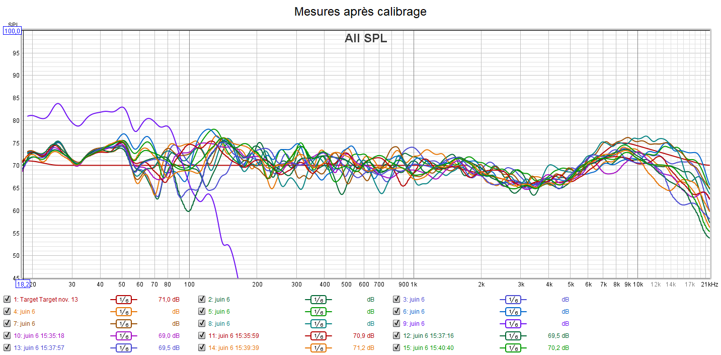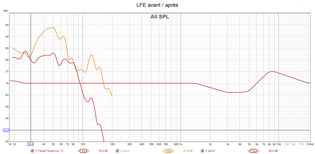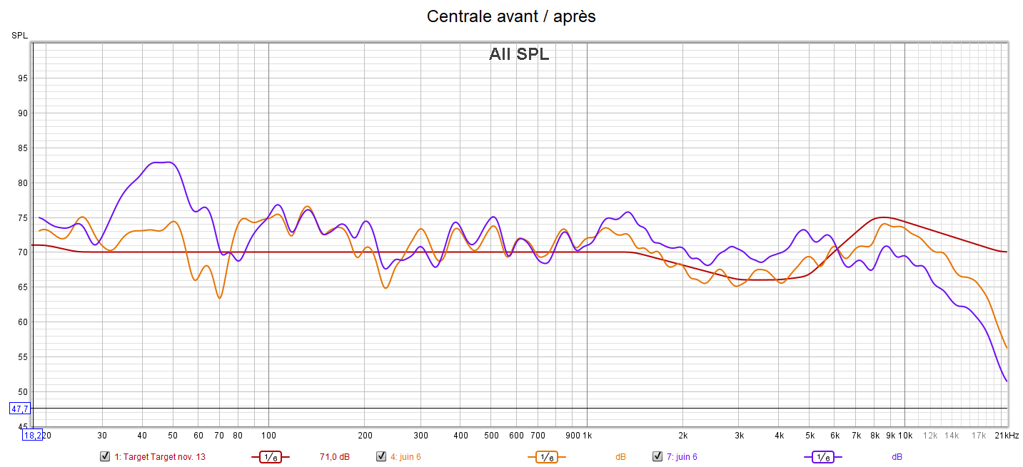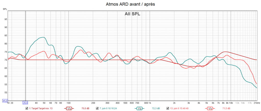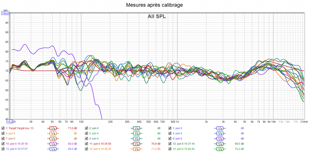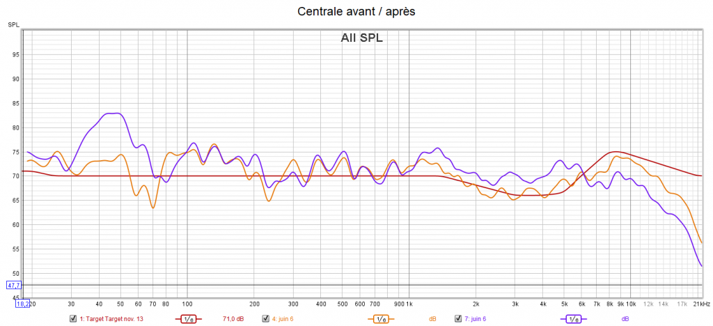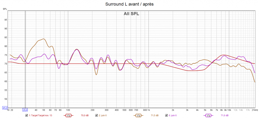 Après calibrage qui prend en compte la sensibilité de l’oreille suivant les courbes isosoniques Fletcher et Munson pour une application home cinéma, le résultat obtenu est meilleur qu’espéré. Parce que ARC Genesis est assez restreint dans le travail de sa courbe cible. Il faut faire preuve d’astuce pour obtenir la courbe que j’ai obtenu et prendre le temps d’ajuster parce que je peux vous assurer qu’entre les courbes théoriques annoncées par ARC Genesis et les courbes mesurées, il y a une grande différence… J’aligne le niveau sonore de chaque canal. J’obtient des courbes qui se suivent vraiment de près jusqu’à 10 kHz. Les réponses sont homogènes entre toutes les enceintes, même niveau sonore, meilleure bulle sonore. Le son gagne en clarté, en détails et en précision dans les effets sonores. La réponse dans le grave est bien plus lisse. Effectivement, le pic entre 35 et 60 Hz a disparu. Le grave devient propre et cohérent avec les autres enceintes. Aucune agressivité même si on monte le son.