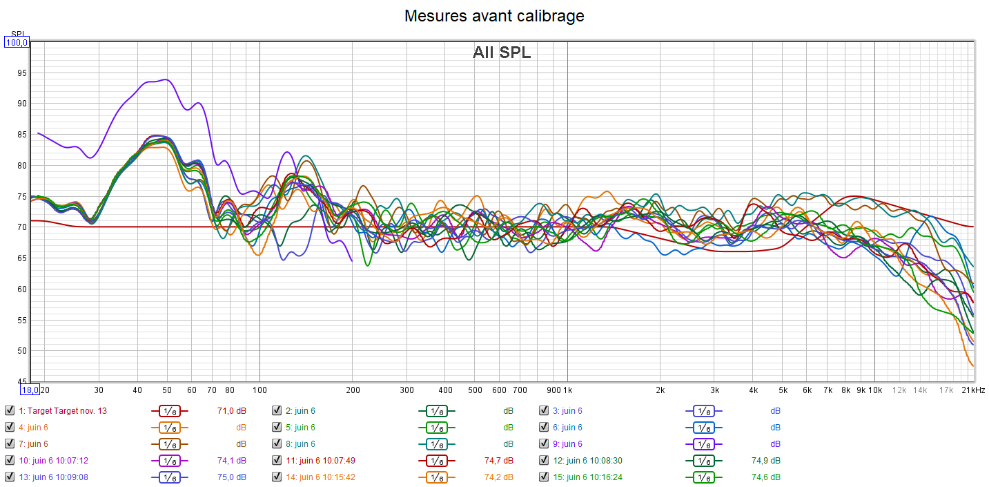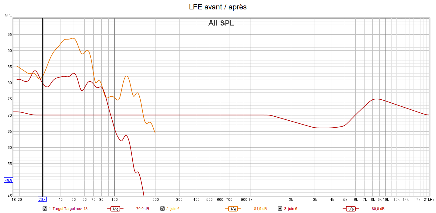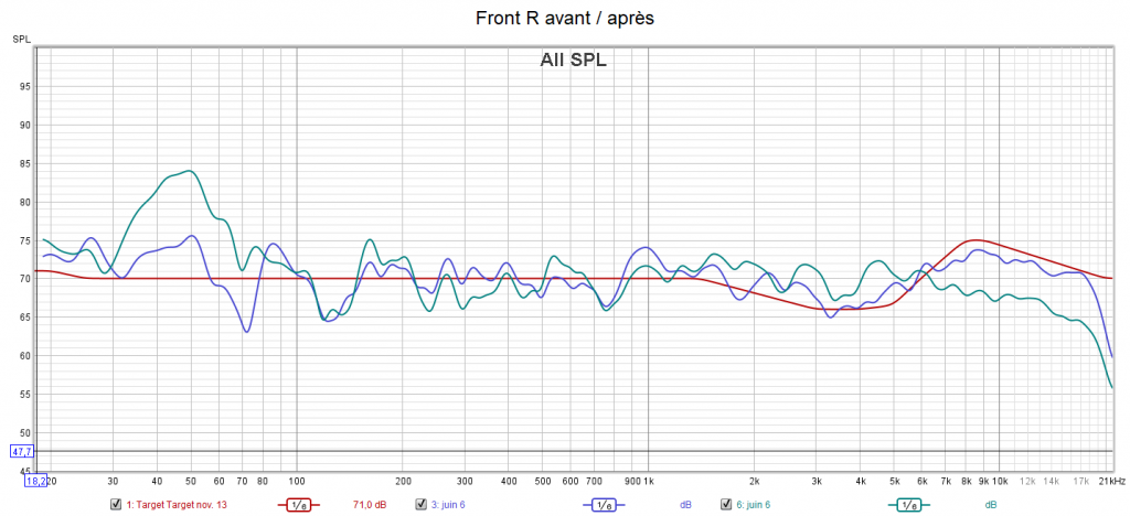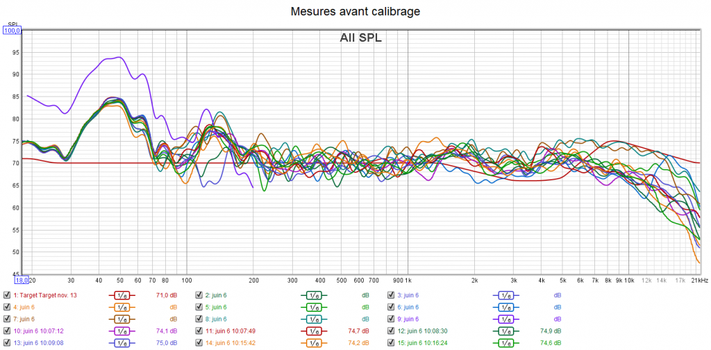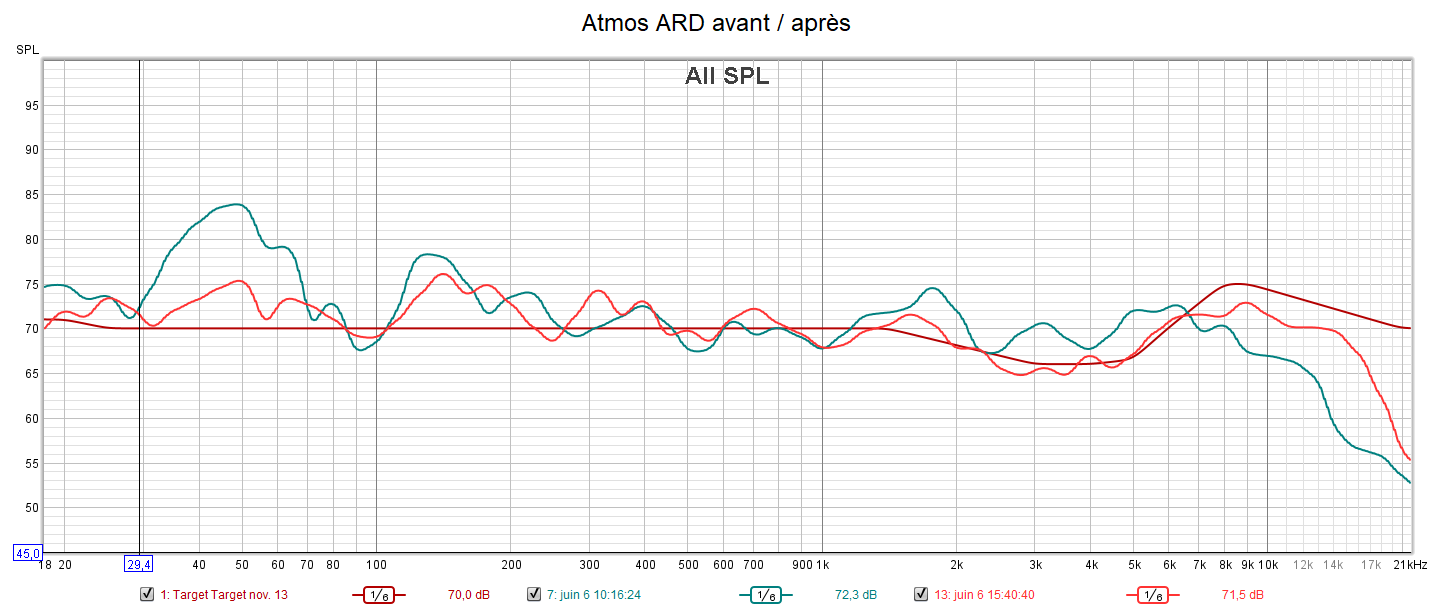 Après calibrage qui prend en compte la sensibilité de l’oreille suivant les courbes isosoniques Fletcher et Munson pour une application home cinéma, le résultat obtenu est meilleur qu’espéré. Parce que ARC Genesis est assez restreint dans le travail de sa courbe cible. Il faut faire preuve d’astuce pour obtenir la courbe que j’ai obtenu et prendre le temps d’ajuster parce que je peux vous assurer qu’entre les courbes théoriques annoncées par ARC Genesis et les courbes mesurées, il y a une grande différence… J’aligne le niveau sonore de chaque canal. J’obtient des courbes qui se suivent vraiment de près jusqu’à 10 kHz. Les réponses sont homogènes entre toutes les enceintes, même niveau sonore, meilleure bulle sonore. Le son gagne en clarté, en détails et en précision dans les effets sonores. La réponse dans le grave est bien plus lisse. Effectivement, le pic entre 35 et 60 Hz a disparu. Le grave devient propre et cohérent avec les autres enceintes. Aucune agressivité même si on monte le son.