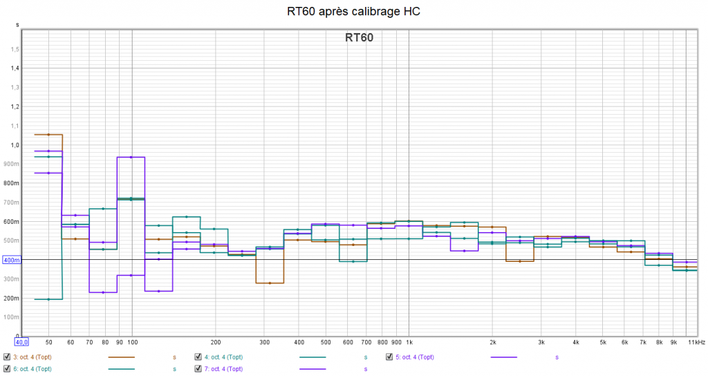L’acoustique de la pièce se mesure avec le RT60 (réverbération) : il est un peu haut, situé à 600 millisecondes. Il ne faudrait pas dépasser 400 ms. Cela impacte également les mesures du temps groupe. C’est un axe d’amélioration à prévoir. Trop de réverbération brouille la spatialisation et la précision de la localisation des effets sonores.