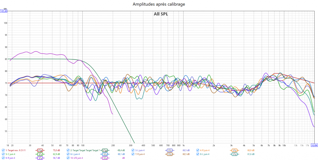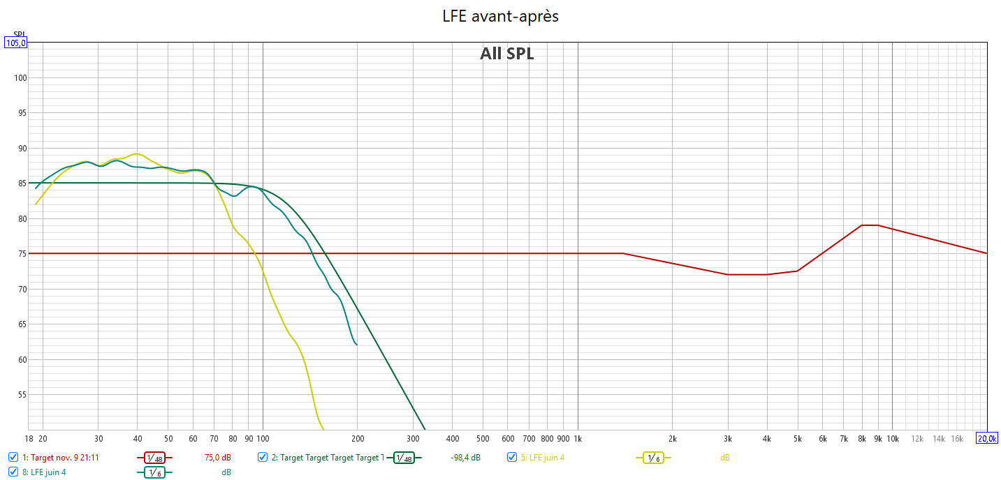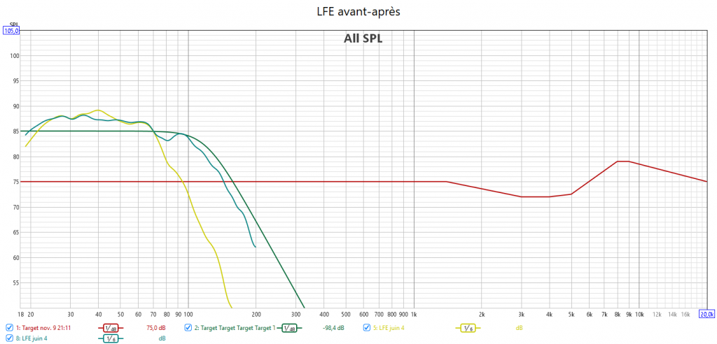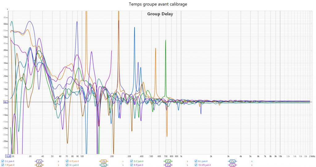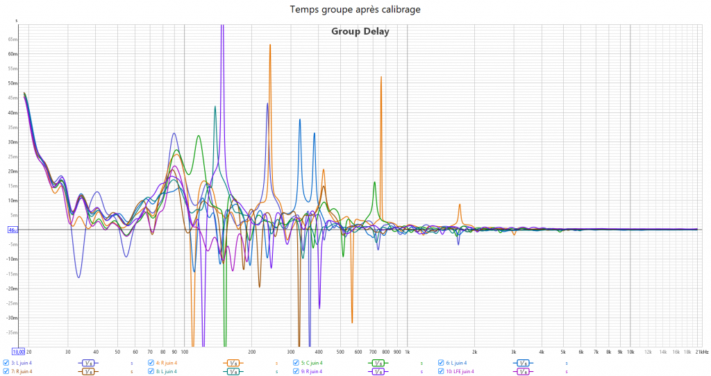 Après calibrage, J’ai récupéré le maximum de retard de groupe du LFE. Cela se voit sur les relevés avec une bien meilleure gestion du grave en ayant une seule source principale : le LFE. Pour cela le bass management est obligatoire. Toutes les enceintes sont en petite.