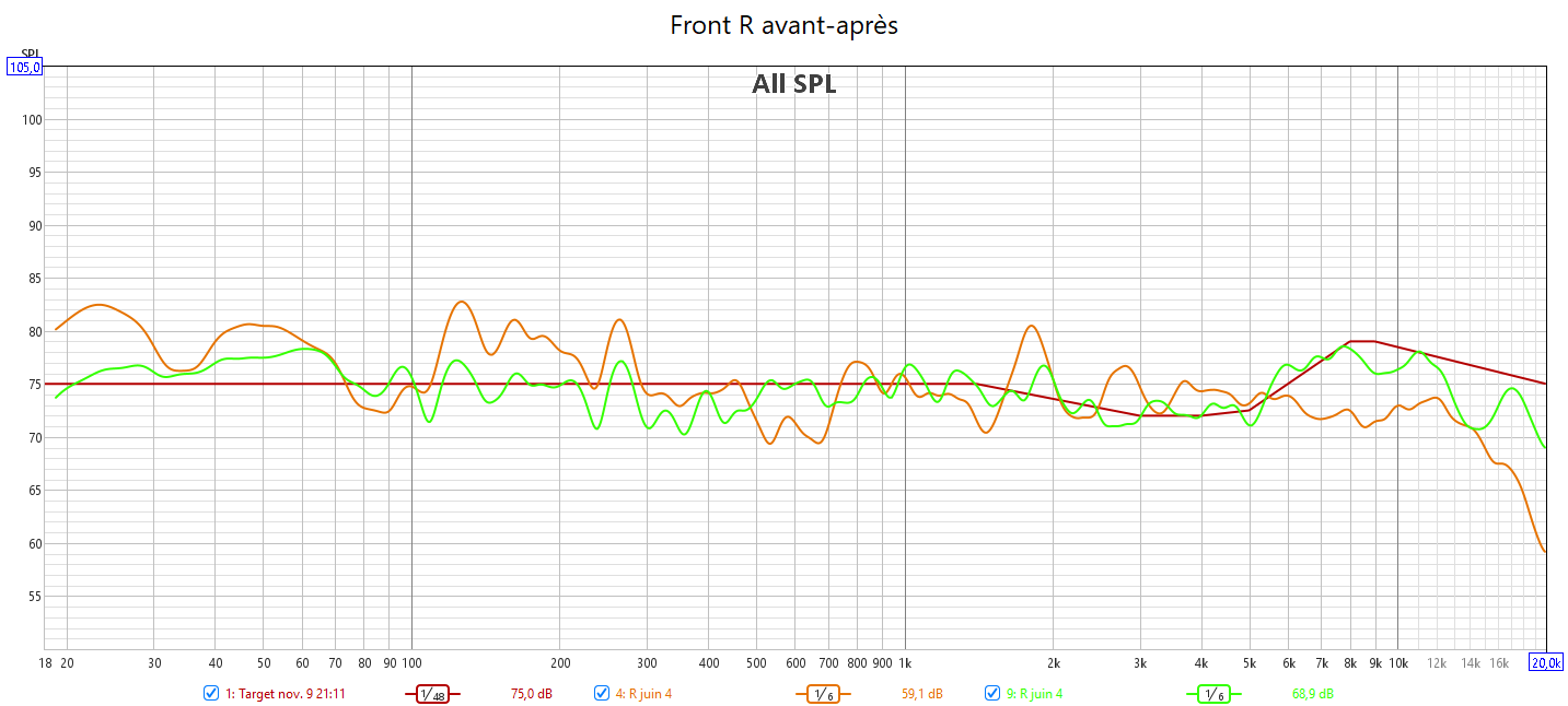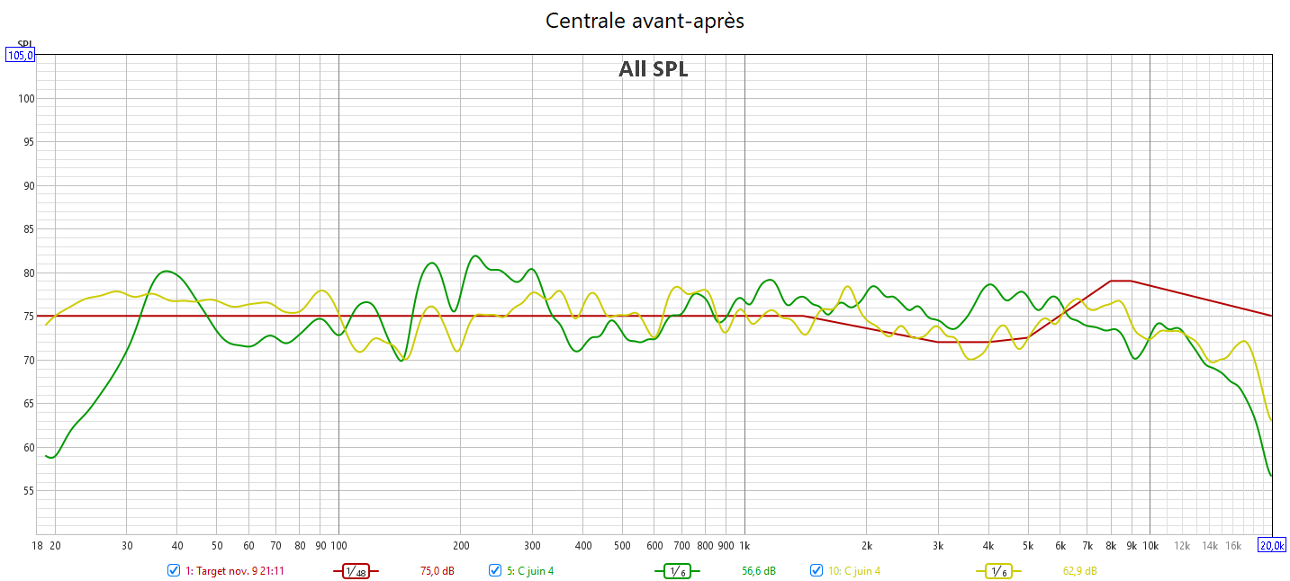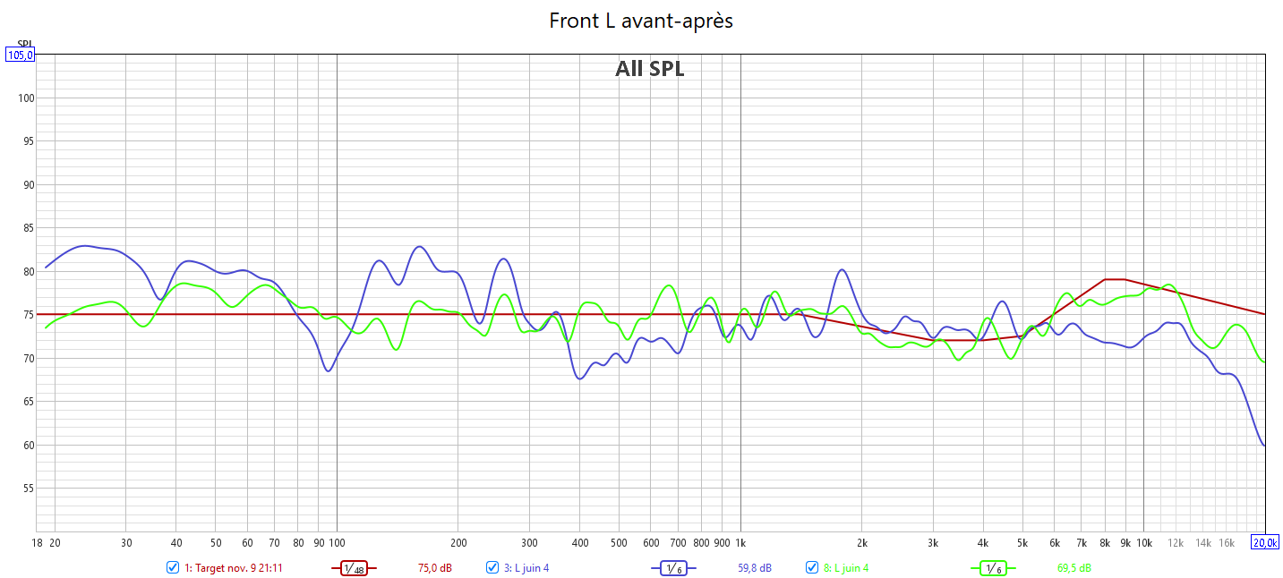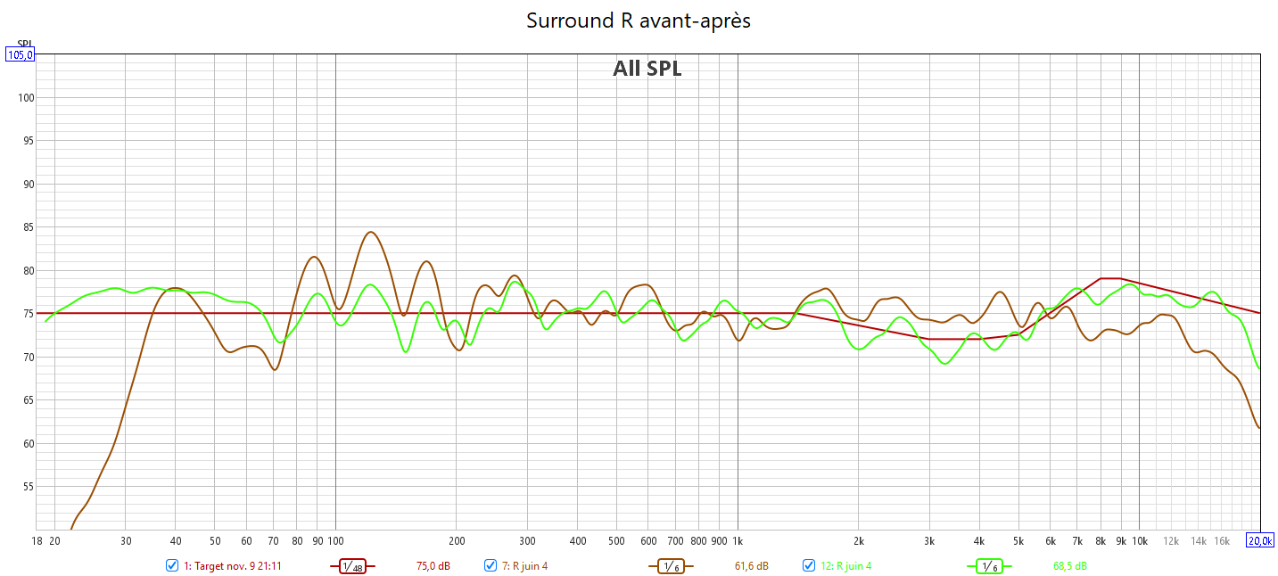 Après calibrage, J’ai récupéré le maximum de retard de groupe du LFE. Cela se voit sur les relevés avec une bien meilleure gestion du grave en ayant une seule source principale : le LFE. Pour cela le bass management est obligatoire. Toutes les enceintes sont en petite.