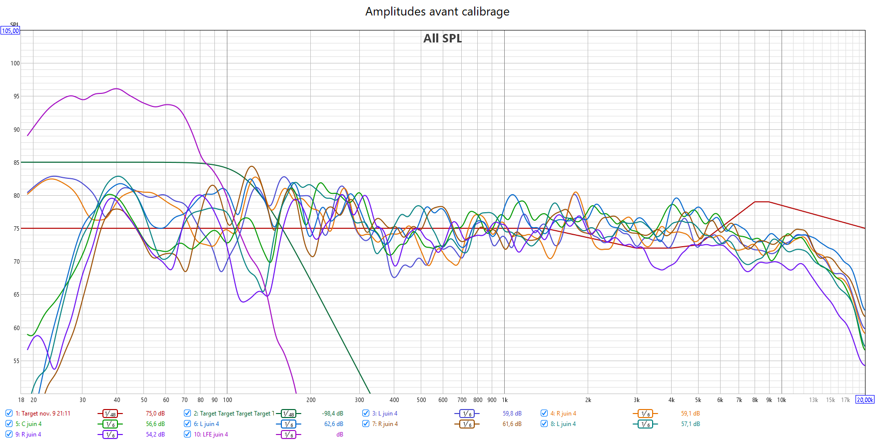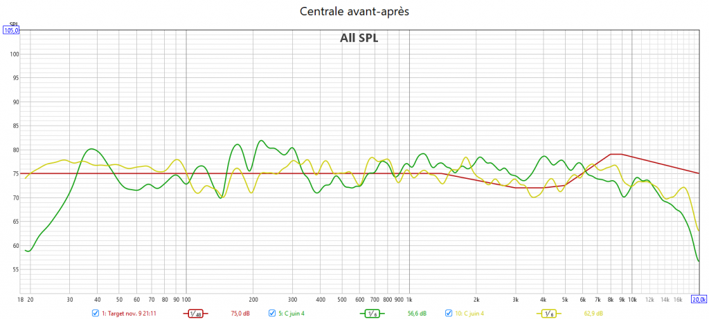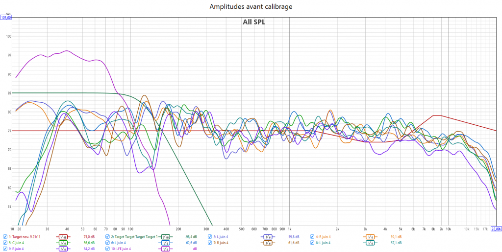 Avant calibrage, toutes les enceintes sont en grande est voici le résultat : cela donne un gros désordre dans le grave aussi bien en amplitude qu’en temporel. Sans parler des problèmes de phase entre enceintes et caisson aux crossover.