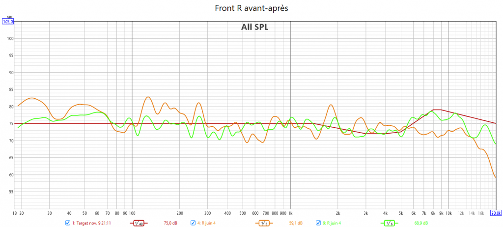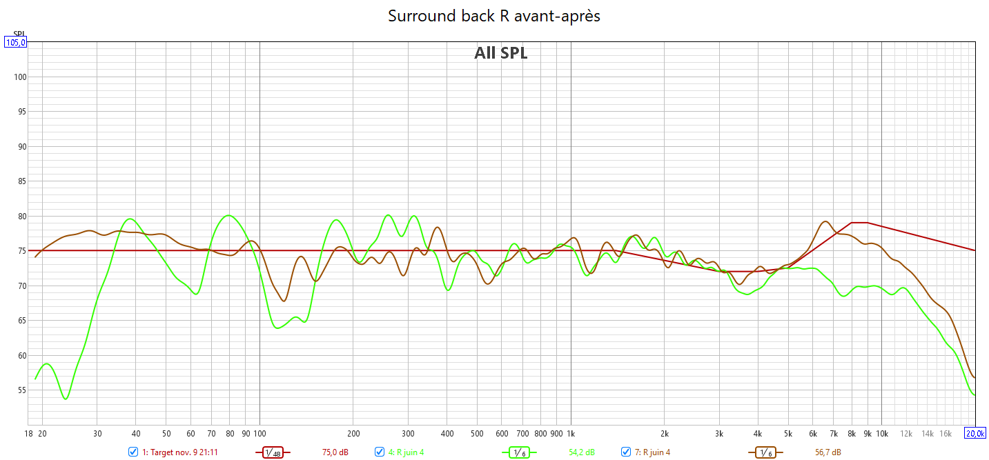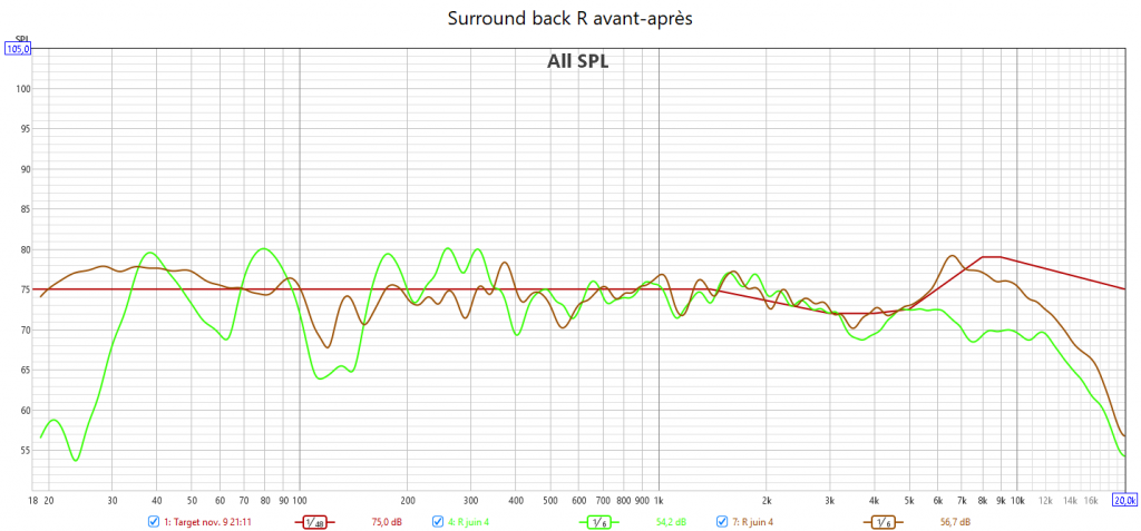 Ci-dessous la correction en amplitude avec ARC Genesis des frontales gauche et droite, la centrale, la surround droite, la surround arrière droite et le LFE qui gagne en bande passante.