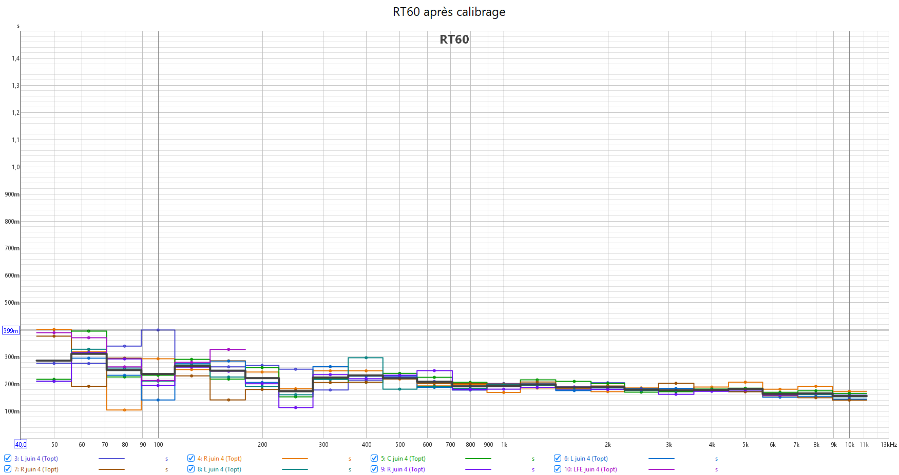 L’acoustique de la pièce est très bonne avec un RT60 bien en dessous des 400 ms sur toute la bande audible. Le médium / aigu est à 200 ms. Bon travail de MCCM Mon Ciné Chez Moi.