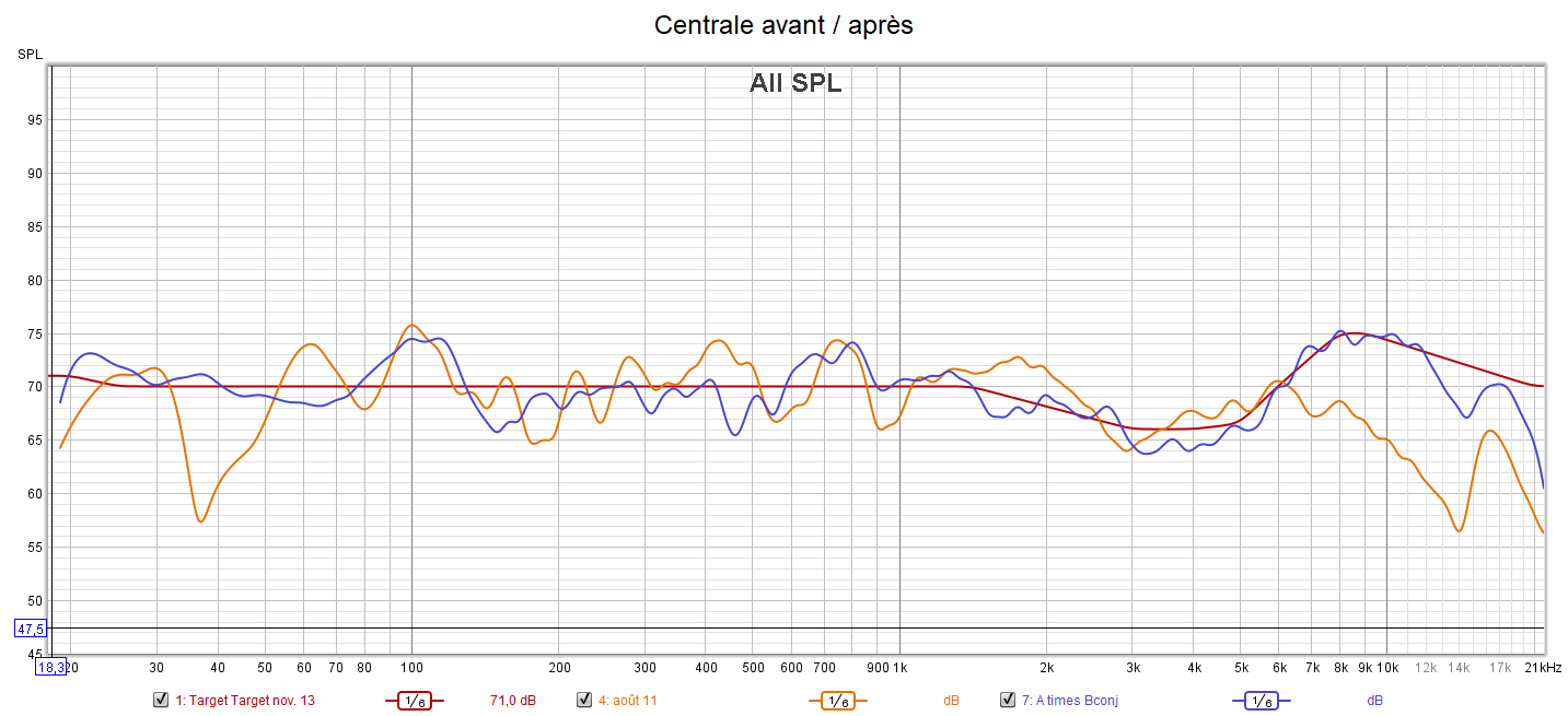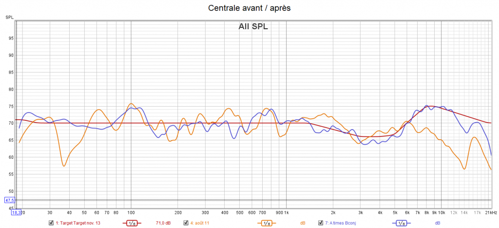 L’Arcam n’avait aucun calibrage Dirac de mémorisé. Le client a juste renseigné les distances et ajusté les niveaux sonores au sonomètre. Même avec cela, on constate que rien n’est en place sur les mesures avant calibrage. A l’écoute, on manquait grandement de clarté et de précision. Aucune courbe ne se suit. Le grave a un creux de plus de 10dB. Il sera constaté que les caissons étaient tout bonnement en opposition de phase. La rectification est faite. Un calibrage 3 points Dirac est lancé. J’effectue la modification et l’ajustement de la courbe cible pour prendre en compte la sensibilité de l’oreille suivant une extrapolation des courbes isosoniques de Fletcher et Munson.
