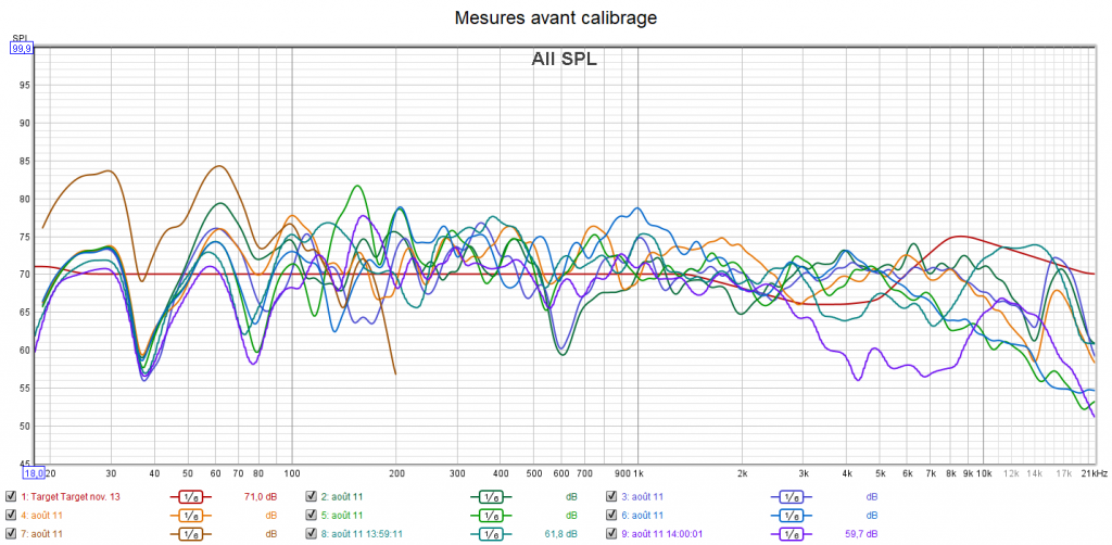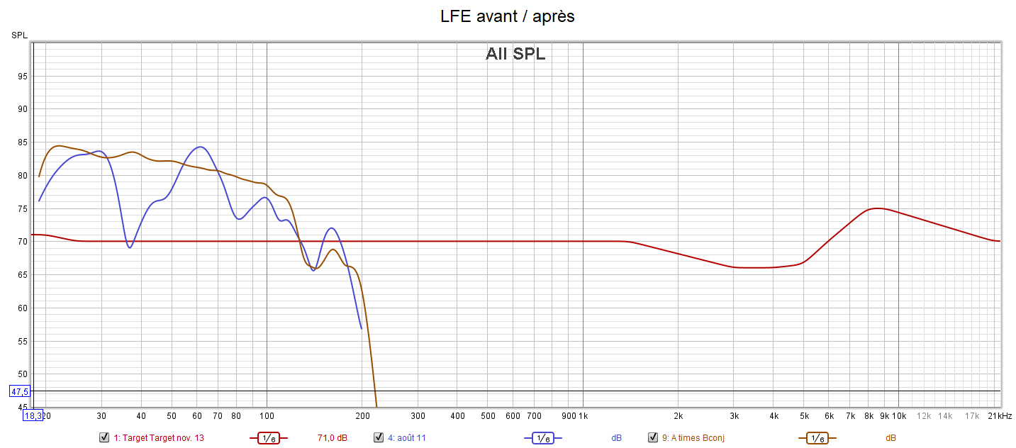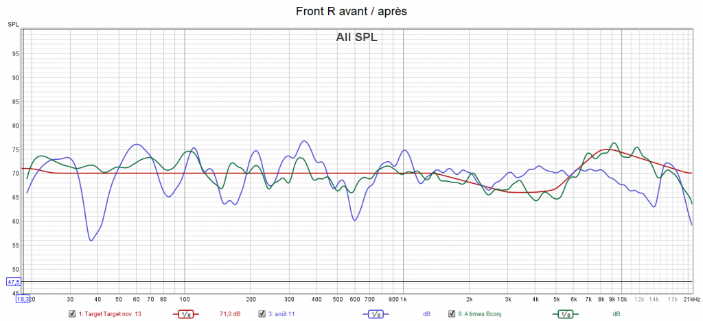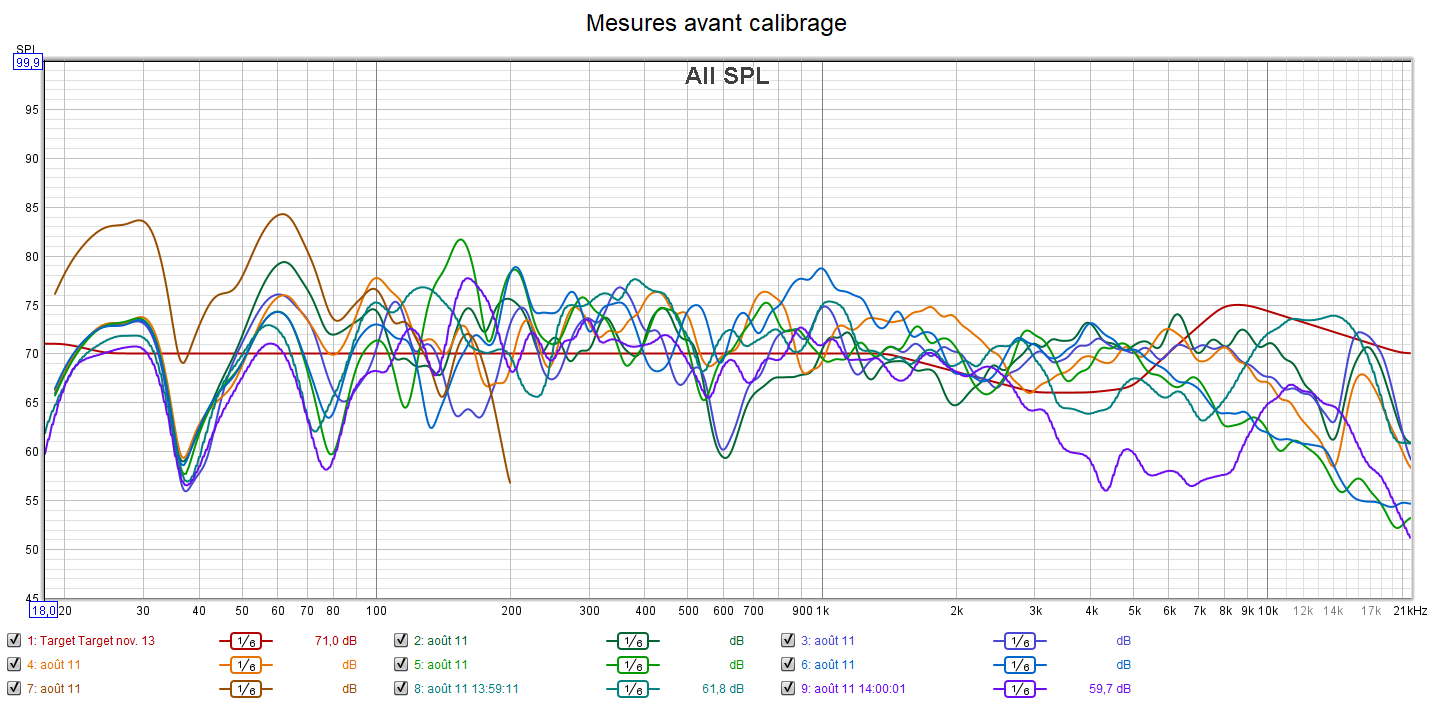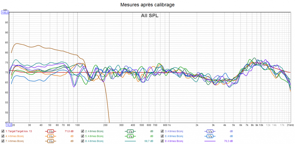 Après calibrage, on obtient une réponse linéaire et stable du grave. On le ressent mieux physiquement. Après ajustement des niveaux sonores, on voit que toutes les mesures suivent la nouvelle courbe cible. Cela va créer une bonne homogénéité et un bon équilibre de la bulle sonore.
