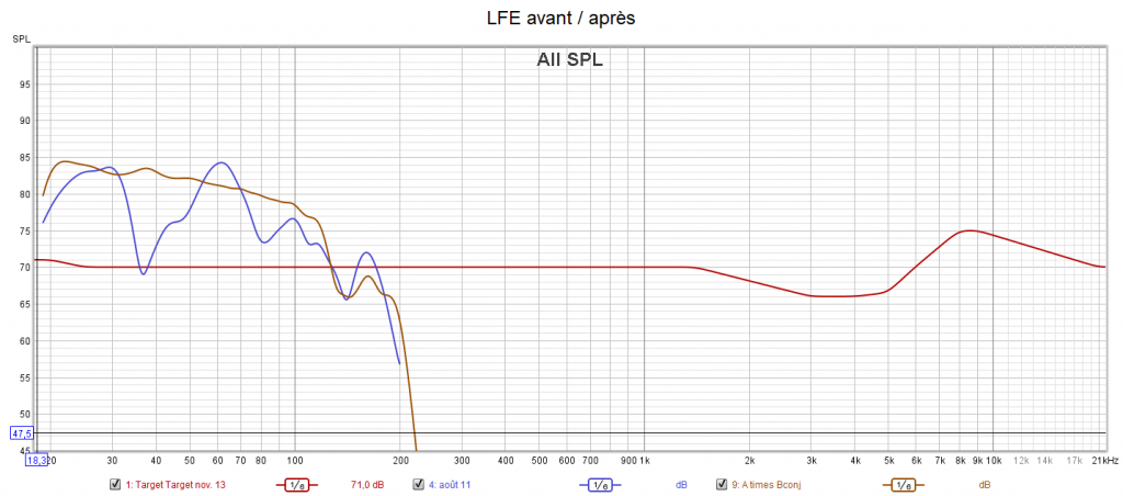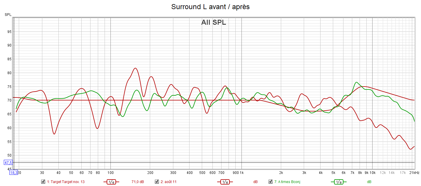 Ci-dessous la correction de la frontale droite, la centrale, la surround gauche et le LFE. Les mesures parlent d’elles-mêmes : des corrections à 6-7-8-9 voir 10 dB sur certaine fréquences, soyez sûr que ça s’entend.