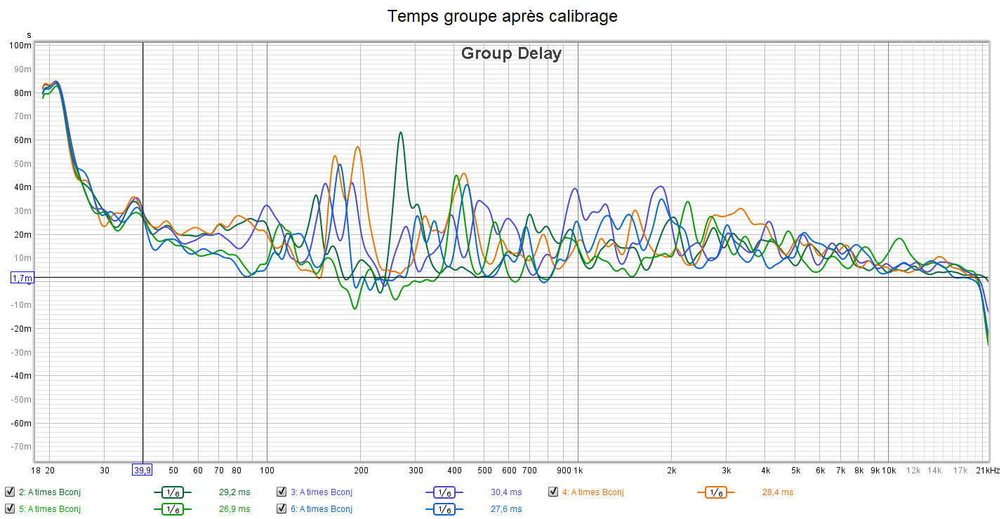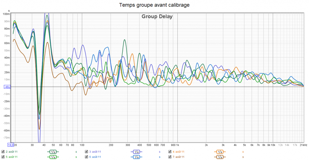 Avant calibrage, on constate de gros problèmes temporels pour le grave dans les relevés des temps groupes. Il y a trop de fluctuations là où on devrait avoir quelque chose de droit et stable. Les caissons était en opposition de phase.
