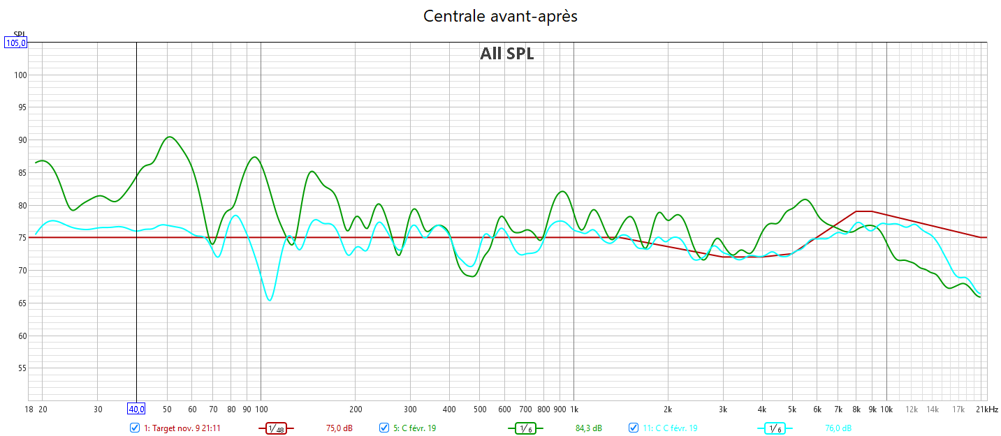 Ci-dessous la correction en amplitude avec Dirac de la frontale gauche, la frontale droite, la centrale et le LFE. L’excès à 5 kHz sur toute la scène frontale donnait de l’agressivité au rendu. Chose rare avec des Focal. Cela a été corrigé.