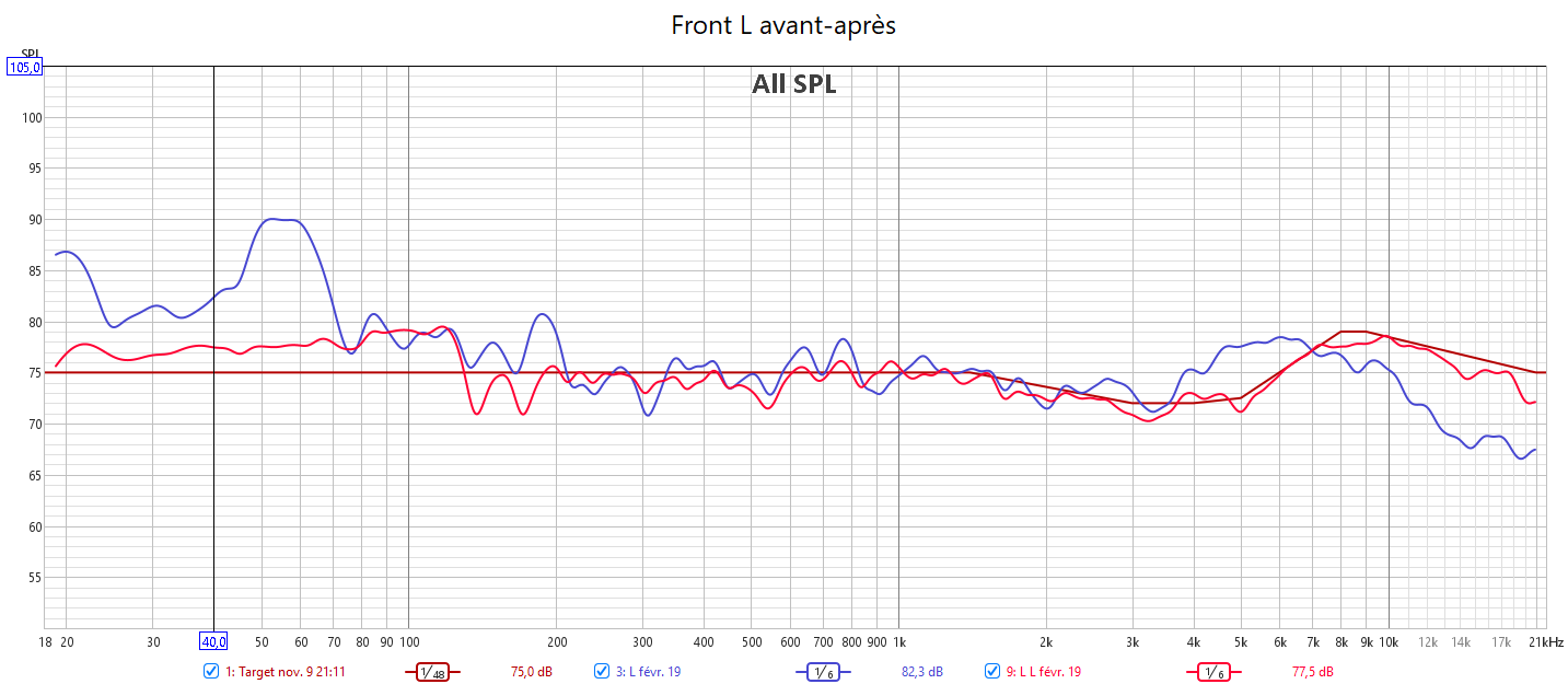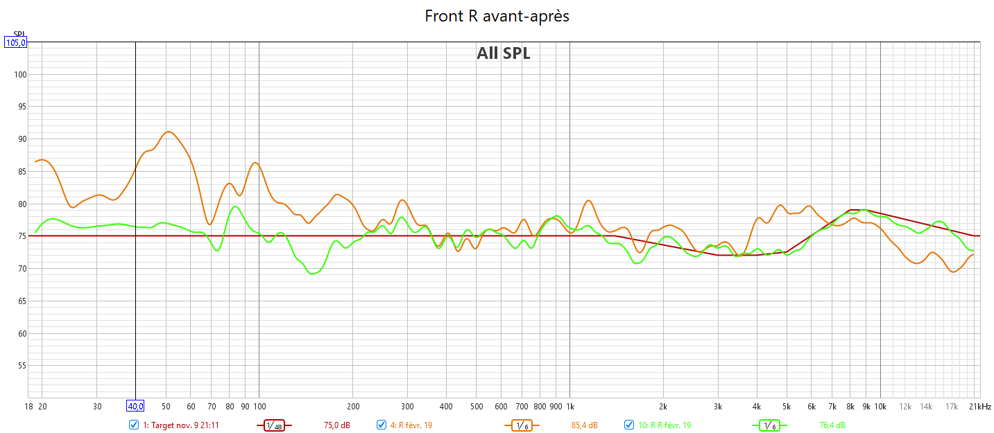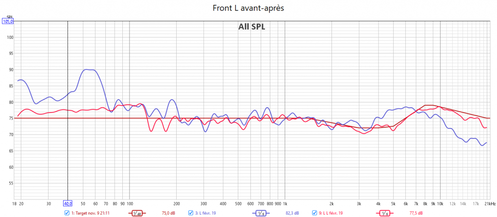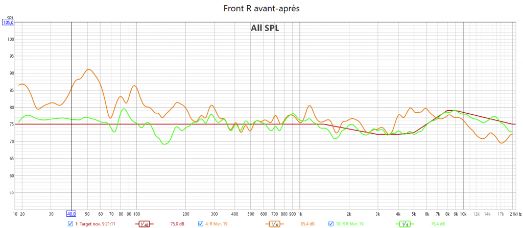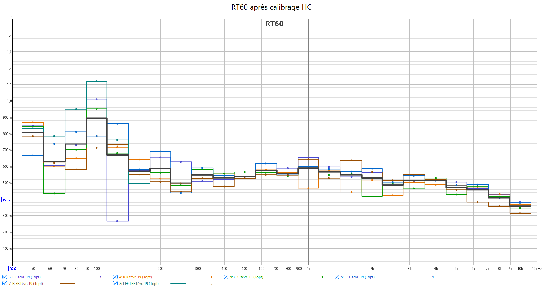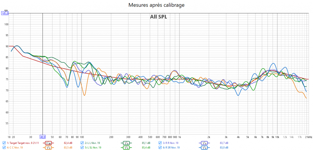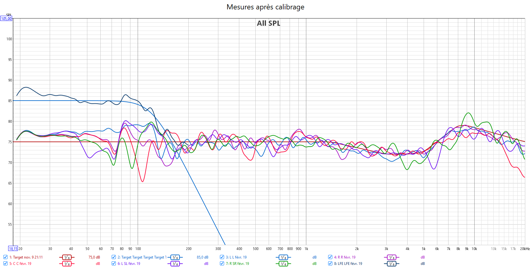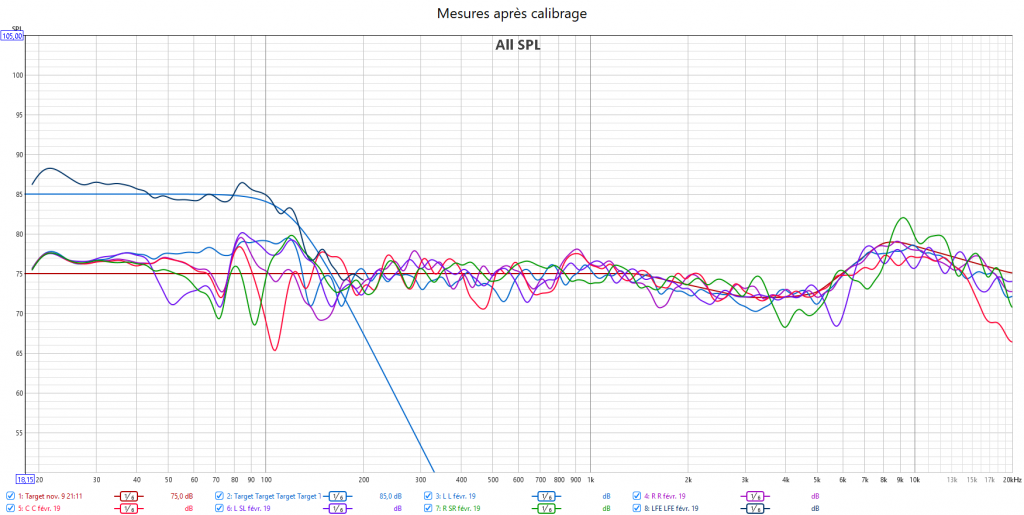 Après calibrage HiFi : Toutes les réponses collent à la nouvelle courbe cible HiFi. On garde des niveaux homogènes pour l’équilibre d’écoute. Le calage temporel est toujours bon. La scène frontale est la plus optimisée concernant la mise en phase avec le caisson. Normal, la scène frontale est la priorité.