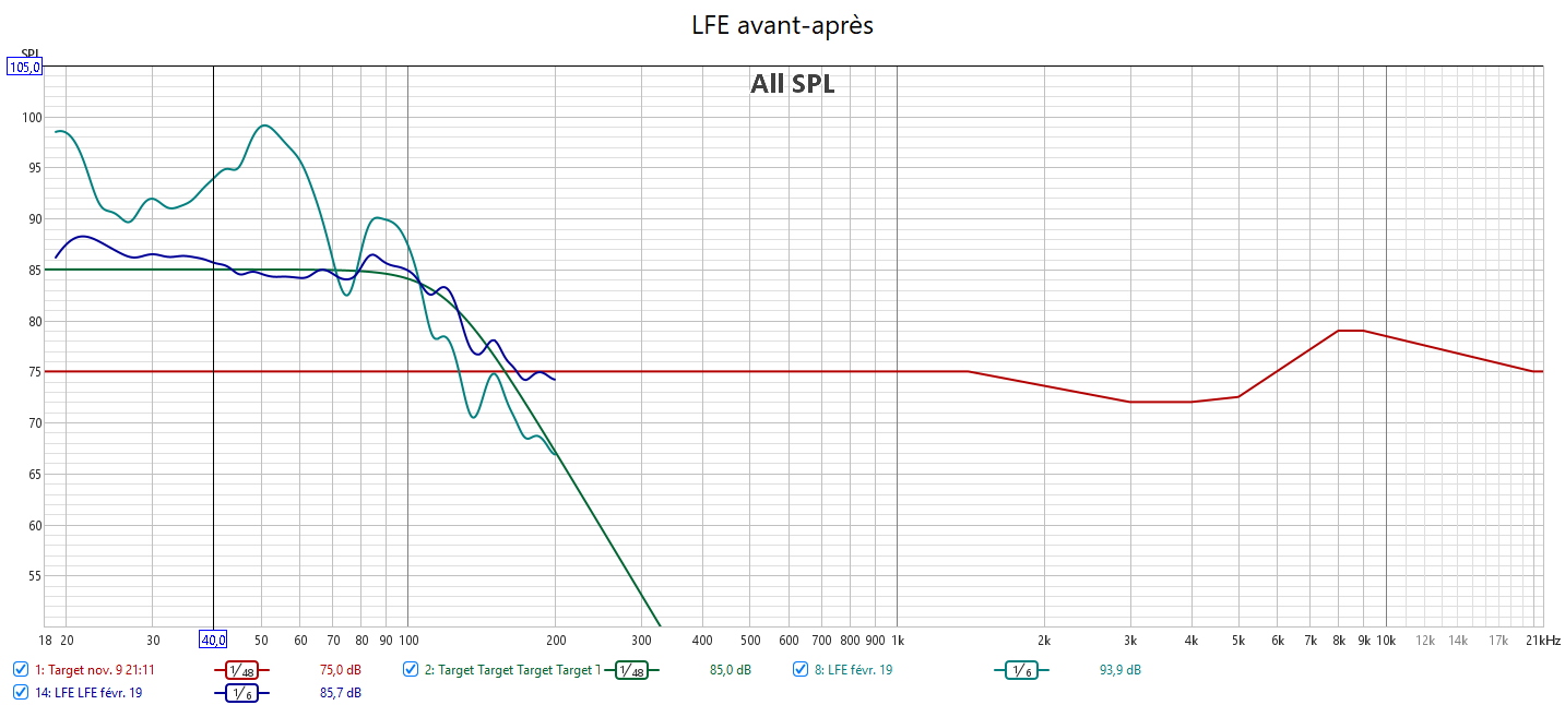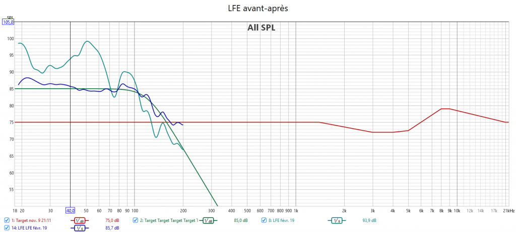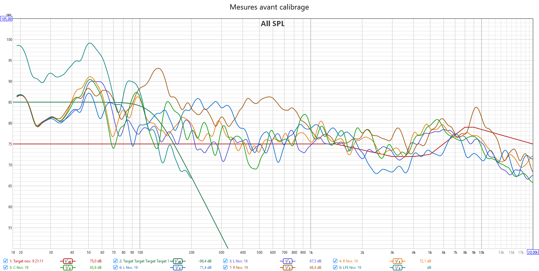 Avant calibrage HiFi 5.1: Je pars des mêmes mesures avec Dirac pour créer une configuration différente principalement pour le grave. La courbe cible est différente. Il faut du gain dans le grave comme l’indique la courbe cible « HiFi ». Cela nécessite donc plus de niveau sonore pour le caisson.