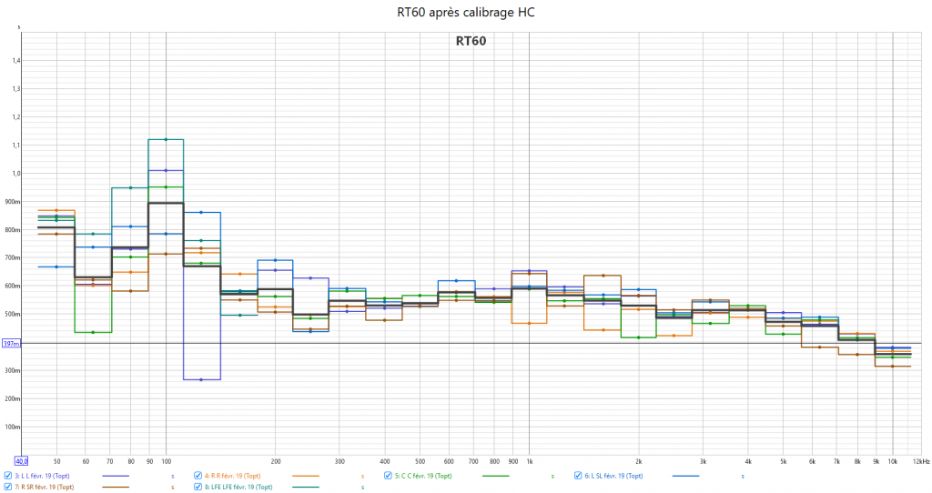 Pour l’acoustique, le RT60 est toujours au alentour des 600 ms si on fait abstraction du grave qui remonte un peu. C’est souvent le même constat, mais le grave est difficile à traiter, surtout en pièce de vie.