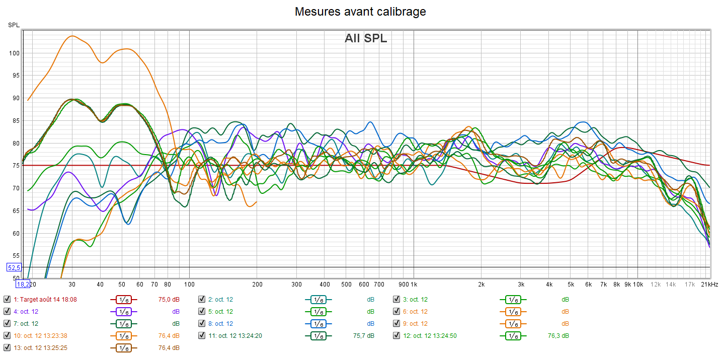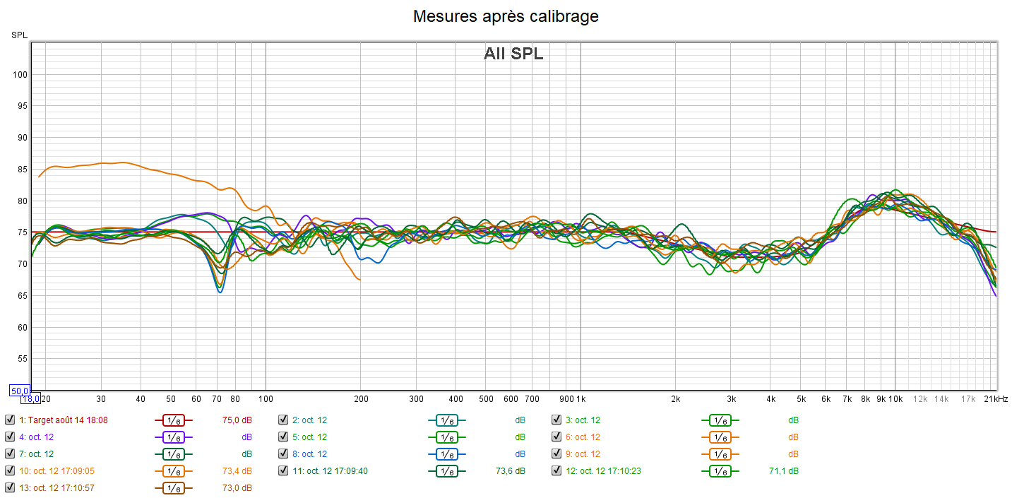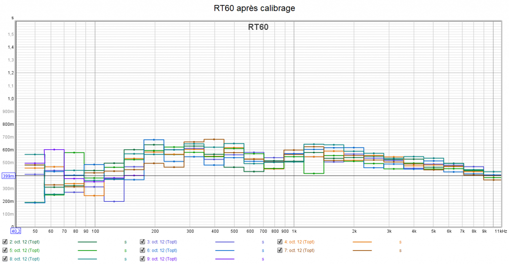 L’acoustique de la pièce se mesure avec le RT60 (temps de réverbération). On est ici de l’ordre de 600 millisecondes. On est un peu moins élevé dans l’extrême aigu et le grave, vers les 500 ms. Il ne faudrait pas dépasser 400 ms pour bien faire, mais en pièce de vie ce n’est pas toujours facile de traiter. L’acoustique se répercute sur les courbes de temps groupe qui doivent être les plus plates possibles.