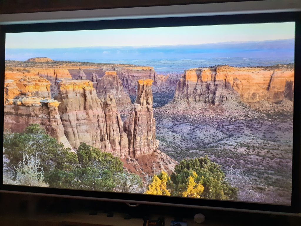 Calibrage image SDR/HDR VP BenQ W2710i en pièce de vie sur toile blanche Lumene 240C 1.0. 𝗔𝘁𝘁𝗲𝗻𝘁𝗶𝗼𝗻 𝗮̀ 𝗹𝗮 𝗰𝗹𝗮𝗿𝘁𝗲́ 𝗱𝗲 𝗹𝗮 𝗽𝗶𝗲̀𝗰𝗲 𝗾𝘂𝗶 𝗳𝗮𝗶𝘁 𝗽𝗲𝗿𝗱𝗿𝗲 𝗲𝗻 𝗰𝗼𝗻𝘁𝗿𝗮𝘀𝘁𝗲 (𝗱𝗲́𝗴𝗿𝗮𝗱𝗮𝘁𝗶𝗼𝗻 𝗱𝗲𝘀 𝗻𝗼𝗶𝗿𝘀) 𝗽𝗮𝗿 𝗿𝗲́𝗳𝗹𝗲𝘅𝗶𝗼𝗻 𝗱𝗲 𝗹𝗮 𝗹𝘂𝗺𝗶𝗲̀𝗿𝗲 𝘀𝘂𝗿 𝗹𝗮 𝘁𝗼𝗶𝗹𝗲 𝗯𝗹𝗮𝗻𝗰𝗵𝗲. A défaut d’avoir pu choisir une toile technique grise qui nécessite un VP suffisamment lumineux, la première solution pour obscurcir au mieux la pièce serait d’utiliser des rideaux idéalement noir mat et épais, car on fait d’une pierre deux coups : on améliore également l’acoustique. Deuxième solution : moins simple à faire un pièce de vie, peindre les murs, au moins les surfaces les plus proches de la toile.