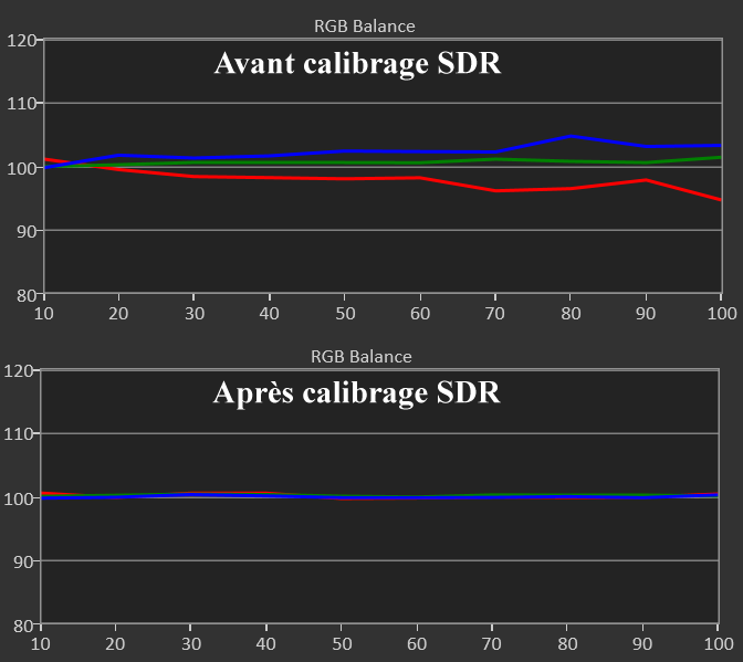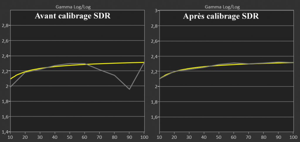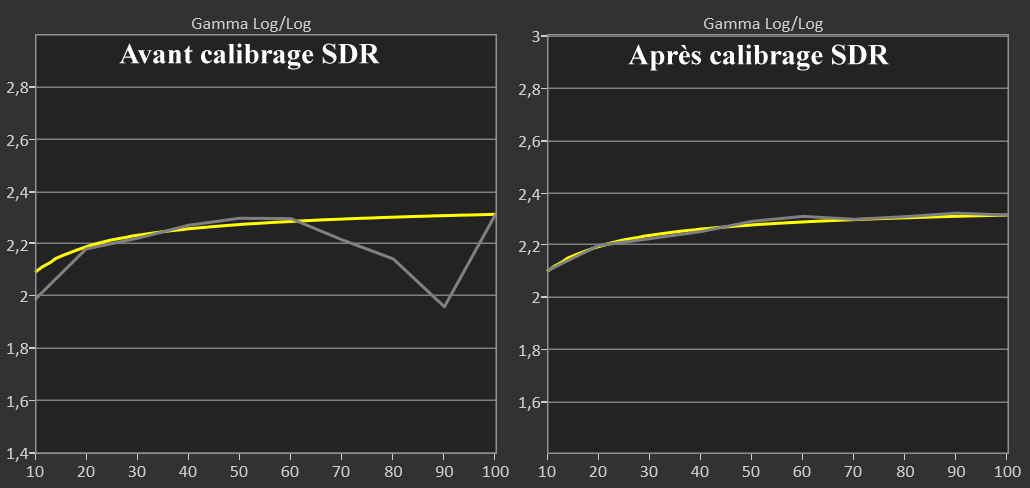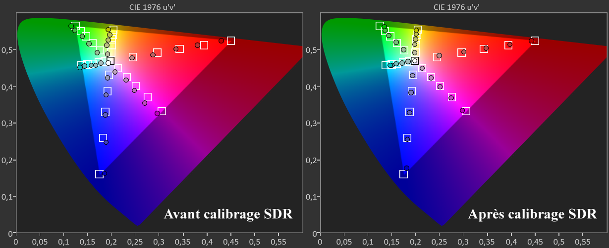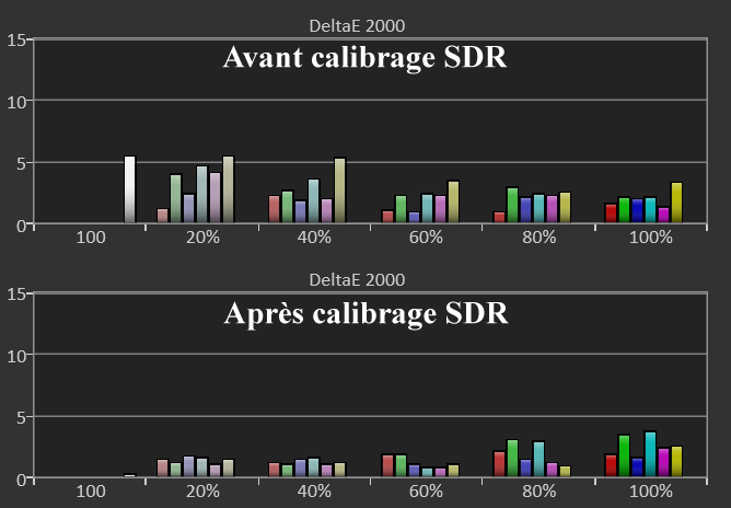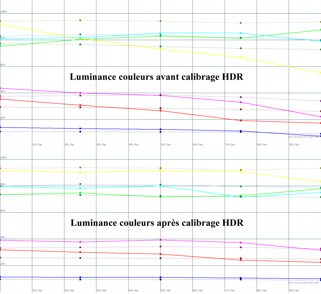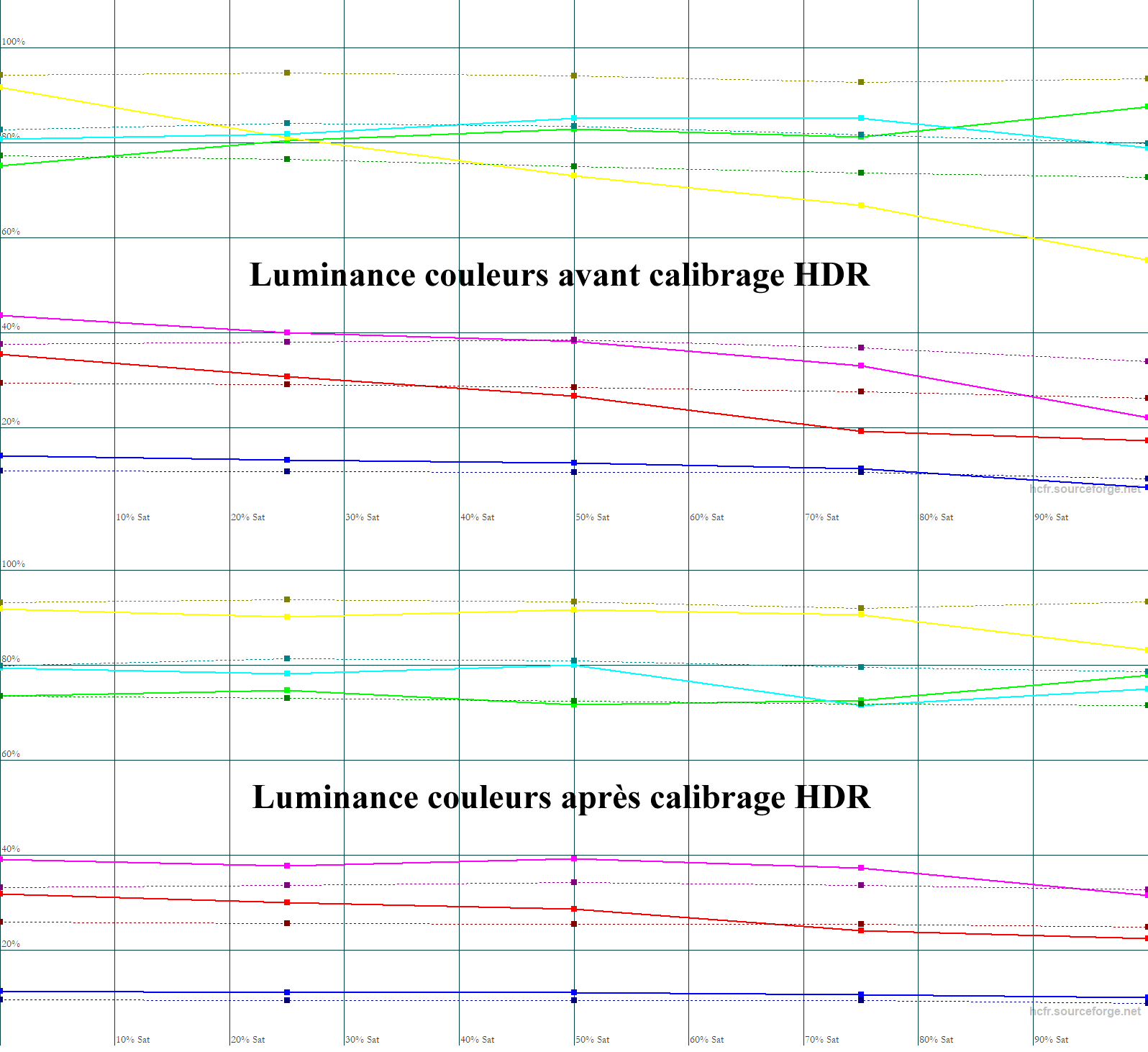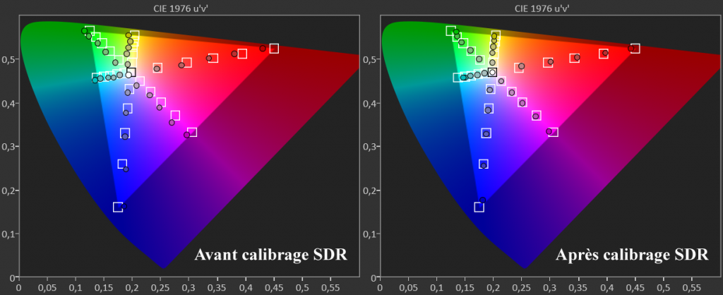 Après calibrage, toujours dans le BT709 de la norme SDR, quelques petits défauts de luminance empêchent d’avoir mieux, mais c’est déjà bien. Les couleurs donnent un delta E moy à 1,7 (max 3,7). Le delta E remonte dans les saturations, car le VP a du mal à maintenir la luminosité. Le ColorChecker donne un delta E moy à 1,9.