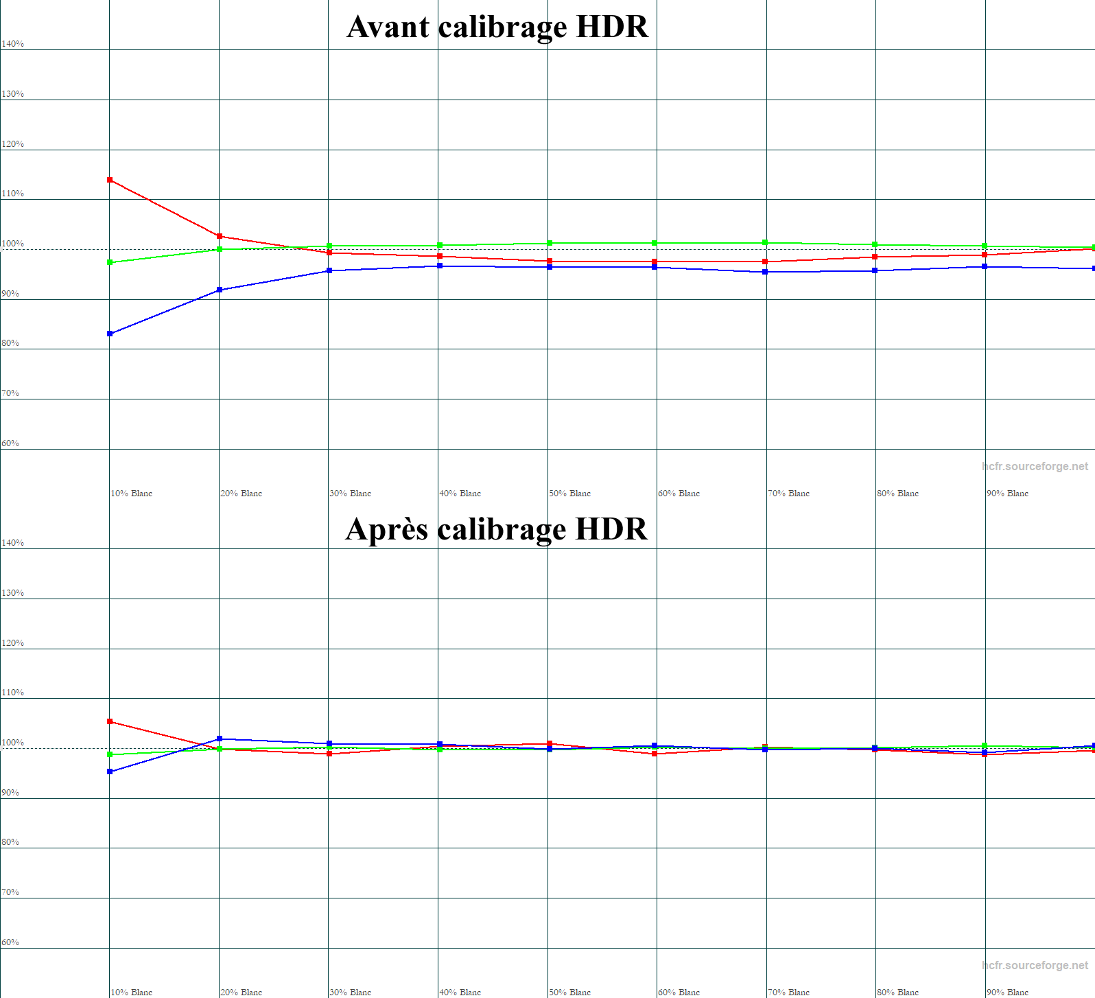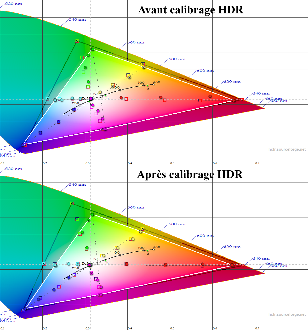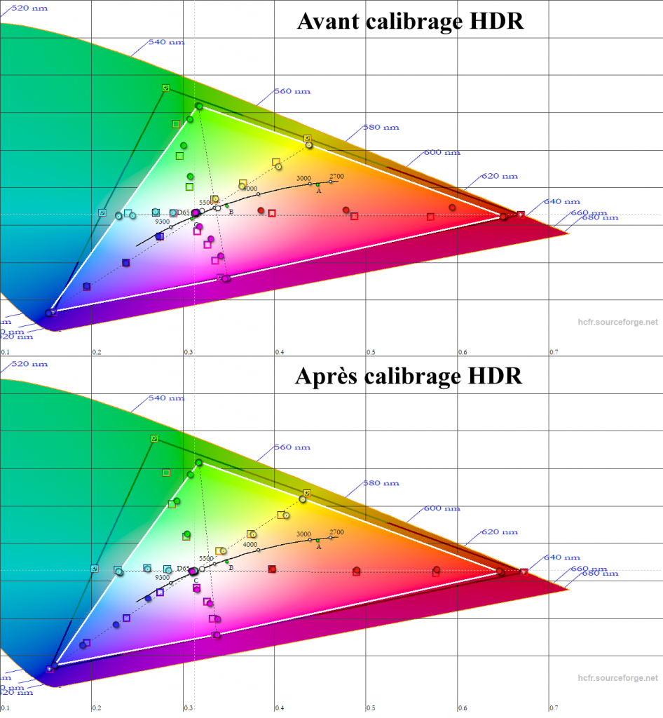 Après calibrage HDR, j’ai corrigé au max les couleurs pour obtenir un delta E moy à 1,9 sans pouvoir couvrir 100% du gamut DCI-P3. Les caractéristiques techniques du VP ne le permettent pas.