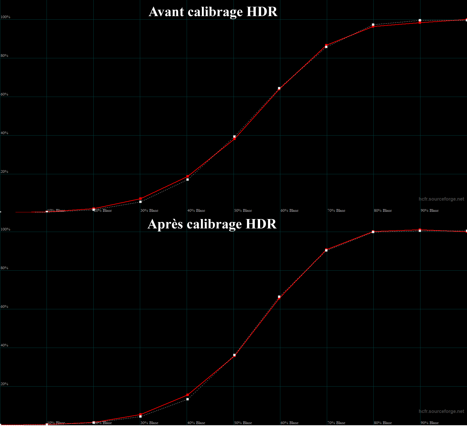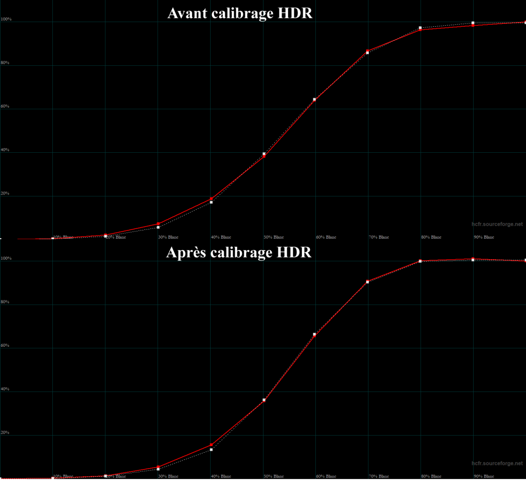 Après calibrage HDR, la correction du blanc fait perdre légèrement en luminosité sans grosse conséquence pour l’image. Le pic est à 80 nits et le 50% à 29 nits. La courbe de luminance est conforme à la courbe théorique BT2390 détaillant au mieux basses et hautes lumières.