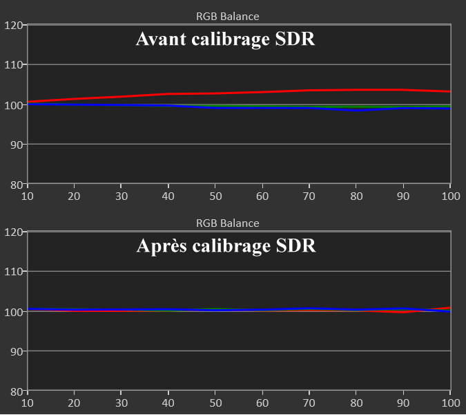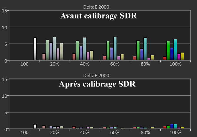 Après calibrage, la balance des blancs sur 11 points est précise et me permet de descendre le delta E moy à 0,6 (max 1,1). Le pic de luminance passe à 65 nits, toujours un peu plus que la recommandation, ce qui sera très suffisant.