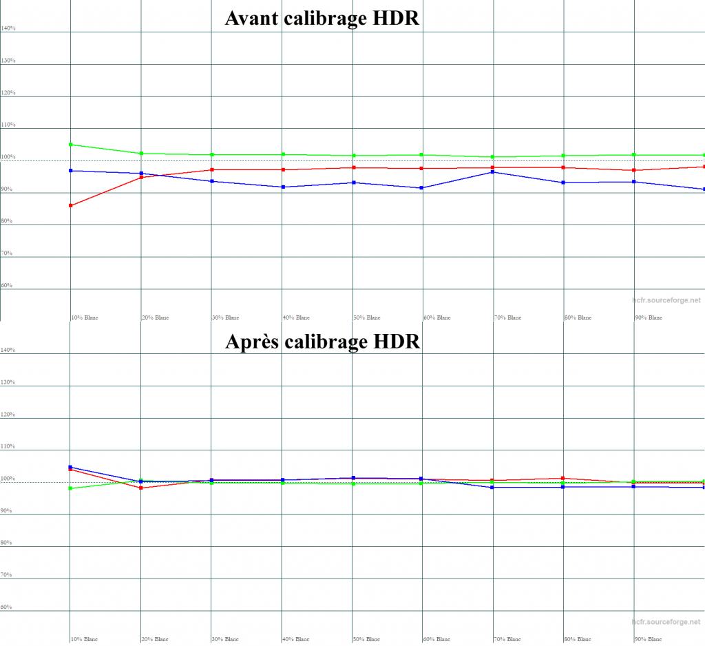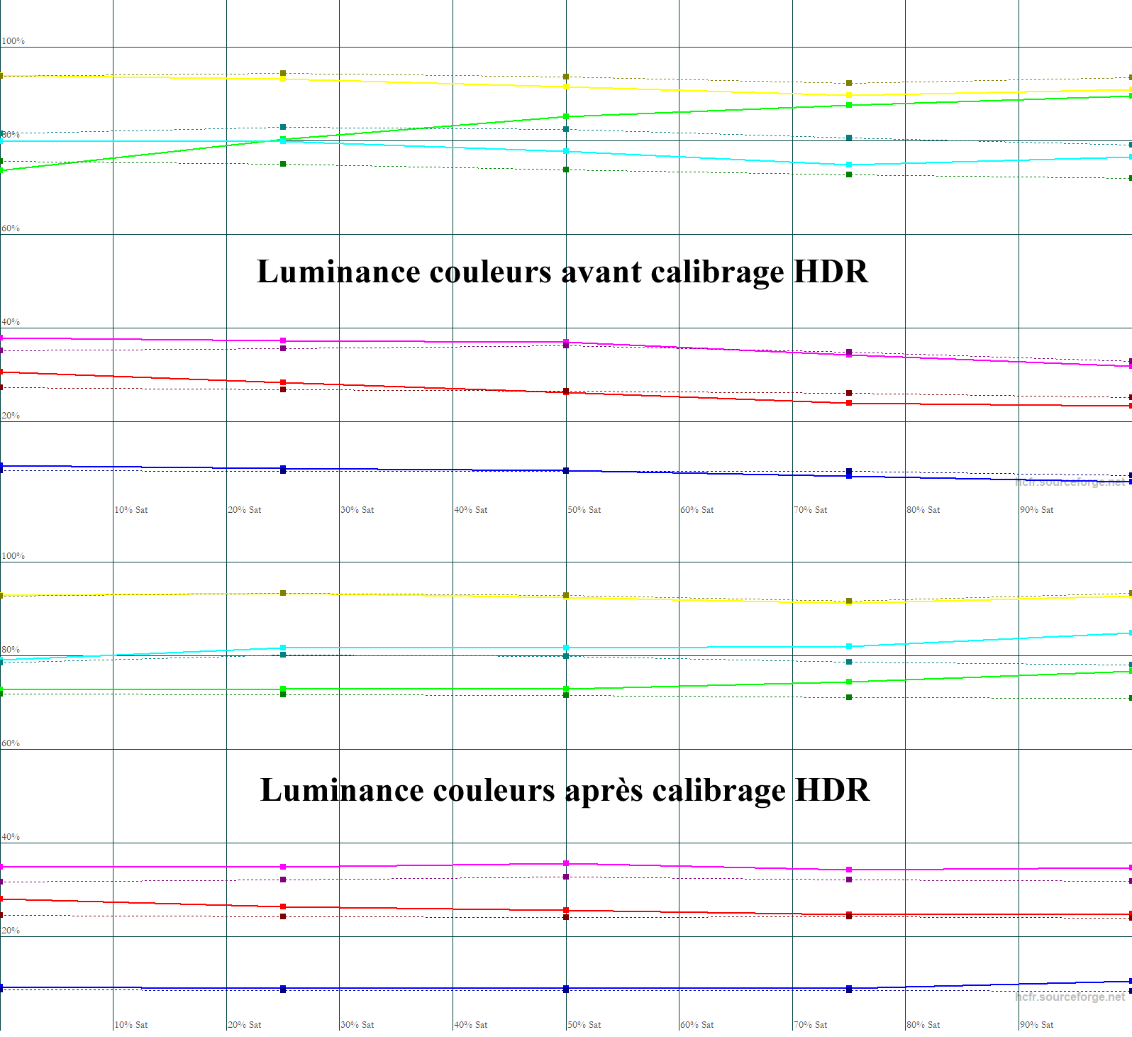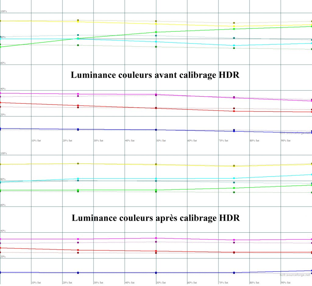 Après calibrage HDR, j’obtiens un delta E moy à 0,9 (max 1,4) pour le blanc. Enlever l’excès de vert fait descendre un peu le pic de luminance à 99 nits et le 50% à 31 nits. Cela reste de bonnes valeurs. La courbe de luminance est encore plus proche de la courbe théorique. J’ai pu relever les basses lumières pour avoir des scènes sombres mieux détaillées. Les hautes lumières sont aussi mieux détaillées.
