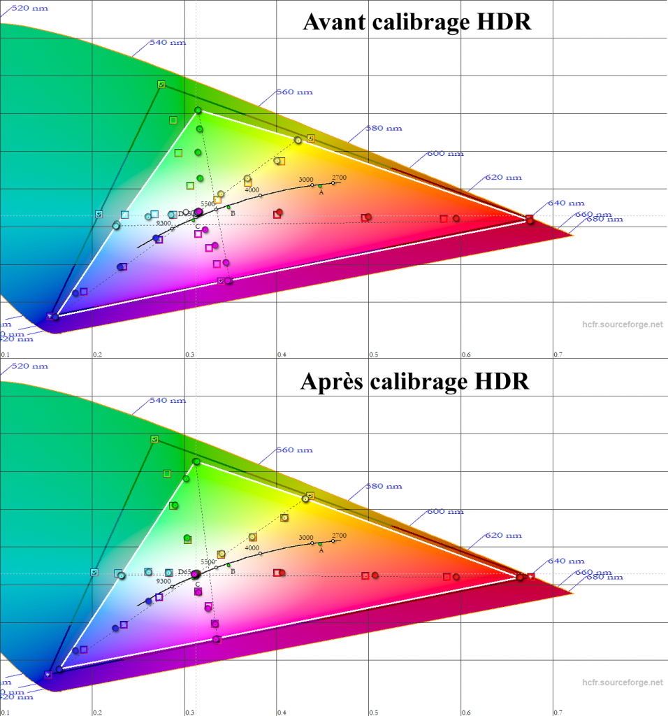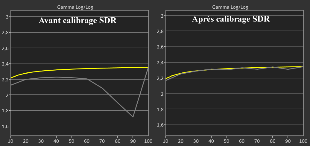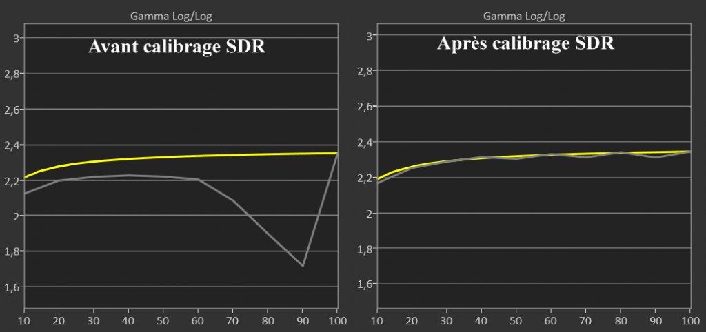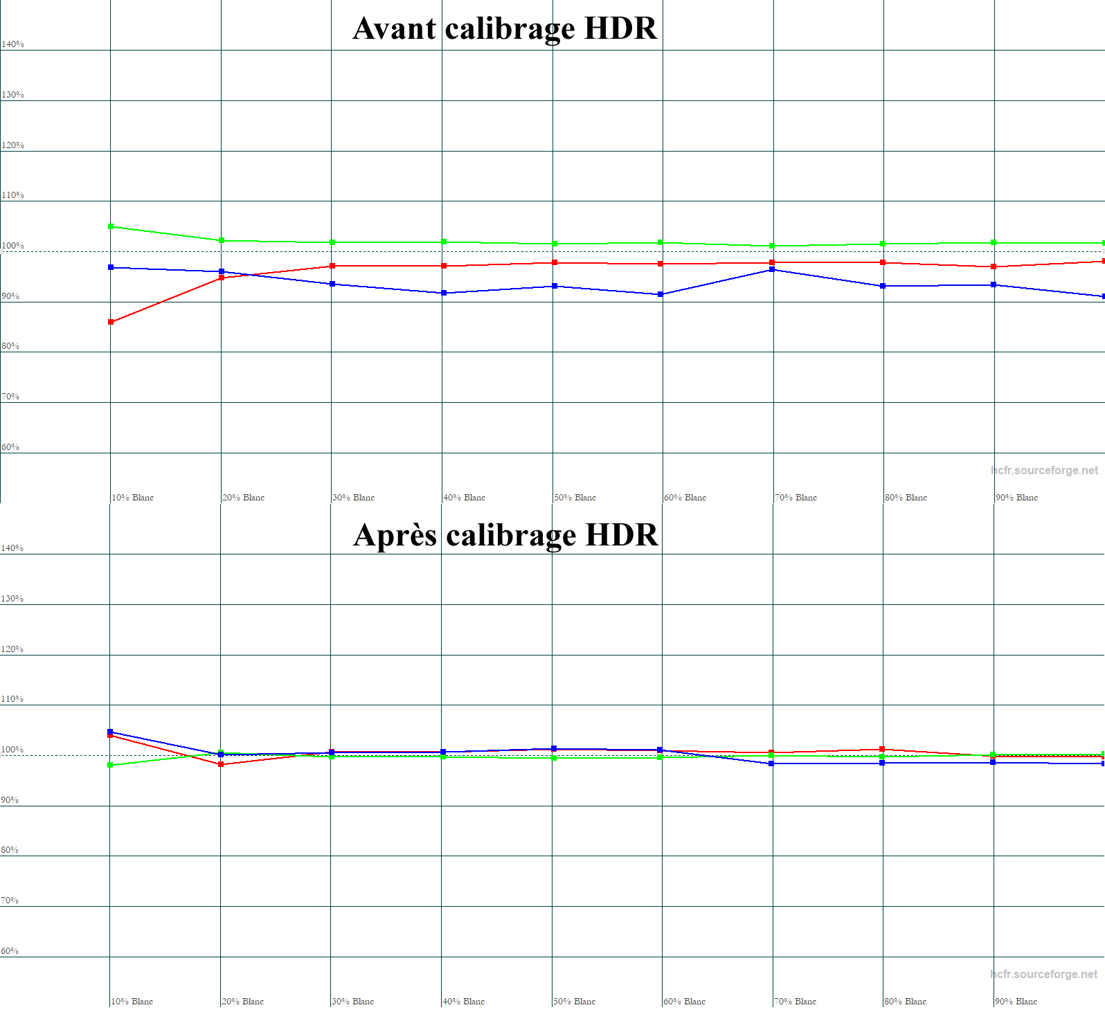 Après calibrage HDR, j’obtiens un delta E moy à 0,9 (max 1,4) pour le blanc. Enlever l’excès de vert fait descendre un peu le pic de luminance à 99 nits et le 50% à 31 nits. Cela reste de bonnes valeurs. La courbe de luminance est encore plus proche de la courbe théorique. J’ai pu relever les basses lumières pour avoir des scènes sombres mieux détaillées. Les hautes lumières sont aussi mieux détaillées.