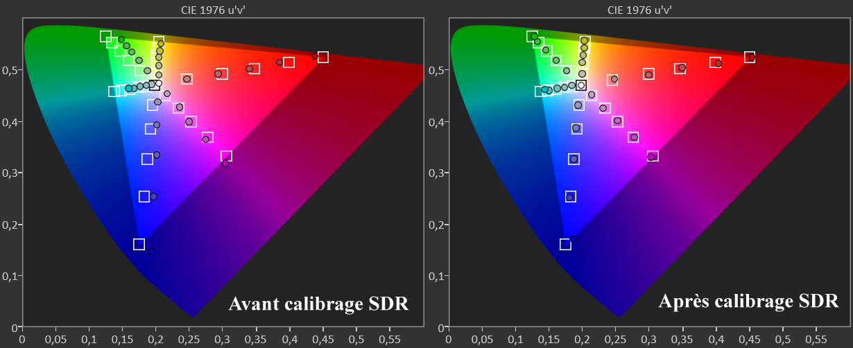 Avant calibrage SDR, le delta E moy des couleurs est à 4 (max 7,1). Le gamut (espace colorimétrique) manque de vert en plus d’avoir un défaut de teinte et déborde dans le bleu ce qui ne permet pas de respecter le REC709 (norme SDR).