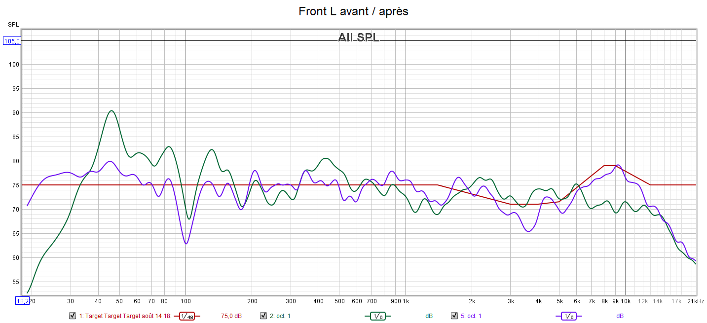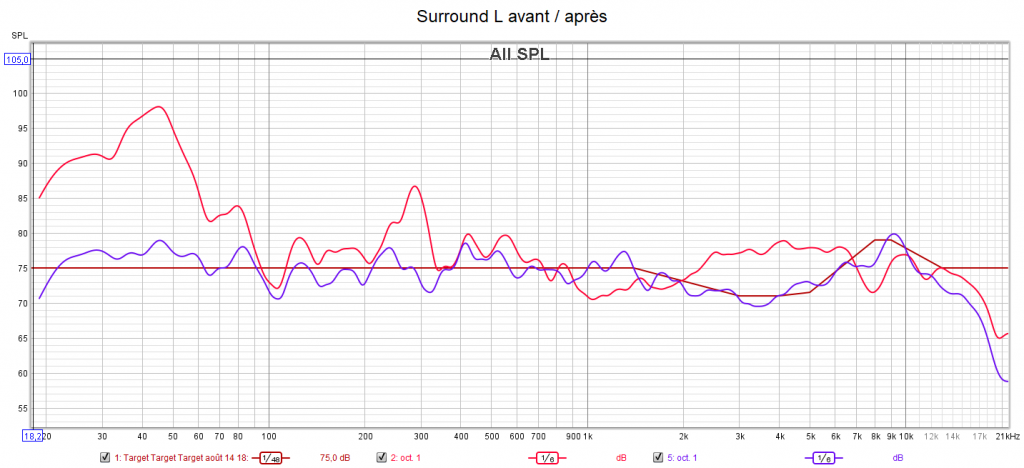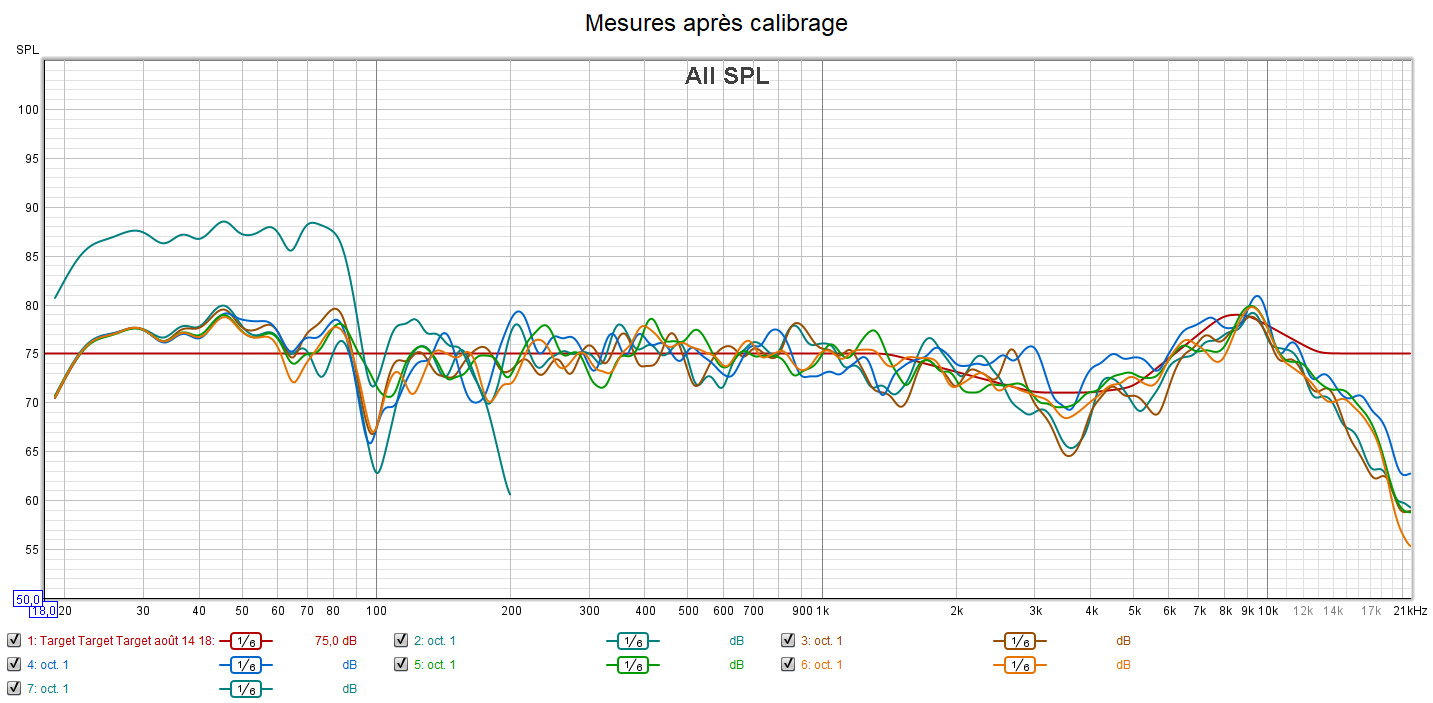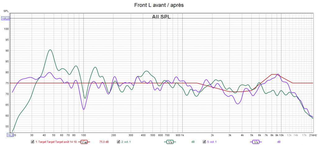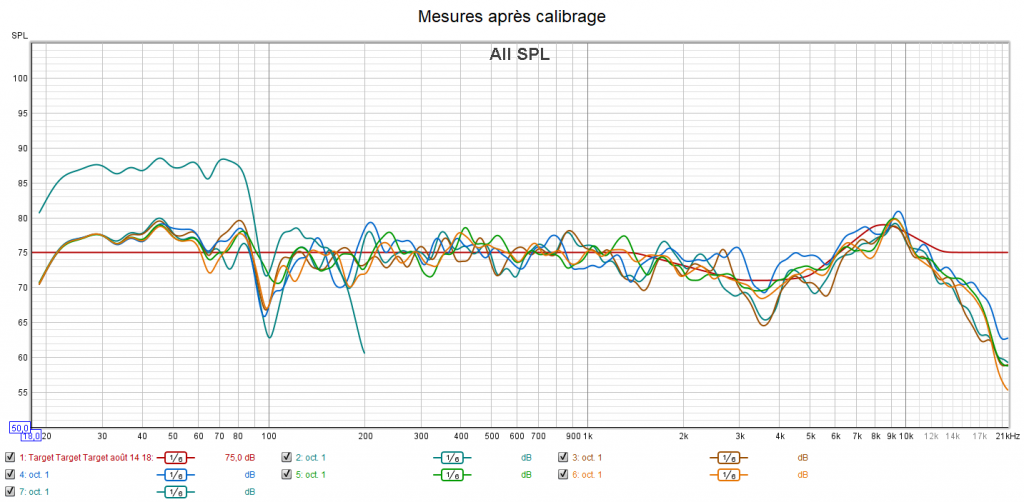 Après calibrage la réponse du caisson est bien corrigée. Il est ramenée à un niveau cohérent. Toutefois un nœud subsiste à 100 Hz se répercutant sur les crossover qui sont mis à 80 Hz pour toutes les enceintes. Car ce n’est pas un problème de phase. La phase du caisson a été réglée. Le caisson reproduit les fréquences sous les 80 Hz. Cela limite grandement la puissance que doit fournir l’ampli aux enceintes (divisé par 5) pour un rendu meilleur dans le grave. La distorsion dans le grave est nettement améliorée. La réponse des enceintes suit la nouvelle courbe cible qui remplace celle d’Audyssey. Elle est une extrapolation des courbes isosonique de Fletcher et Munson pour prendre en compte la sensibilité de l’oreille. Les niveaux sont parfaitement ajustés pour une optimisation maximale de la bulle sonore.