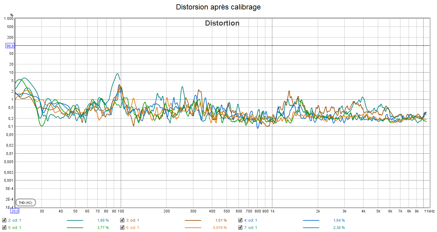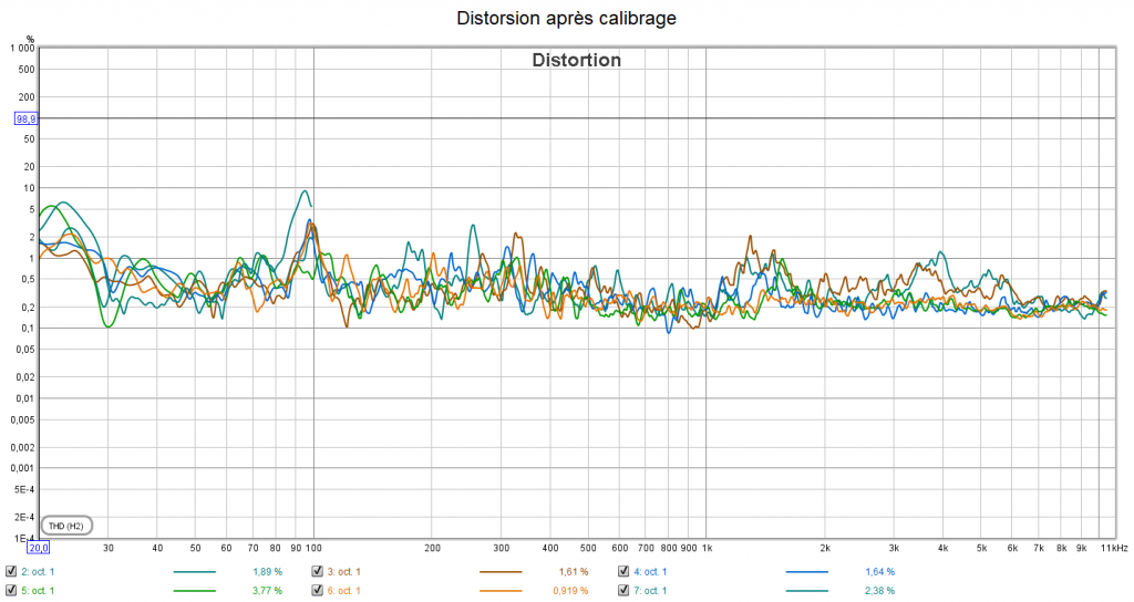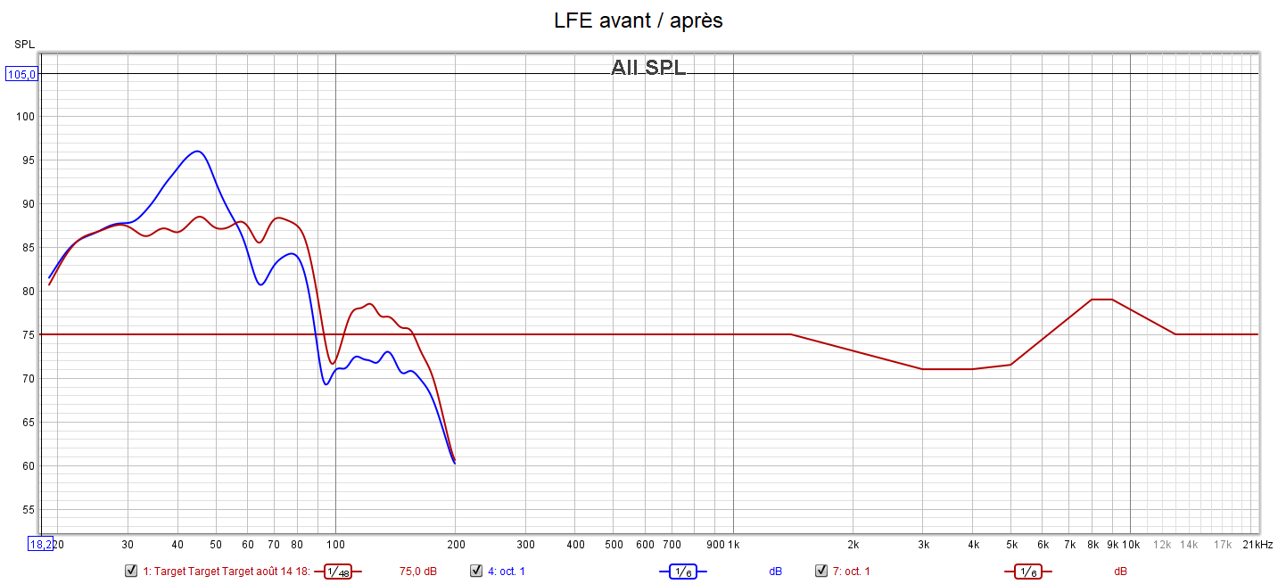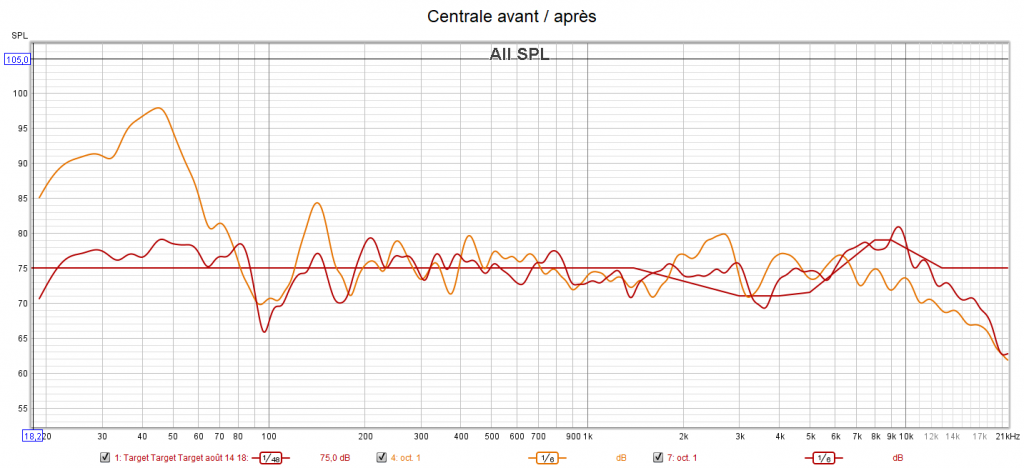 Après calibrage la réponse du caisson est bien corrigée. Il est ramenée à un niveau cohérent. Toutefois un nœud subsiste à 100 Hz se répercutant sur les crossover qui sont mis à 80 Hz pour toutes les enceintes. Car ce n’est pas un problème de phase. La phase du caisson a été réglée. Le caisson reproduit les fréquences sous les 80 Hz. Cela limite grandement la puissance que doit fournir l’ampli aux enceintes (divisé par 5) pour un rendu meilleur dans le grave. La distorsion dans le grave est nettement améliorée. La réponse des enceintes suit la nouvelle courbe cible qui remplace celle d’Audyssey. Elle est une extrapolation des courbes isosonique de Fletcher et Munson pour prendre en compte la sensibilité de l’oreille. Les niveaux sont parfaitement ajustés pour une optimisation maximale de la bulle sonore.