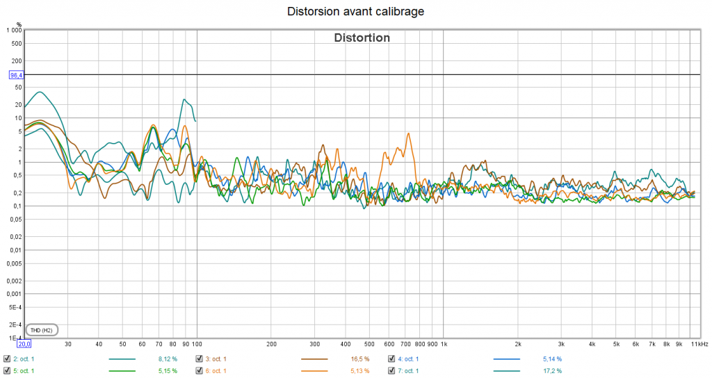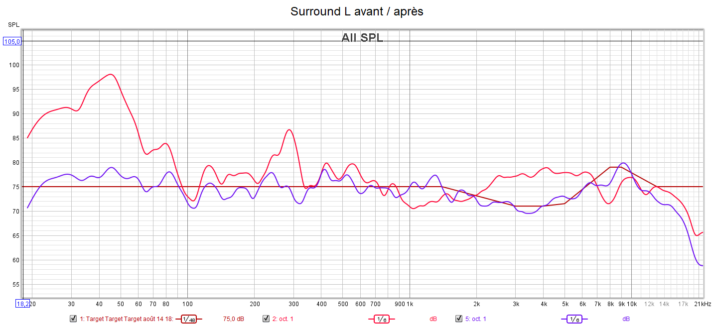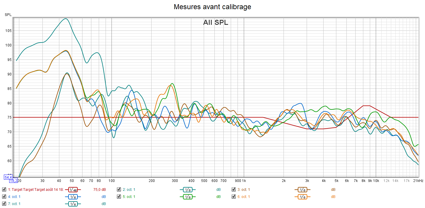 Avant calibrage je constate l’inversion des canaux front L et R. De plus, les surrounds sont branchés sur la connectique des surrounds back. Comme constaté lors de la première écoute, les mesures montrent bien un excès de grave de l’ordre de 15 dB. Et ceci aggravé par un pic à 45 Hz d’environ 8 dB. Ce qui fait 23 dB de trop à 45 Hz. Si l’homogénéité des niveaux n’est pas trop mal, la réponse des enceintes est irrégulière. Les aigus ne suivent pas la courbe cible (trop d’aigus et pas assez d’extrêmes aigus).