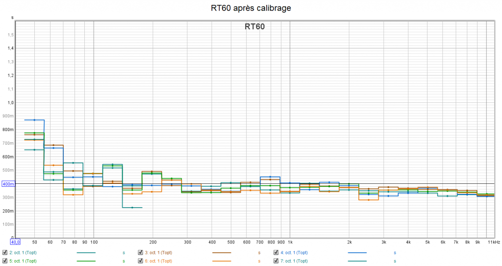 L’acoustique de la pièce est plutôt bonne avec un RT60 (réverbération de la pièce) se situant vers les 400 ms, sauf dans le bas du grave. Le RT60 remonte quasiment toujours dans le grave. Avoir un RT60 plus bas sera toujours mieux en home cinéma, mais être à la valeur limite des 400 ms est déjà bien.