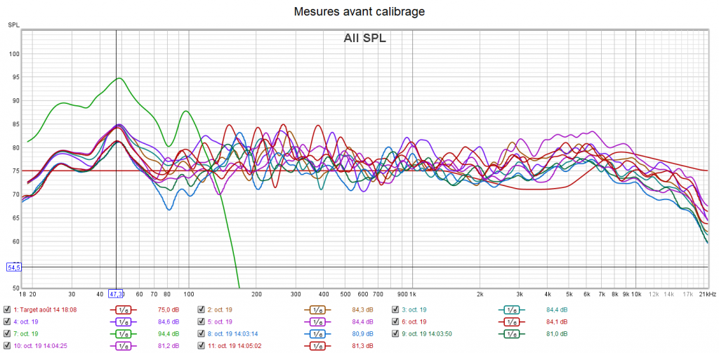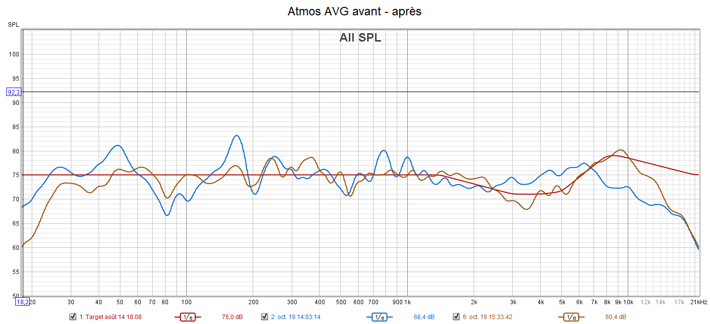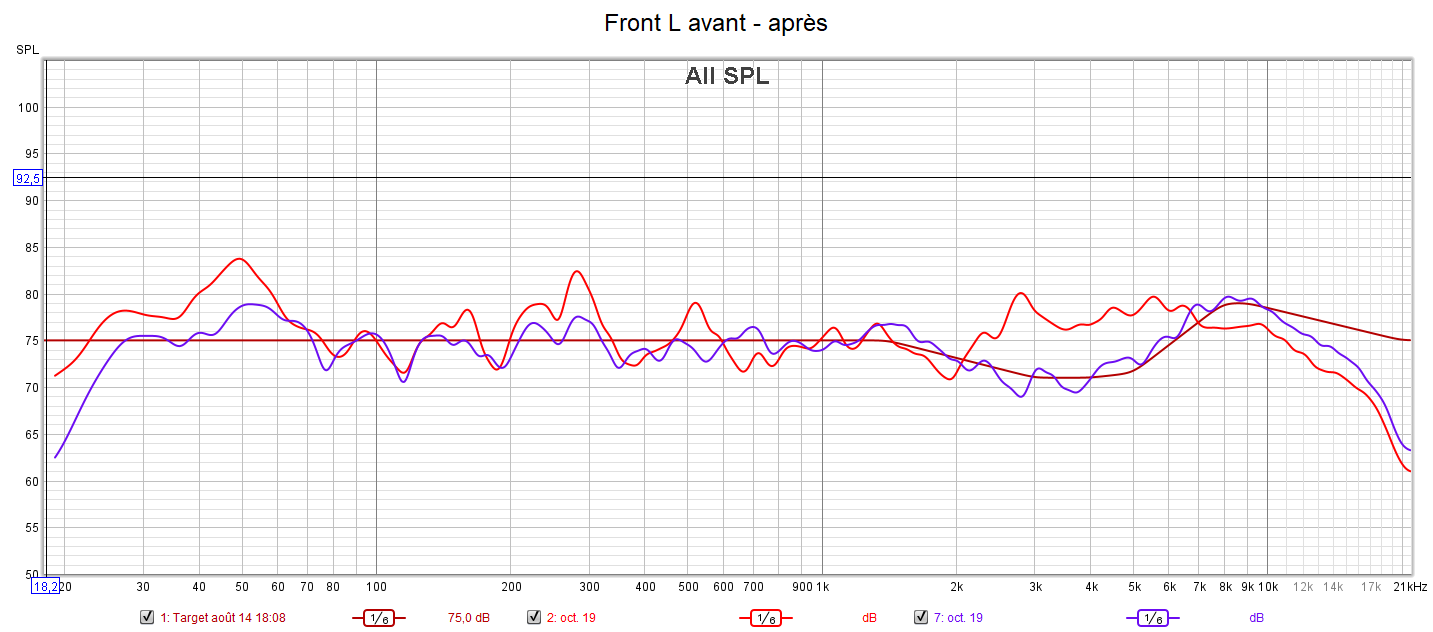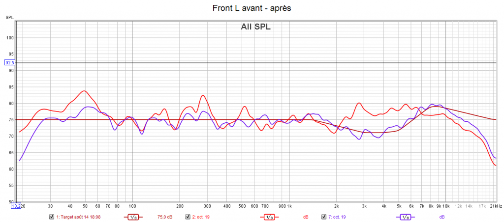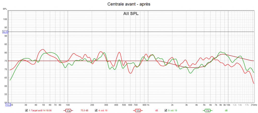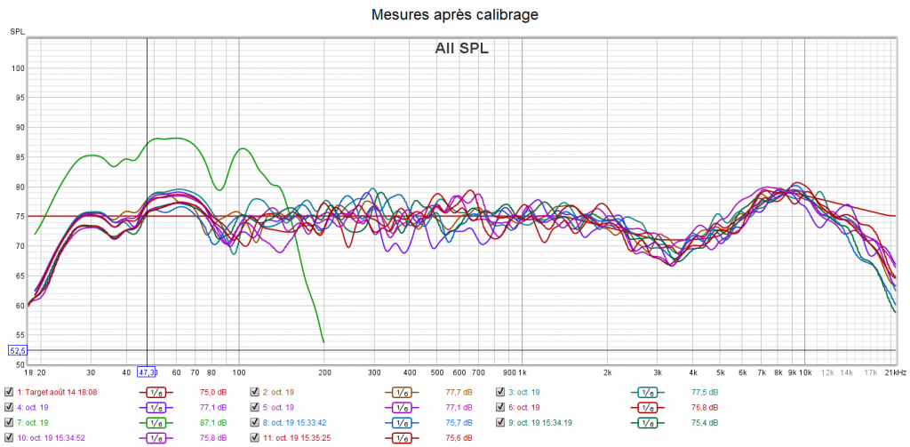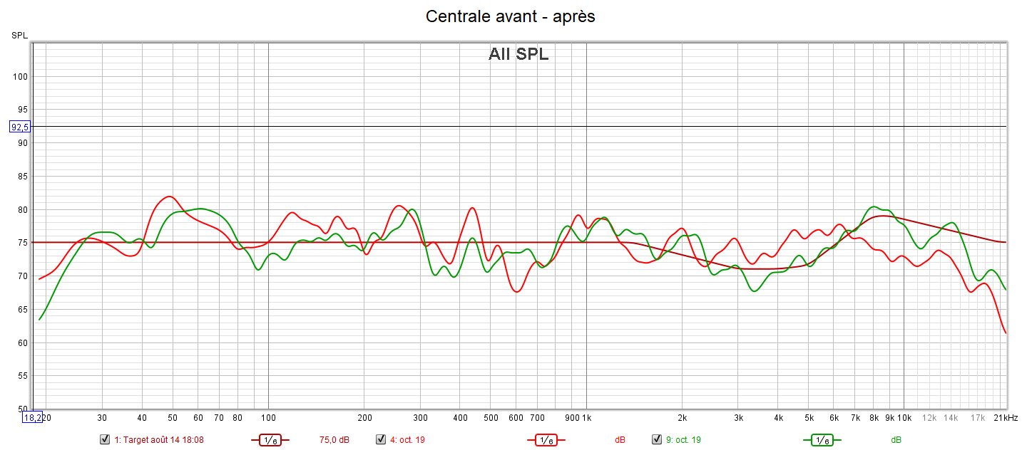 Après calibrage, les mesures montrent un meilleur alignement des niveaux sonores. Cela optimise la bulle sonore tout comme le suivi de la courbe cible pour tous les canaux. Chaque enceinte doit avoir le rendu sonore le plus semblable possible. La réponse dans le grave a finalement été améliorée sans utiliser l’anti mode Dspeaker. La mise en phase du caisson a été faite ainsi que sa synchronisation temporelle (temps groupe). Souvent en retard, il faut régler la distance du caisson pour compenser ce retard.
