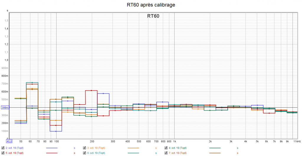 Pour l’acoustique, nous sommes en grande partie à la limite des 400 milliseconde pour le RT60 (réverbération de la pièce). Il remonte un peu dans le grave.