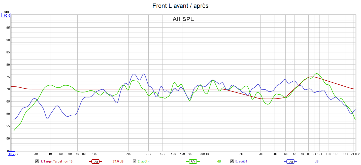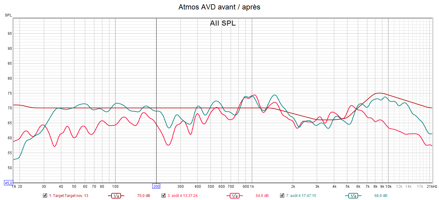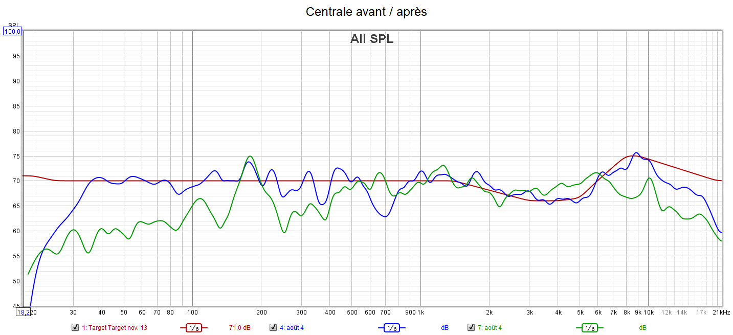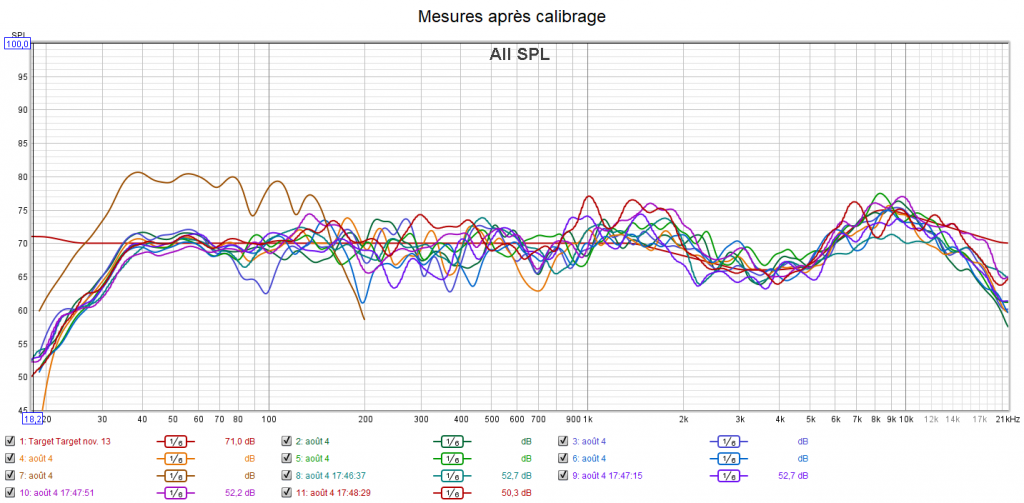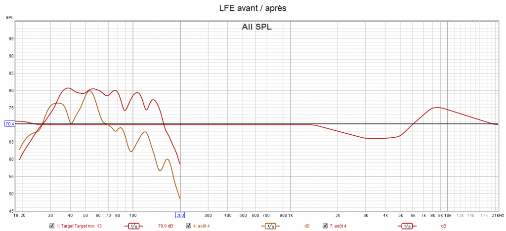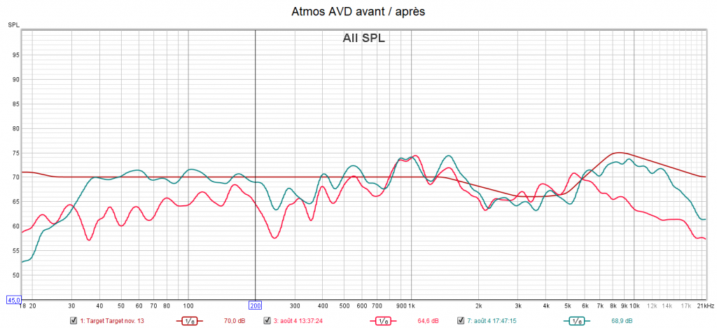 Après calibrage qui prend en compte la sensibilité de l’oreille en fonction des courbes isosonique de Fletcher et Munson, les niveaux sonores sont ajustés au plus proche les uns des autres. La nouvelle courbe cible est respectée au mieux en utilisant toutes les possibilités de l’ampli et l’appli Audyssey MulEQ Editor. L’atténuation de la bande 2-5 kHz est bien respectée (zone sensible de l’oreille) ainsi que la remontée dans l’extrême aigu, zone de faible sensibilité de l’oreille. Les 2 caissons et les enceintes ont été mis en phase. Le gain sur la bande passante et la linéarité du grave est très important.