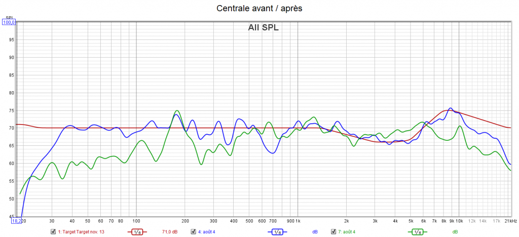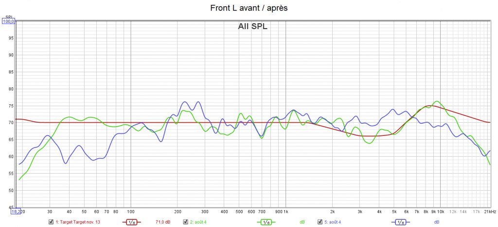Ci-dessous la correction de la frontale gauche, la centrale, l’atmos avant droite et le LFE. Le LFE est composé de 2 caissons qui n’étaient pas en phase.