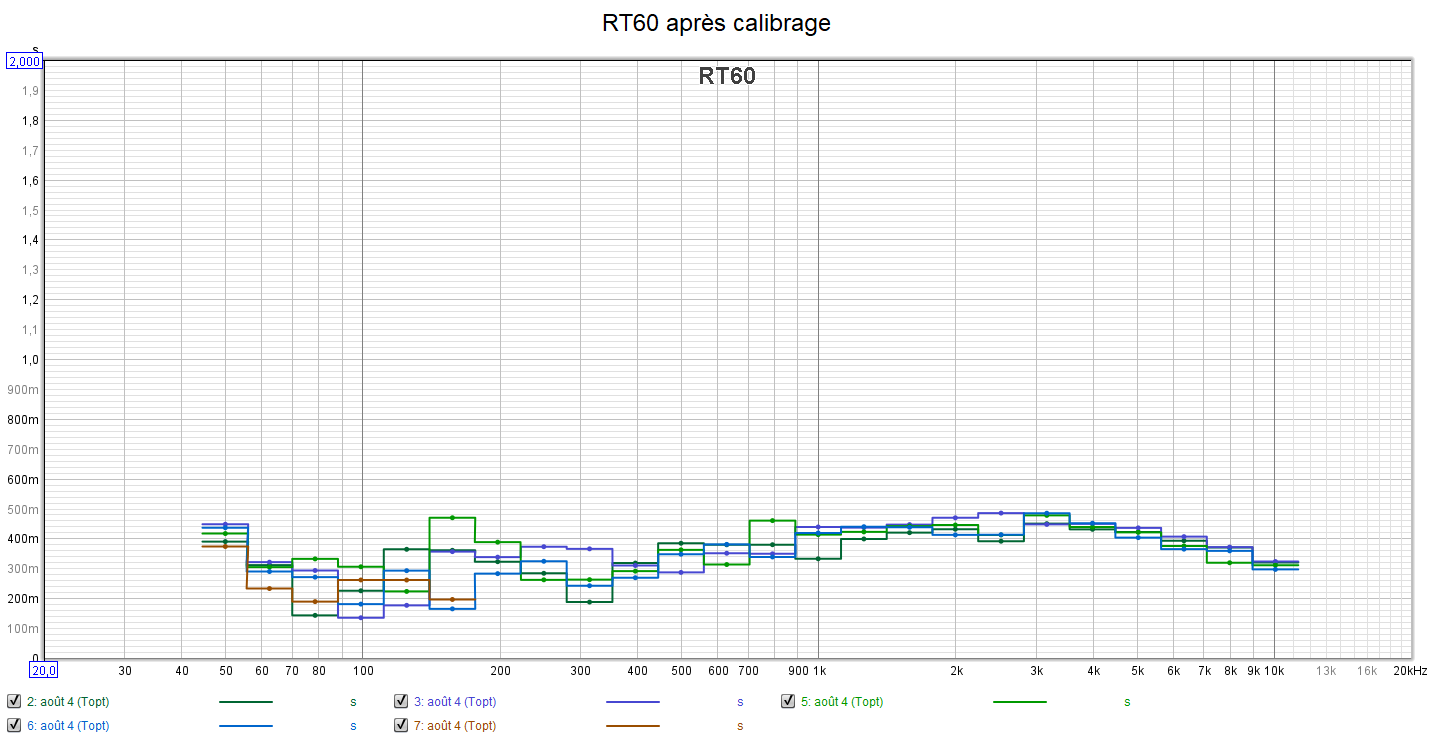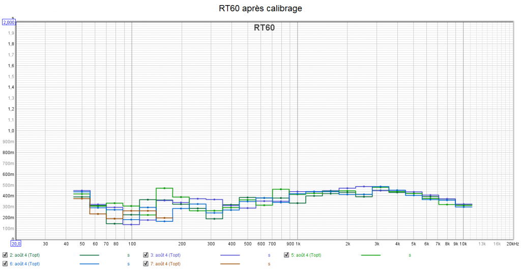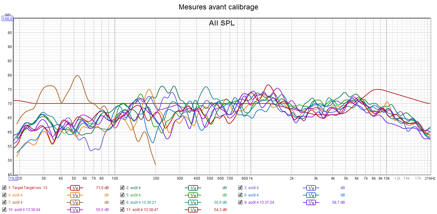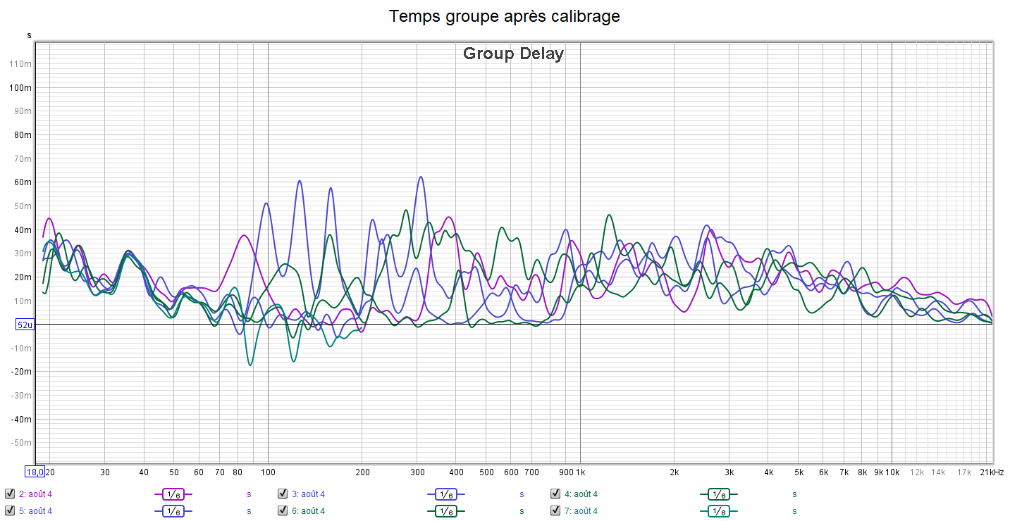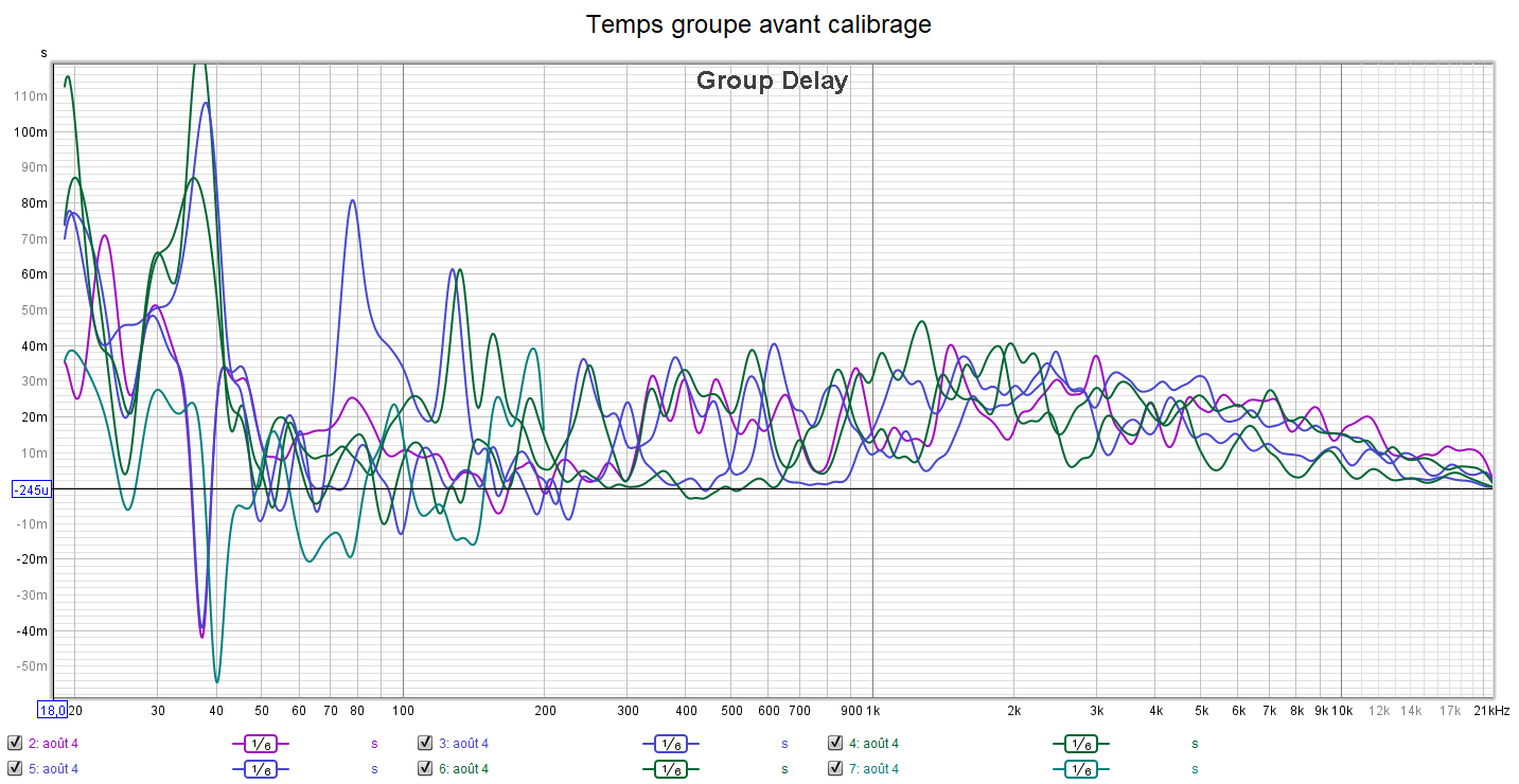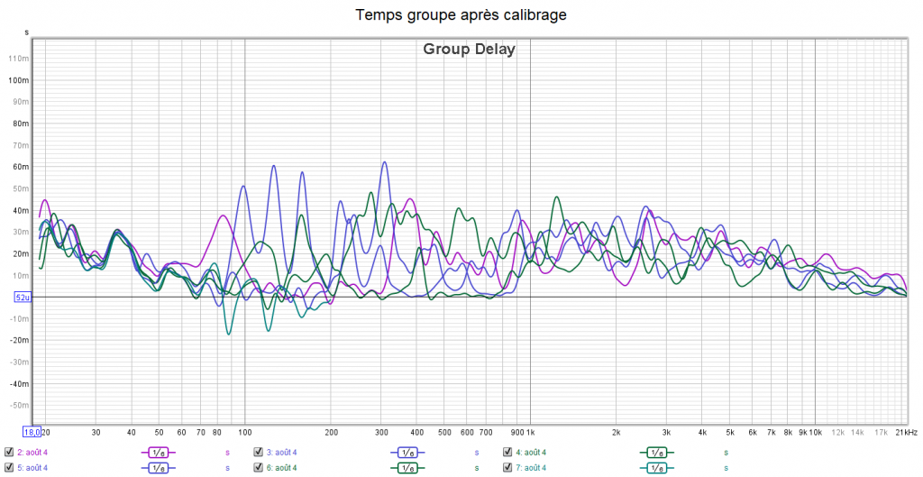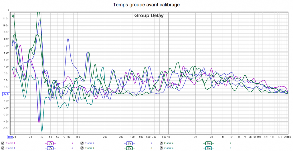 Relevé de temps groupe avant calibrage : le but est d’avoir des courbes les plus lisses et plates possibles. Très lié à l’acoustique de la pièce, le grave est le plus en désordre.