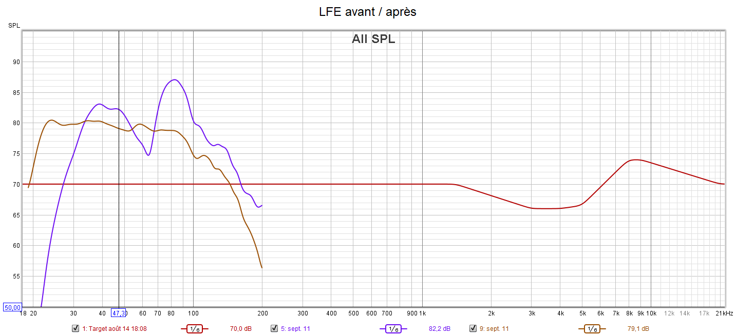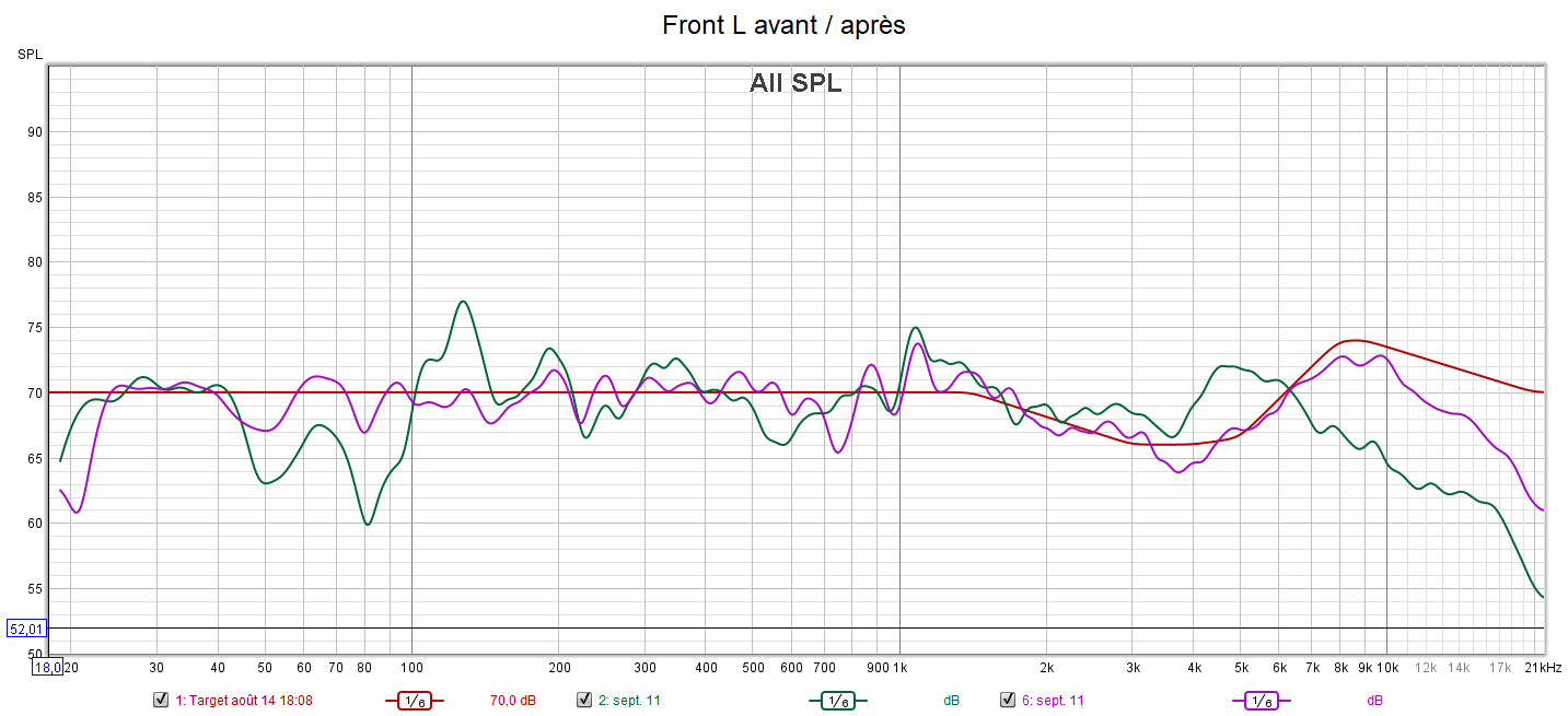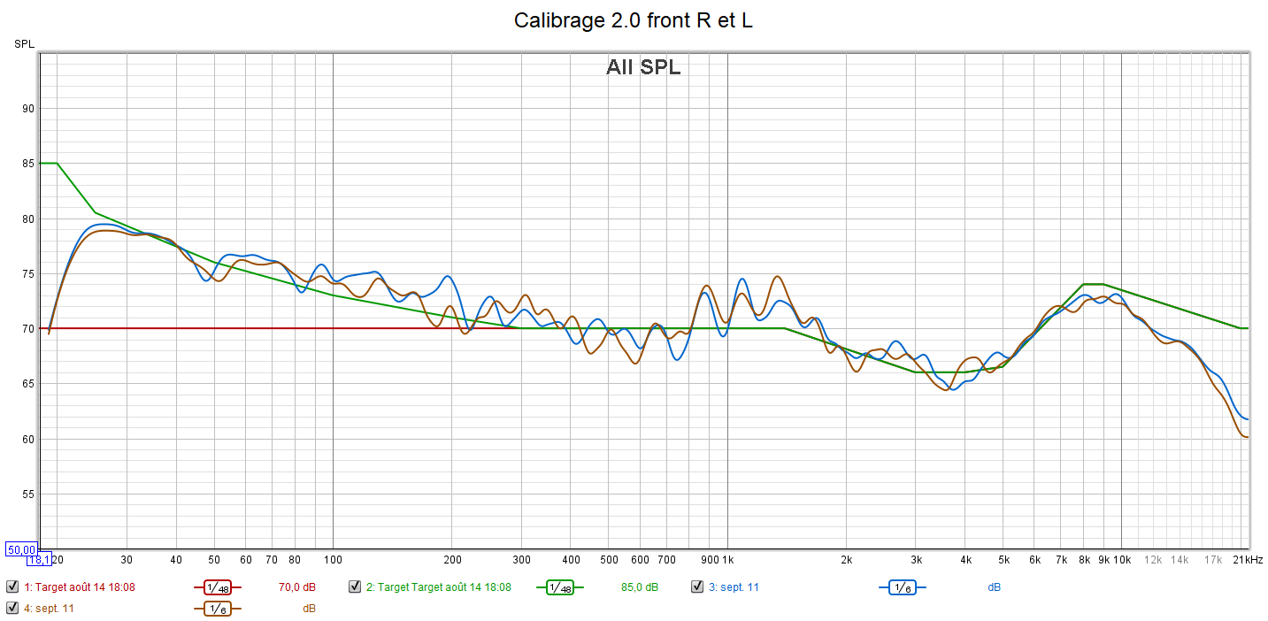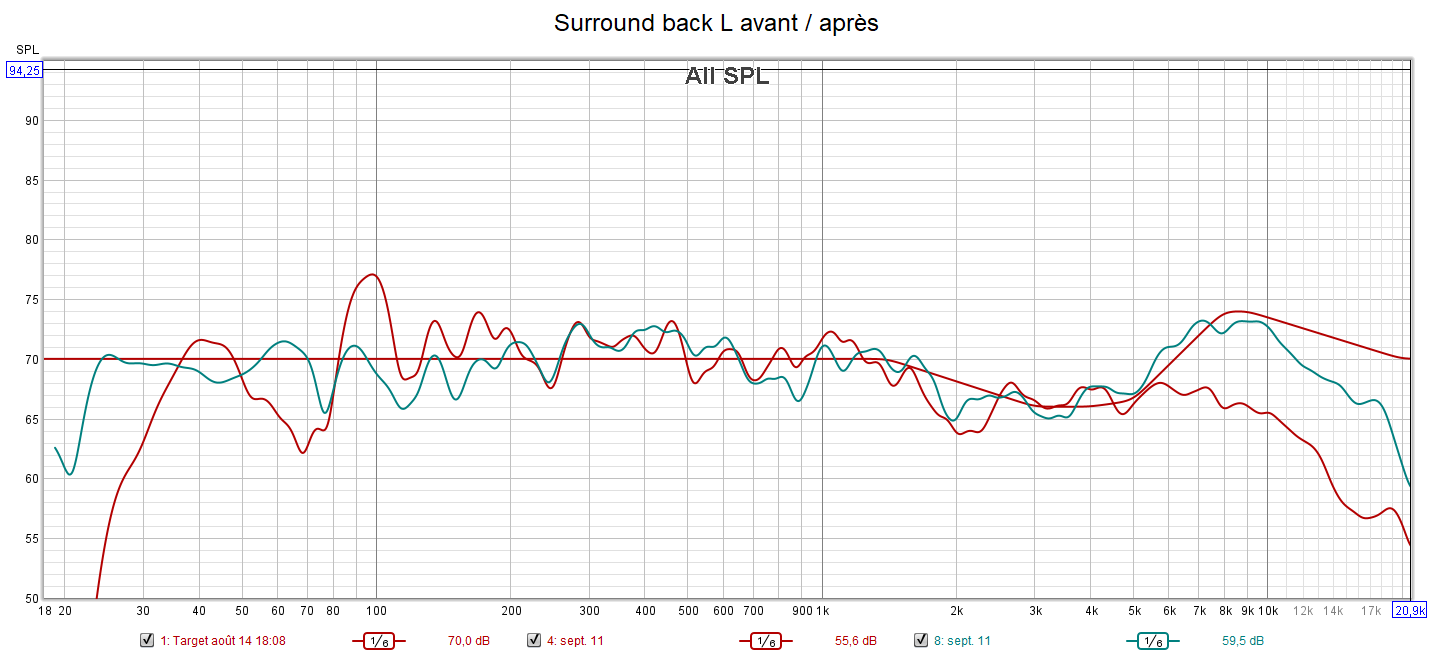 Après calibrage, toutes les enceintes sont configurées en « Petite » pour laisser le caisson seul gérer le grave. La phase du caisson a été optimisée pour avoir les meilleurs crossover et surtout le filtre passe-haut a été désactivé en plaçant l’interrupteur sur la position REF. La réponse du caisson descend désormais à 21 Hz. Tous les niveaux sonores ont été harmonisés. La réponse des enceintes suit la nouvelle courbe cible au plus près.