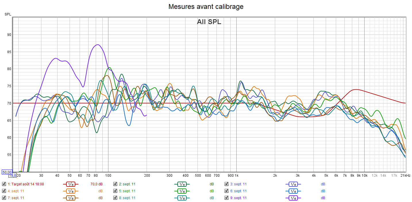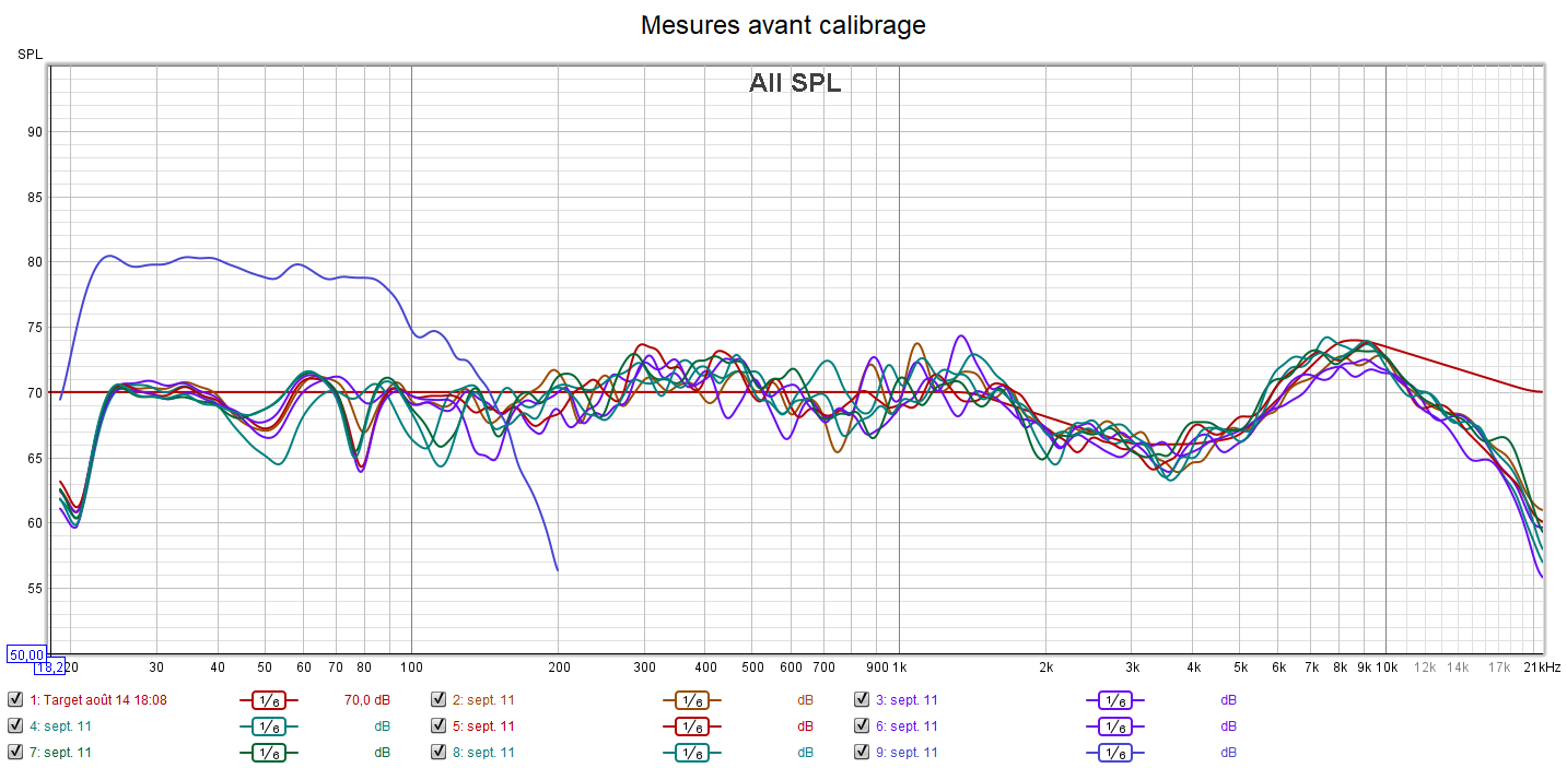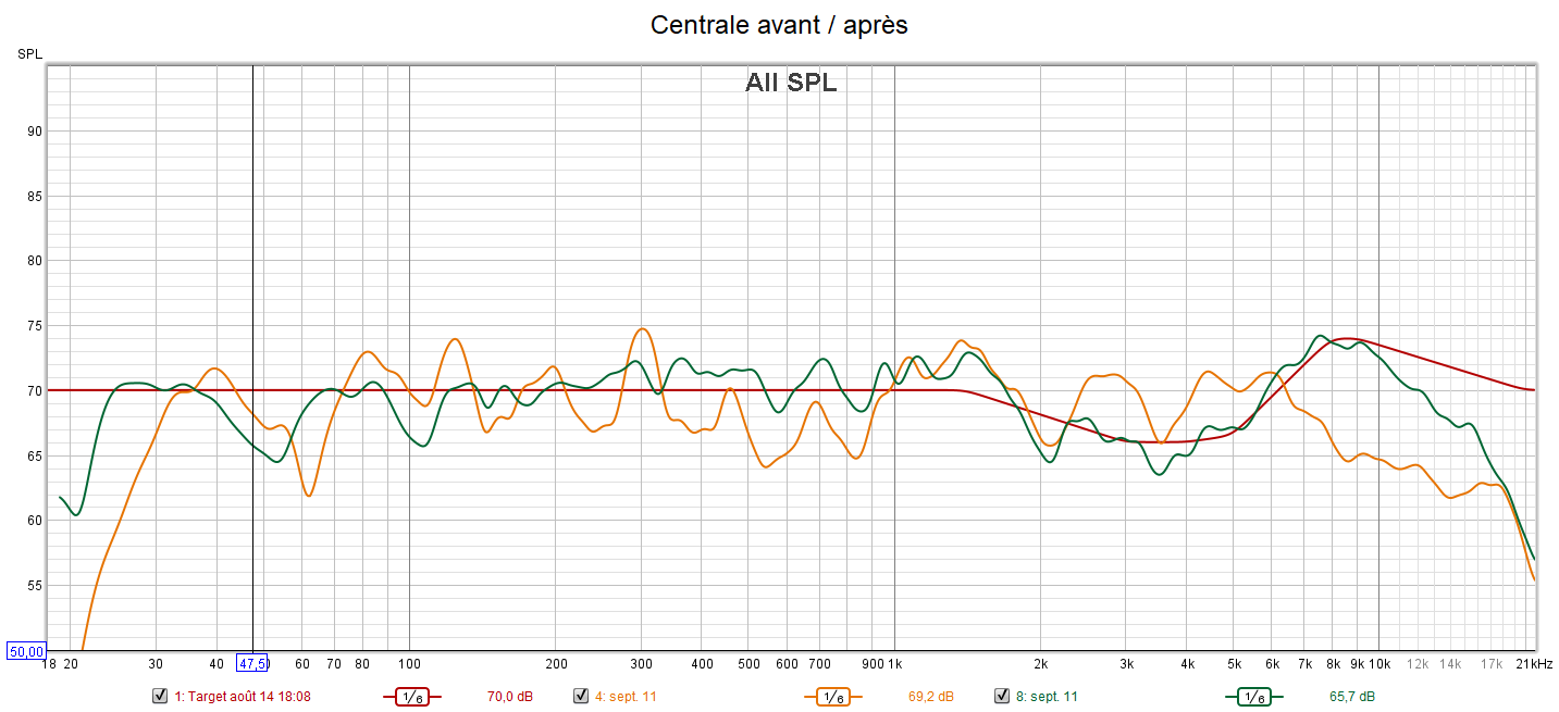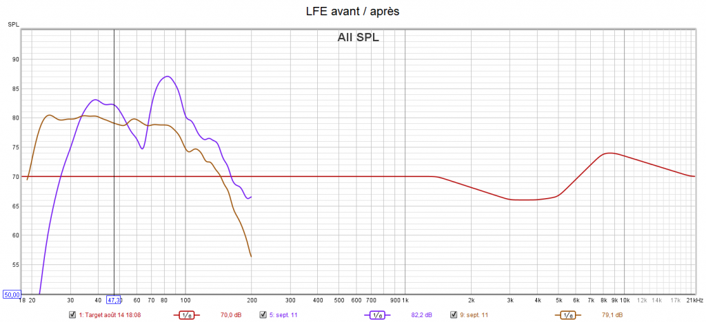 Après calibrage, toutes les enceintes sont configurées en « Petite » pour laisser le caisson seul gérer le grave. La phase du caisson a été optimisée pour avoir les meilleurs crossover et surtout le filtre passe-haut a été désactivé en plaçant l’interrupteur sur la position REF. La réponse du caisson descend désormais à 21 Hz. Tous les niveaux sonores ont été harmonisés. La réponse des enceintes suit la nouvelle courbe cible au plus près.