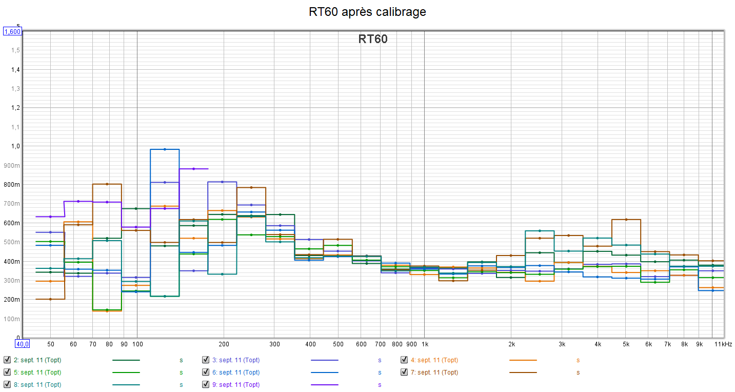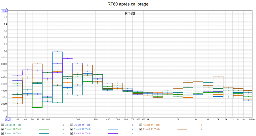 Pour l’acoustique, le RT60 dépasse un peu les 400 millisecondes dans l’aigu. Descendre vers les 200ms est un vrai plus pour une salle dédiée. La mesure dans le grave n’est pas stable. Une mesure à un niveau sonore plus élevé aurait amélioré la précision. RAS pour la distorsion : on est sous les 1% pour le grave et on descend sous les 0,5% pour médium et aigu. C’est ce que j’observe habituellement.