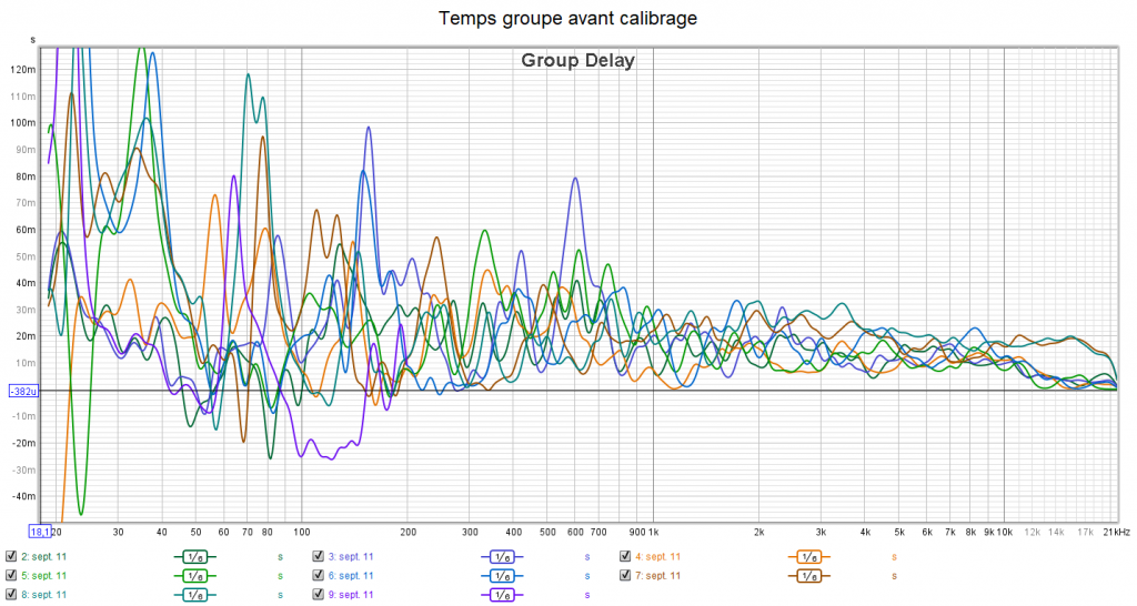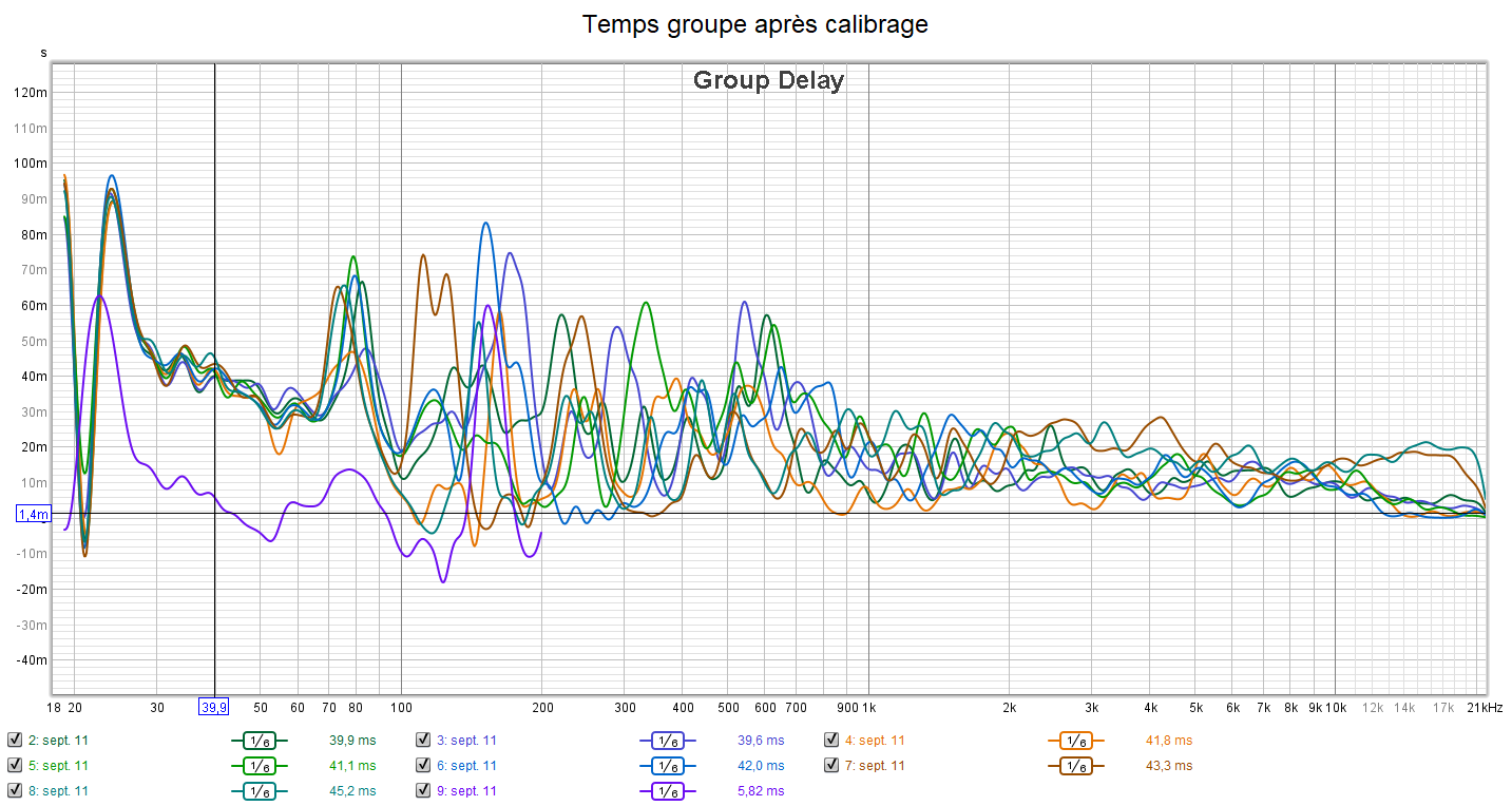 Les mesures de temps groupe montrent une bonne différence entre avant et après dans le grave. La mesure idéale est une ligne horizontale plate. On est nettement mieux après calibrage dans le grave. La réponse est très lié à l’acoustique de la pièce pour le reste de la plage fréquentielle.