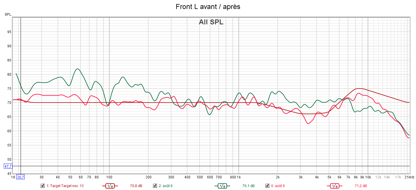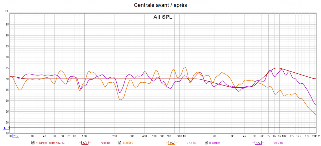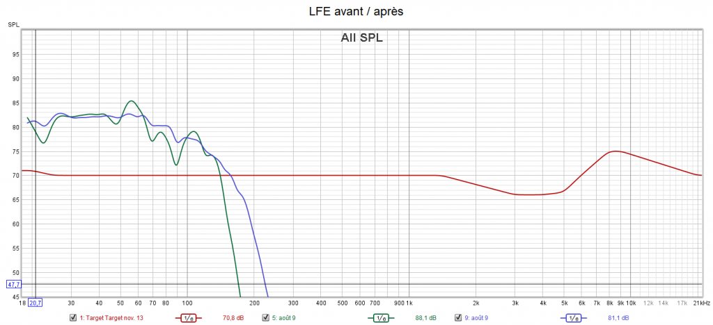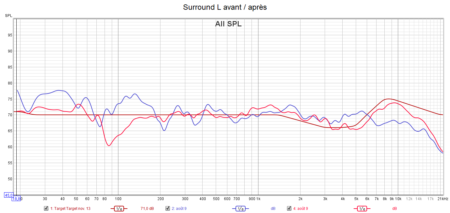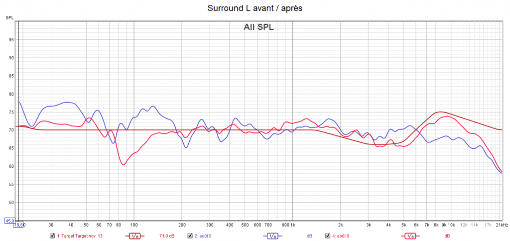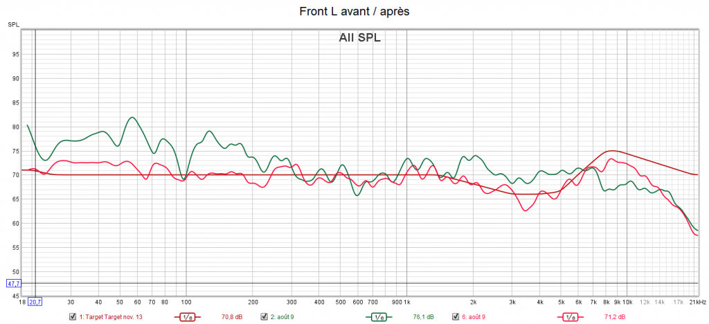 Ci-dessous la correction de la frontale gauche, la centrale, la surround gauche et le LFE. La mise en phase du crossover n’a pas été simple. La scène frontale a été privilégiée.