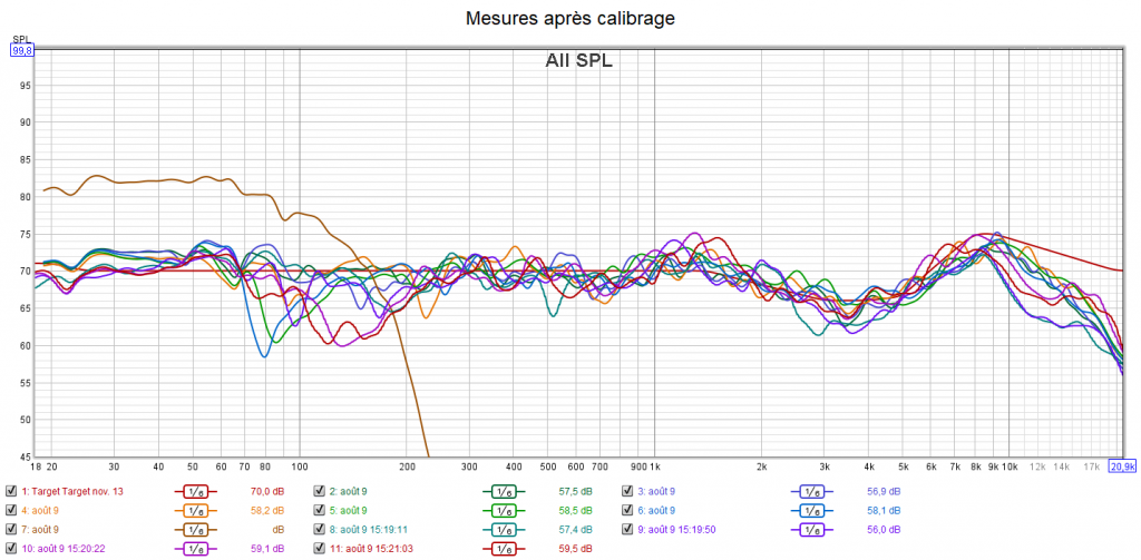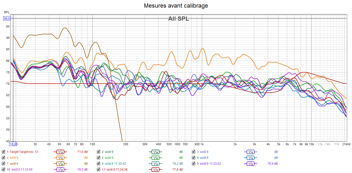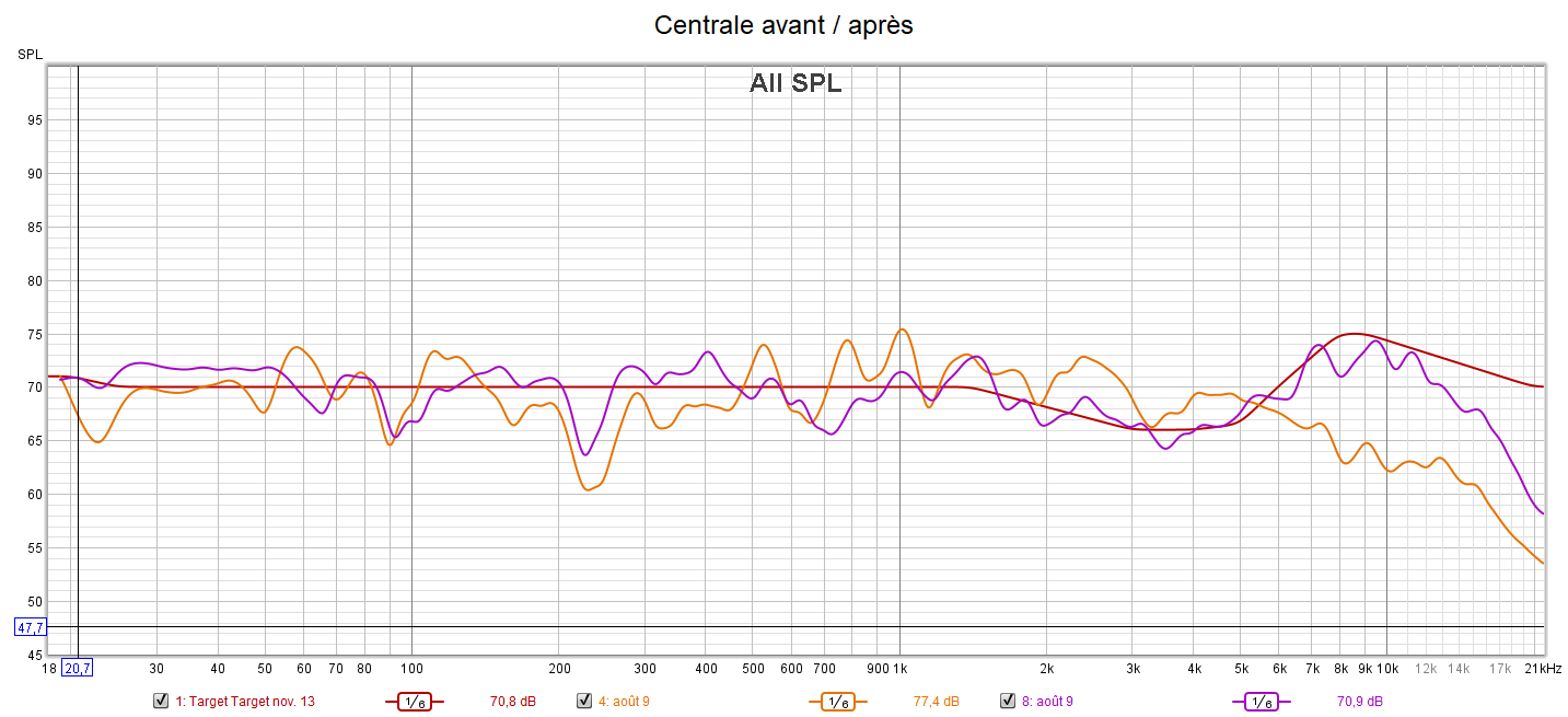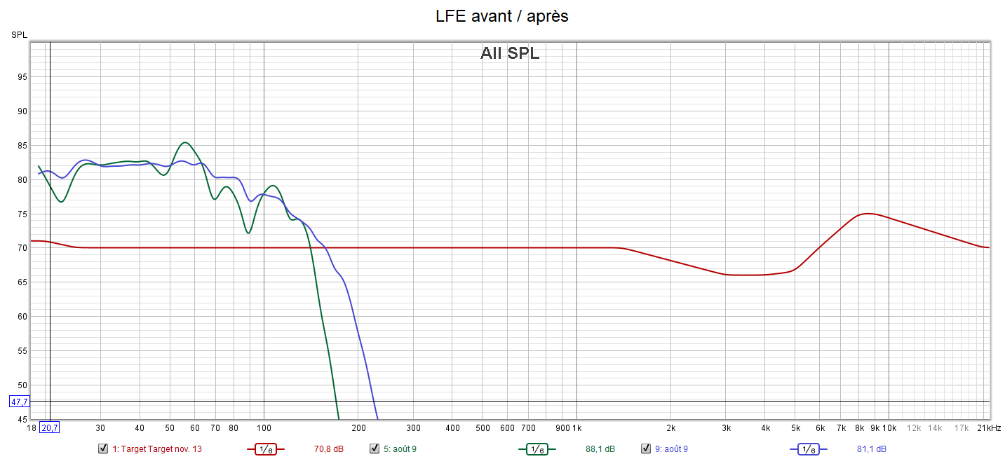 Ci-dessous la correction de la frontale gauche, la centrale, la surround gauche et le LFE. La mise en phase du crossover n’a pas été simple. La scène frontale a été privilégiée.