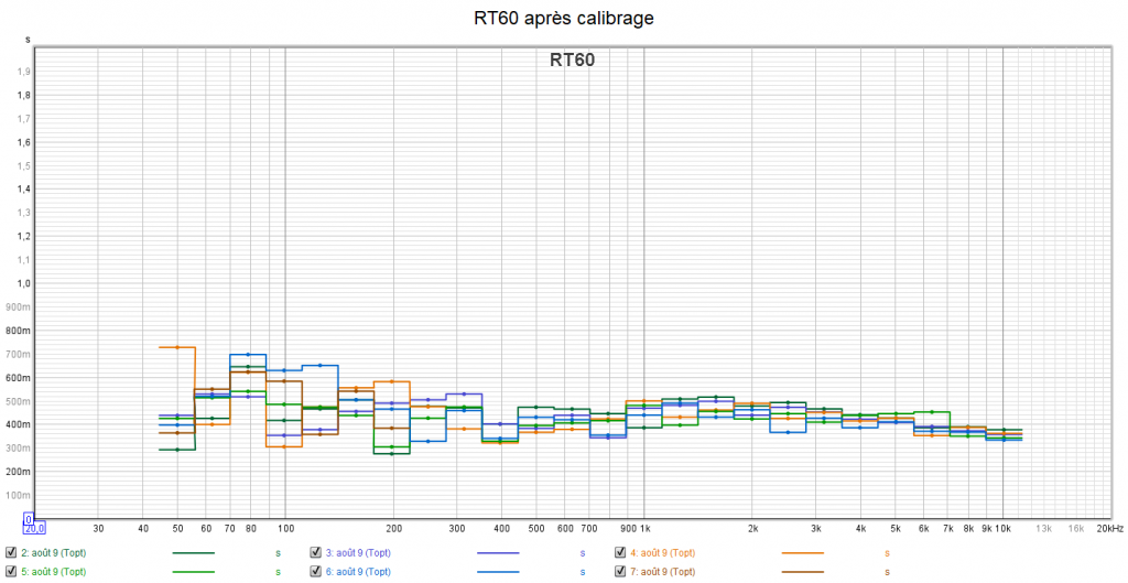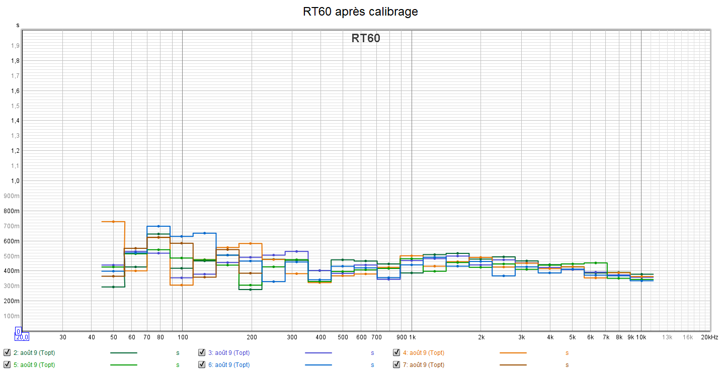 Concernant les aspects acoustiques, le RT60 (réverbération de la pièce) est aux alentours des 500 millisecondes. Il ne faudrait pas dépasser 400 ms pour bien faire. On a gagné en homogénéité dans le grave en ajustant la phase du caisson, sa réponse et son niveau. La distorsion ne présente pas d’anomalies. Un peu sous les valeurs que je vois habituellement, donc rien à dire.