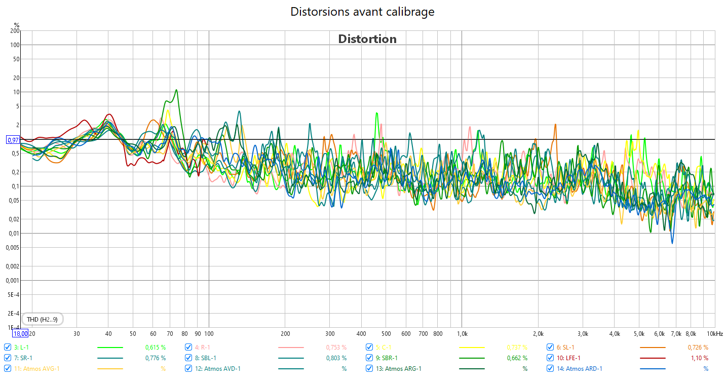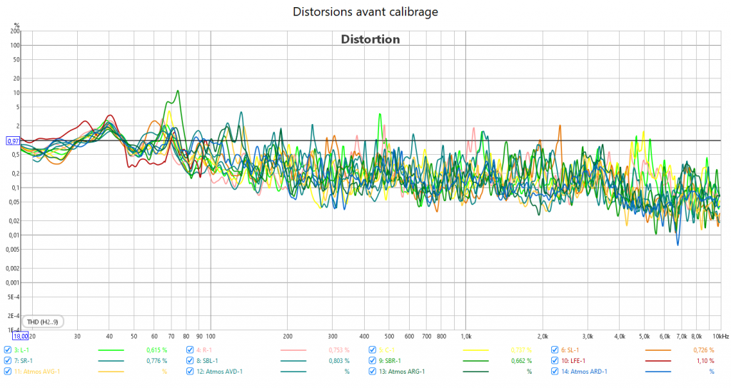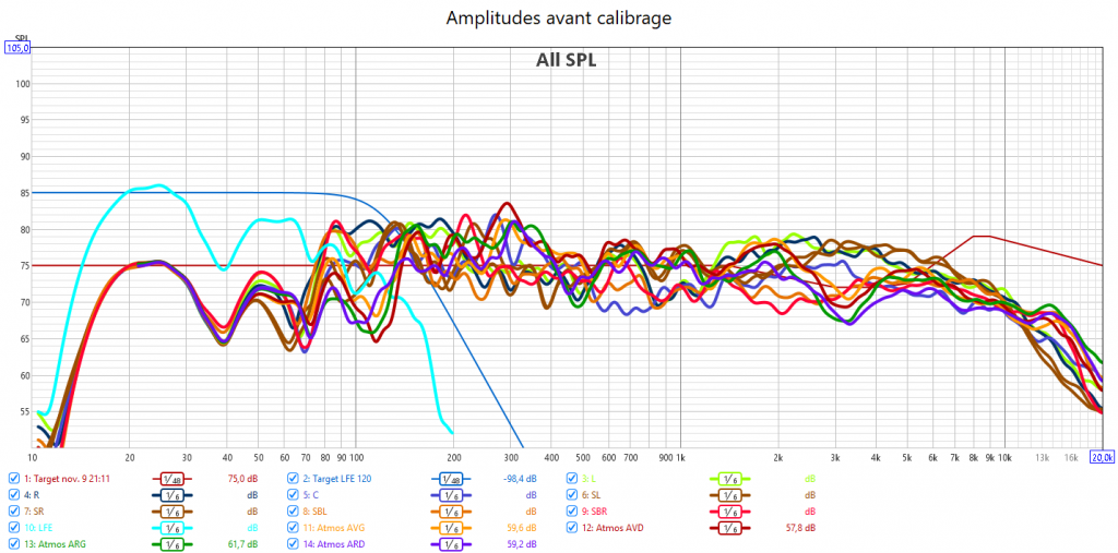 Avant calibrage, le constat classique que je fais quasiment tout le temps est sur le manque de clarté lié à un manque d’extrême aigu. On ne manque pourtant pas d’aigu. Ce sont 2 choses différentes. L’aigu (2-5kHz) nous donne de l’agressivité à l’écoute provenant des enceintes au sol, pas des atmos. Les mesures confirment tout cela. Je précise qu’il n’y a aucun problème de distorsion. Les surround back ont leur niveau sonore en retrait. Les réponses ne sont pas homogènes avec des disparités dans les niveaux et en rendu sonore. 𝗔𝘂𝗱𝘆𝘀𝘀𝗲𝘆 𝗢𝗻𝗲 𝗻𝗲 𝗰𝗼𝗿𝗿𝗶𝗴𝗲 𝗿𝗶𝗲𝗻 𝗮𝘂-𝗱𝗲𝘀𝘀𝘂𝘀 𝗱𝗲 𝟯𝟬𝟬𝗛𝘇. 𝗟𝗮 𝗯𝘂𝗹𝗹𝗲 𝘀𝗼𝗻𝗼𝗿𝗲 𝗻𝗲 𝗽𝗲𝘂𝘁 𝗽𝗮𝘀 𝗲̂𝘁𝗿𝗲 𝗲́𝗾𝘂𝗶𝗹𝗶𝗯𝗿𝗲́𝗲. Les résultats ne sont pas mieux dans le grave. 𝗢𝗻 𝗮 𝘂𝗻 𝗽𝗶𝗰 𝗲𝗻𝘁𝗿𝗲 𝟮𝟬 𝗲𝘁 𝟯𝟬 𝗛𝘇 𝗮̀ 𝗽𝗲𝗶𝗻𝗲 𝗿𝗲́𝗱𝘂𝗶𝘁 𝗽𝗮𝗿 𝗔𝘂𝗱𝘆𝘀𝘀𝗲𝘆 𝗢𝗻𝗲 𝗾𝘂𝗶 𝗮 𝗰𝗼𝗻𝘁𝗿𝗮𝗶𝗻𝘁 𝗹’𝘂𝘁𝗶𝗹𝗶𝘀𝗮𝘁𝗲𝘂𝗿 𝗮̀ 𝗯𝗮𝗶𝘀𝘀𝗲𝗿 𝗹𝗲 𝗻𝗶𝘃𝗲𝗮𝘂 𝗱𝘂 𝗟𝗙𝗘.