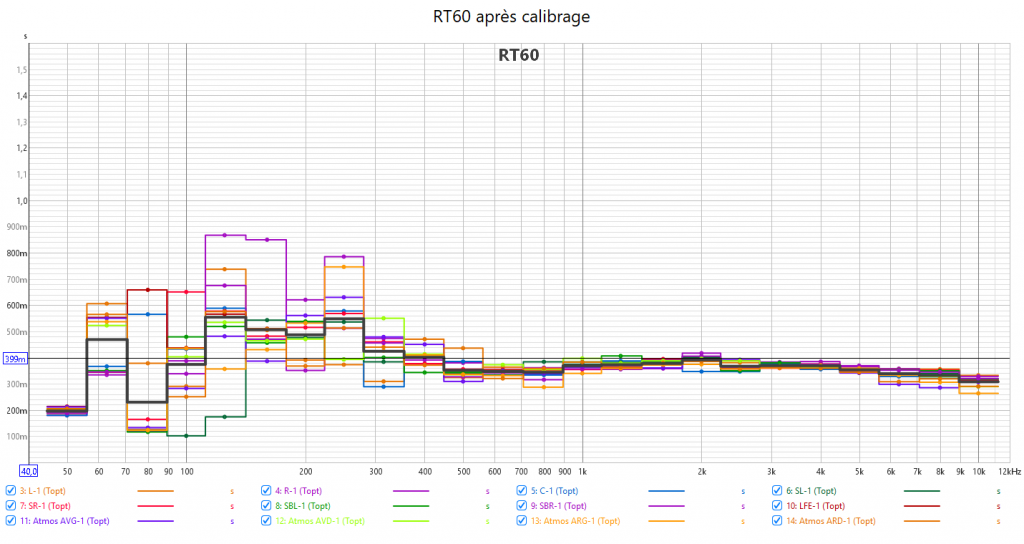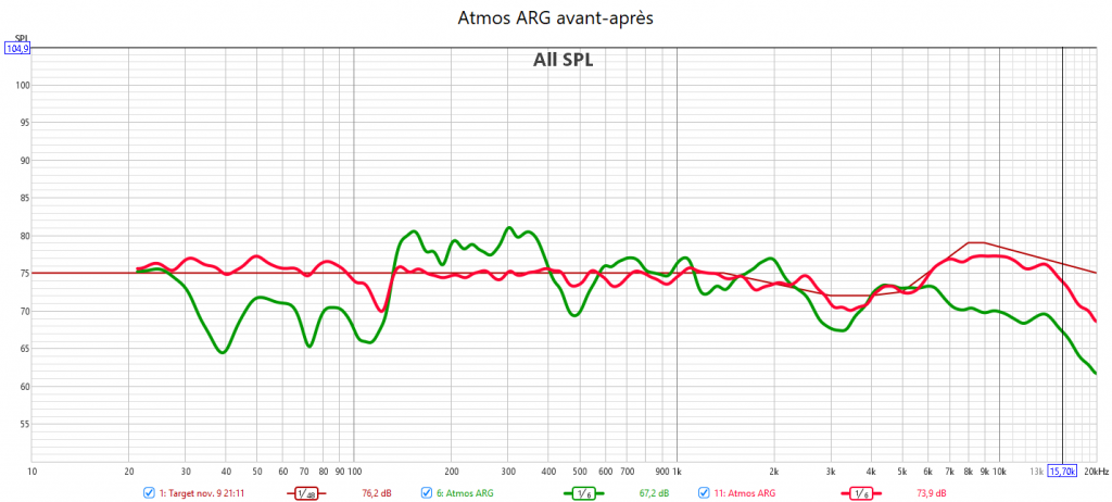Puis nous avons la correction en amplitude des frontales gauche et droite, de la centrale, de la surround gauche et de l’atmos arrière gauche.
