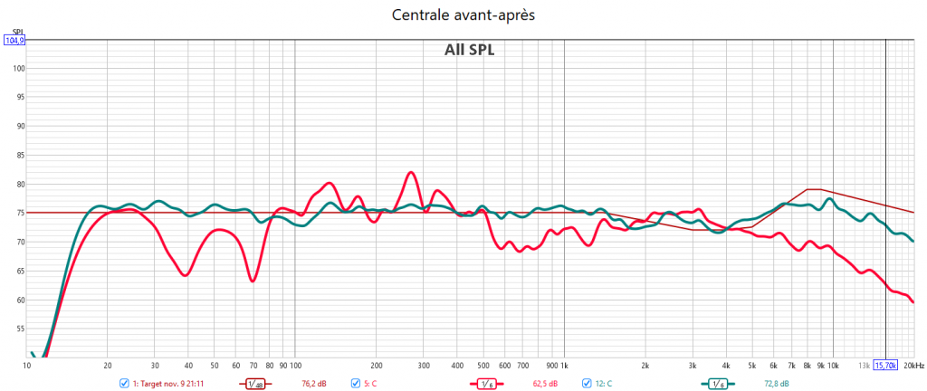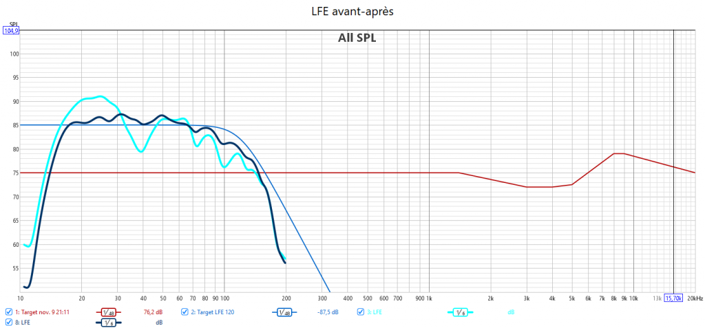 Après calibrage, l’alignement temporel passe sous les 0,5 ms et surtout j’ai pu récupérer presque 20ms de retard sur le LFE avec des crossover optimisés. Le profil des courbes de temps groupes et meilleur qu’avant. Surtout dans le grave.