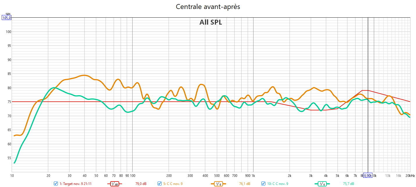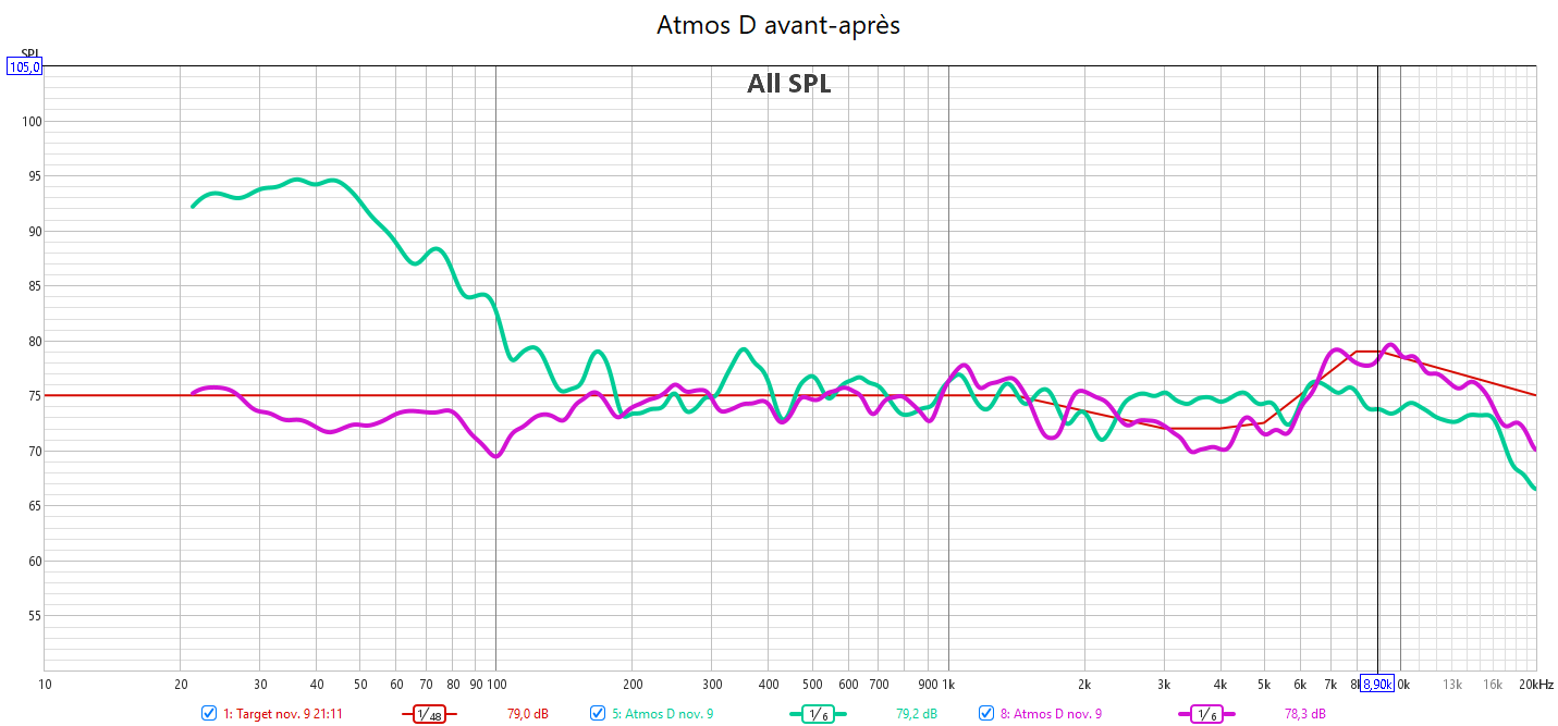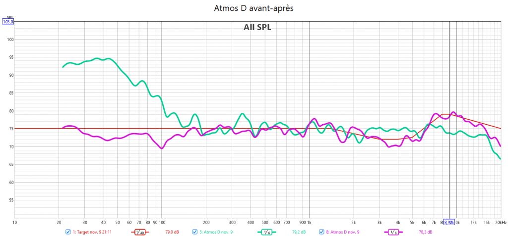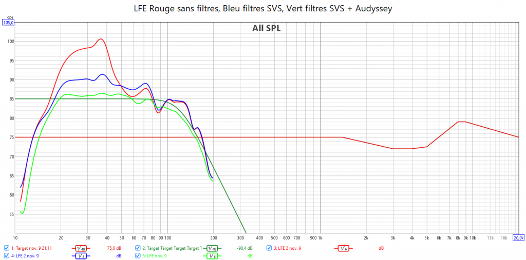 Après calibrage, la réponse naturelle des caissons présentait un boost entre 20 et 50 Hz. J’ai d’abord réduit ce boost (avec les filtres de l’appli SVS) qui gênait Audyssey pour faire de bons correctifs. Au final, on obtient une bonne réponse conforme à la courbe cible à laquelle j’ai ajouté un peu d’infra avec une courbe légèrement montante pour profiter du room gain. La réponse impulsionnelle est aussi améliorée. Le niveau du LFE descend à un niveau plus cohérent pour un rendu équilibré. Le grave ne doit pas passer au-dessus des enceintes. La réponse des autres canaux suit également la nouvelle courbe cible extrapolée des courbes isosoniques pour prendre en compte la sensibilité de l’oreille.