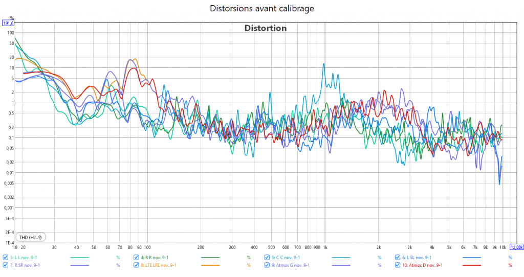 La distorsion avant calibrage montre bien un problème de bass-management entre caissons et enceintes. On constate aussi un excès de distorsion des caissons sous les 40 Hz lié à un niveau bien trop élevé.