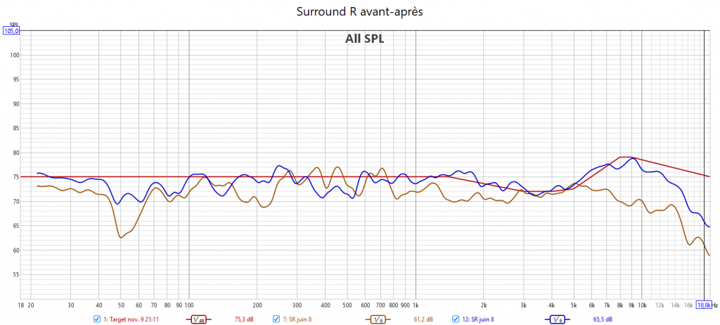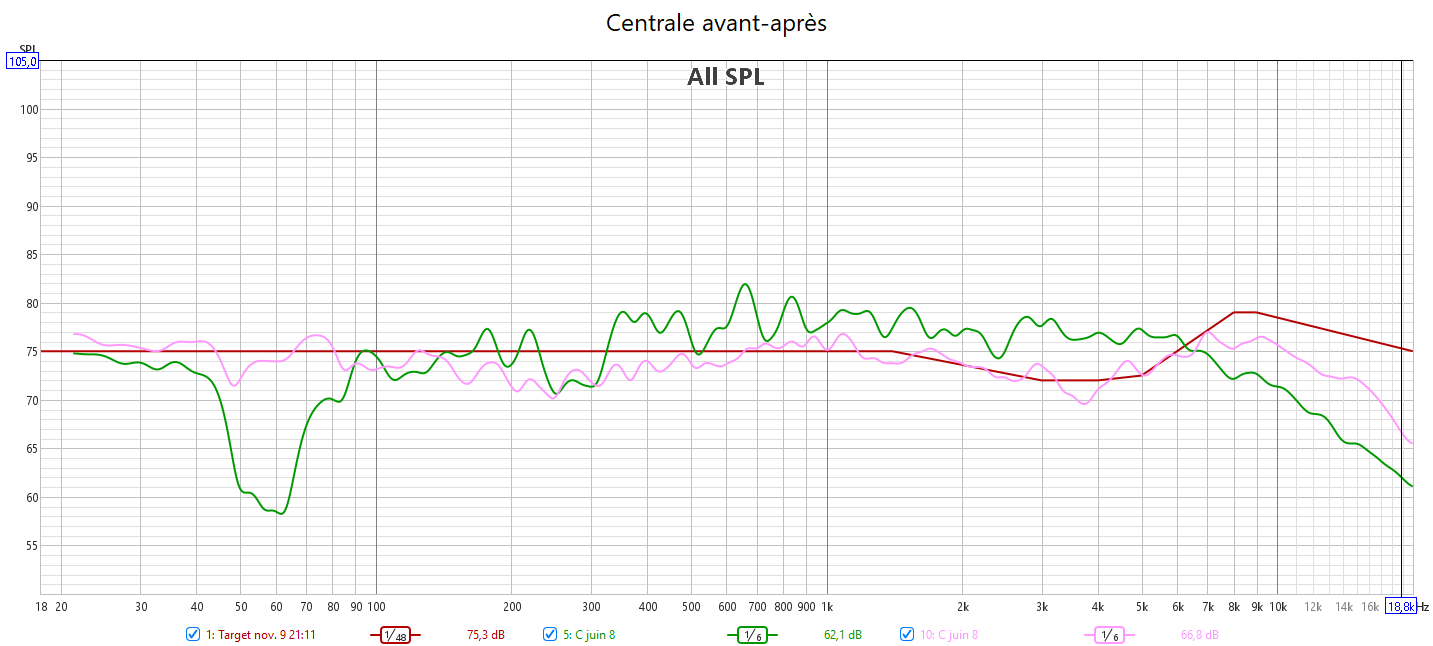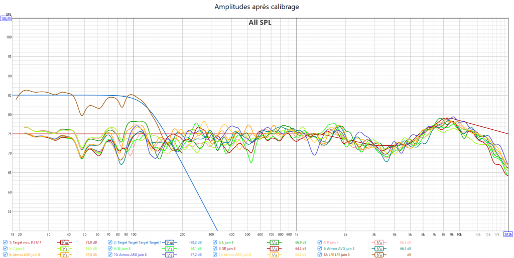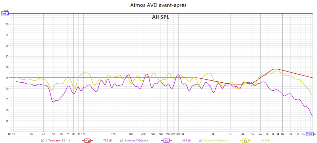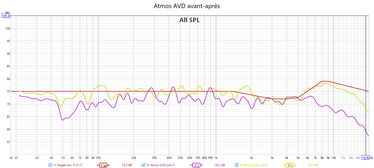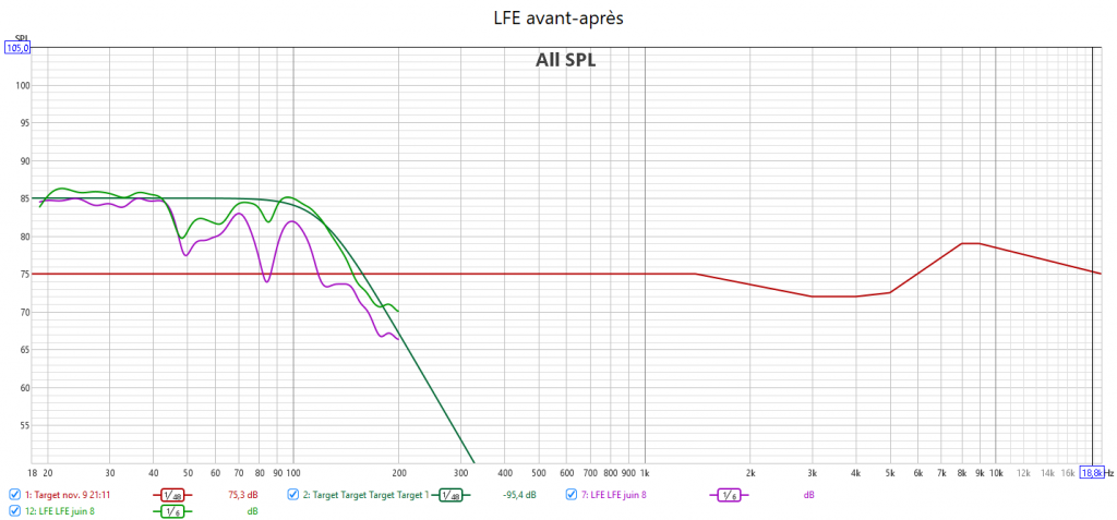 Après calibrage : en préparant la réponse du caisson avec l’appli SVS avant le calibrage Audyssey, la correction est meilleure. J’ai réduit l’infra lié au Room Gain pour qu’Audyssey fasse une meilleure correction. La réponse des enceintes suit la nouvelle courbe cible extrapolée des courbes isosoniques pour prendre en compte la sensibilité de l’oreille : pas d’agressivité tout en gagnant en clarté et en précision. Les niveaux sont mieux ajustés pour une bulle sonore bien équilibrée. J’ai compensé au max le retard de groupe du LFE. La phase aux crossover est bien meilleure qu’avant.