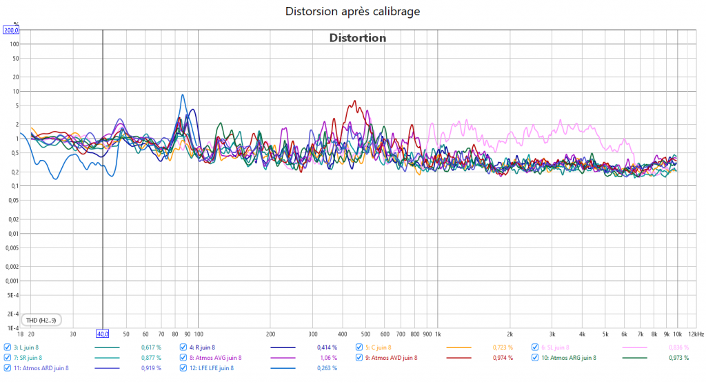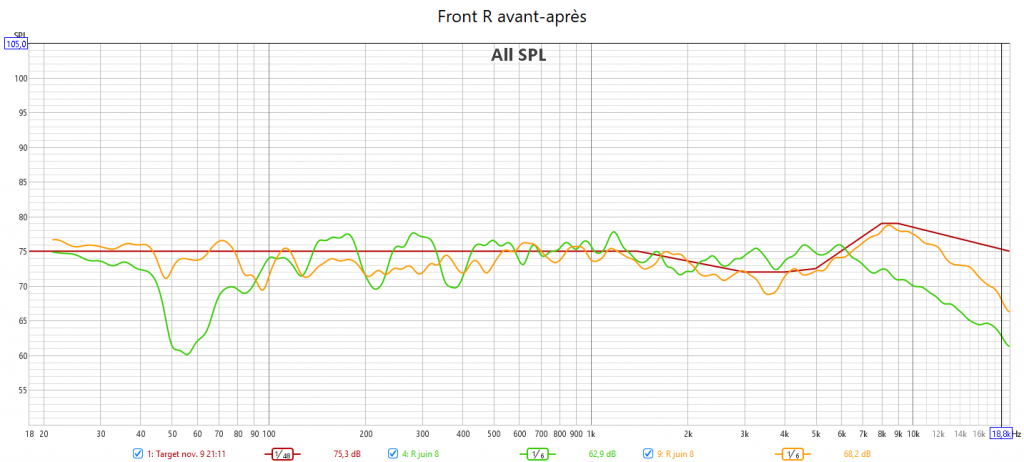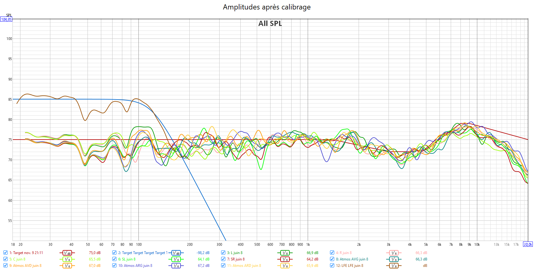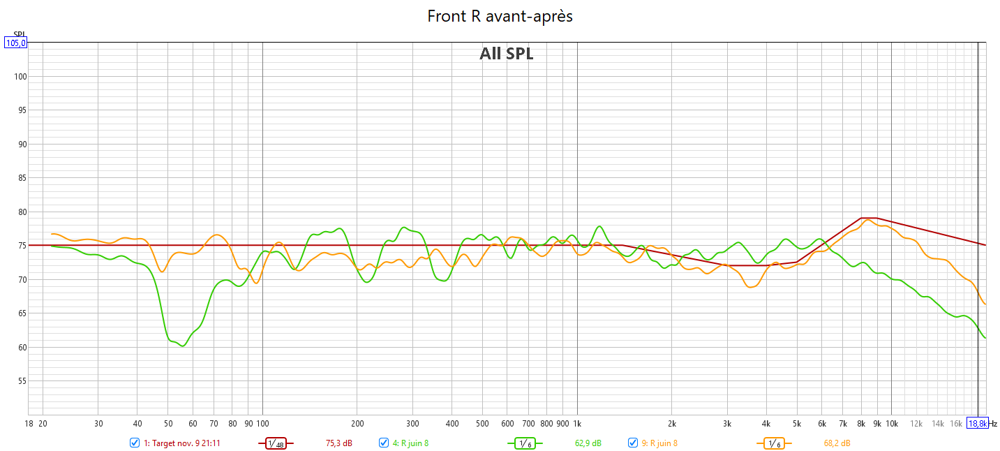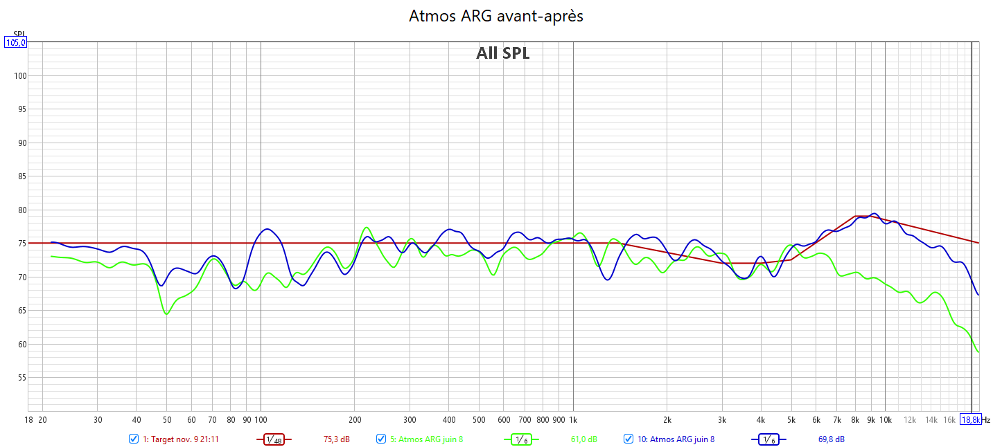 Après calibrage : en préparant la réponse du caisson avec l’appli SVS avant le calibrage Audyssey, la correction est meilleure. J’ai réduit l’infra lié au Room Gain pour qu’Audyssey fasse une meilleure correction. La réponse des enceintes suit la nouvelle courbe cible extrapolée des courbes isosoniques pour prendre en compte la sensibilité de l’oreille : pas d’agressivité tout en gagnant en clarté et en précision. Les niveaux sont mieux ajustés pour une bulle sonore bien équilibrée. J’ai compensé au max le retard de groupe du LFE. La phase aux crossover est bien meilleure qu’avant.