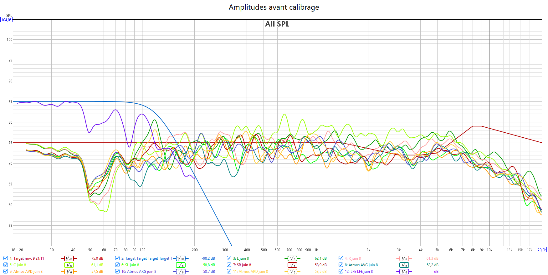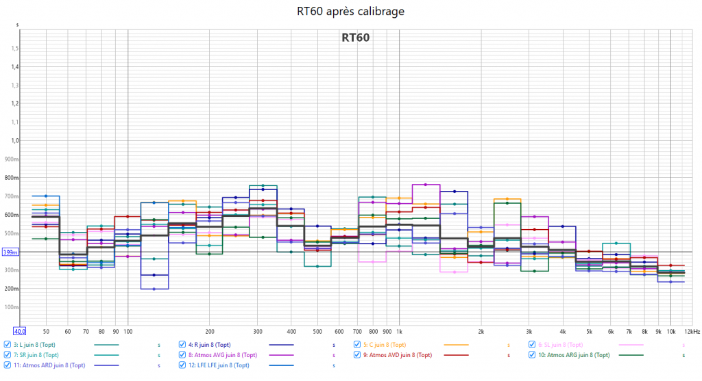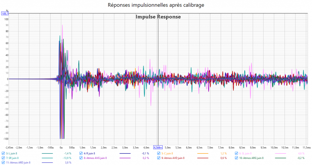 Ci-dessous la correction en amplitude avec Audyssey de la frontale droite, la centrale, la surround droite, l’atmos avant droite, l’atmos arrière gauche et le LFE.